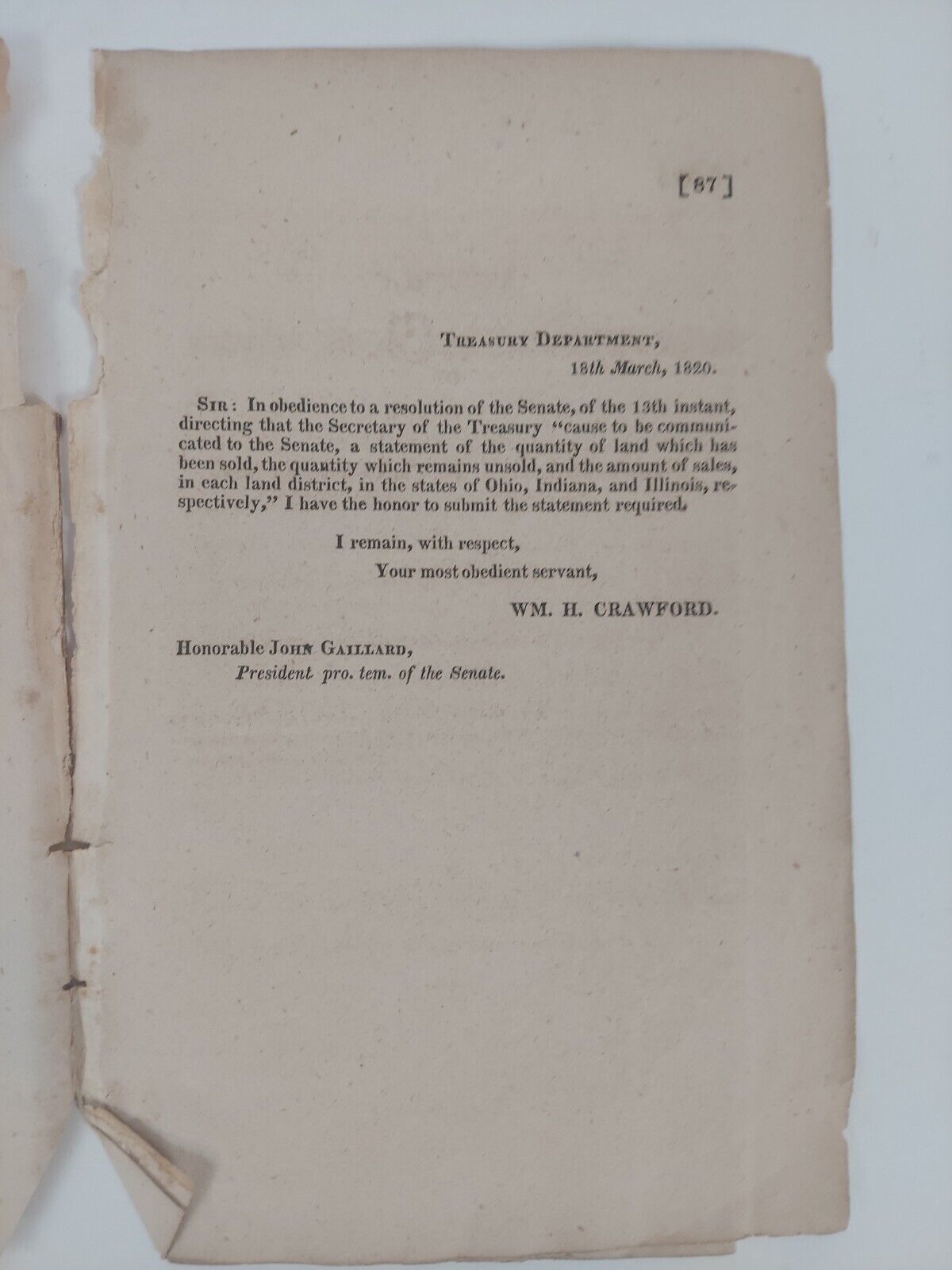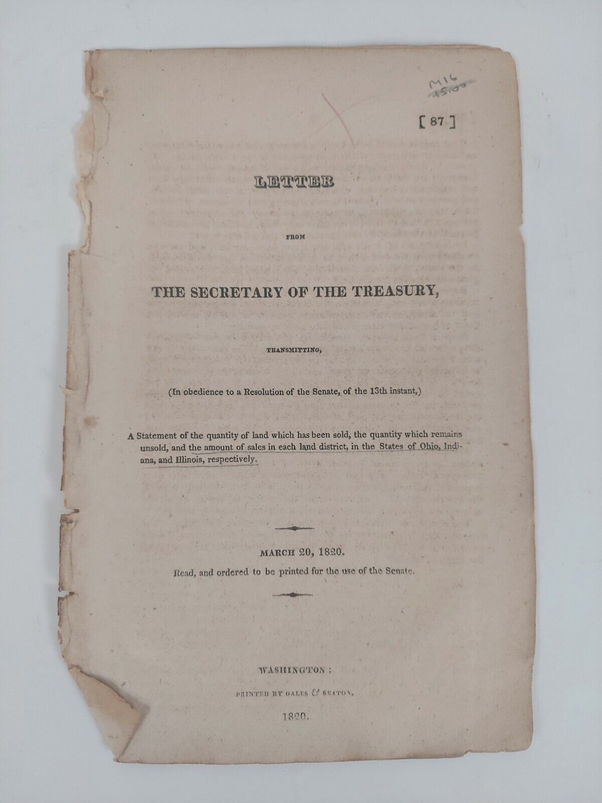 Letter From the Secretary of the Treasury, Transmitting, (in Obedience to a Resolution of the Senate, of the 13th instant,) A Statement of the Quantity of Land Which has been Sold, the Quantity Which Remains Unsold, and the Amount of Sales in Each Land District, in the States of Ohio, Indiana, and Illinois, respectively