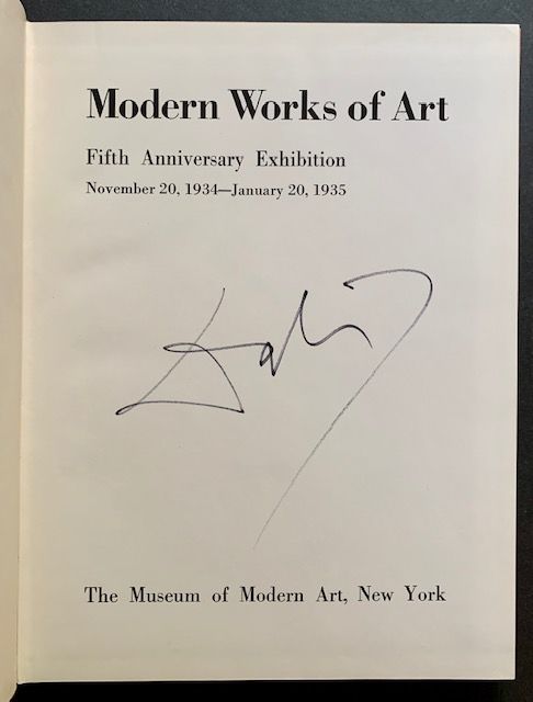 New York: Museum of Modern Art, 1936. Cloth. Near Fine. SIGNED BOLDLY BY SALVADORE DALI (AS SIMPLY "DALI") across the title page. A clean, very sharp copy to boot of the October 1936 stated 2nd --and "emended"-- edition. Tight and Near Fine in its light-brown cloth. Internally immaculate as well, with no writing or markings of any kind, apart from Dali's signature. The catalogue celebrates MoMA's 5th anniversary exhibition, which was held November 20th, 1934 to January 20th, 1935. Originally published in November 1934 in an edition of 2,500 copies and here re-published in its 2nd edition in a limitation of 2,000 copies. THOUGH NOT STATED ANYWHERE IN OR ON THE CATALOGUE, THIS COPY FROM THE PERSONAL LIBRARY OF THE REDOUBTABLE CONTEMPORARY ART CRITIC DORE ASHTON (1928-2017).