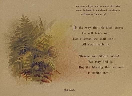 New York: American Tract Society, 1889. Small Hard Cover. Good/No Jacket. Top edge of front board stained, hinges starting. 1889 Small Hard Cover. Unpaginated. Pink and gold endpapers. A selection of verse for every day in the month.