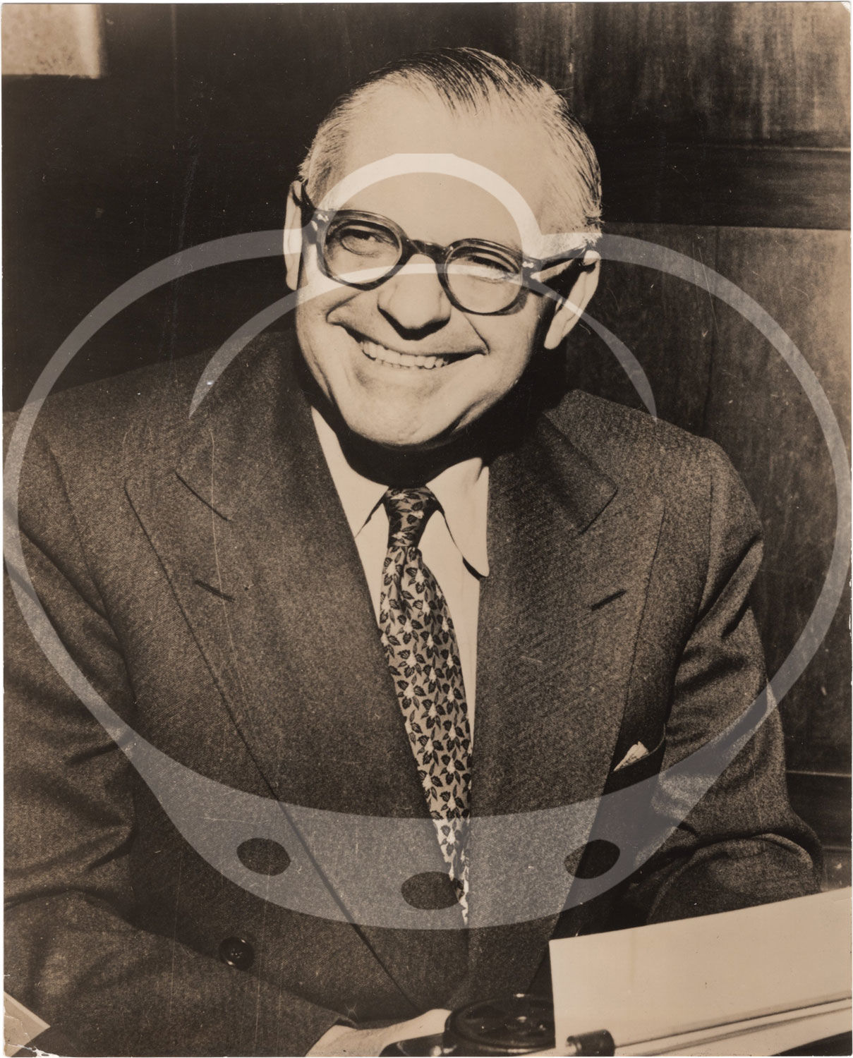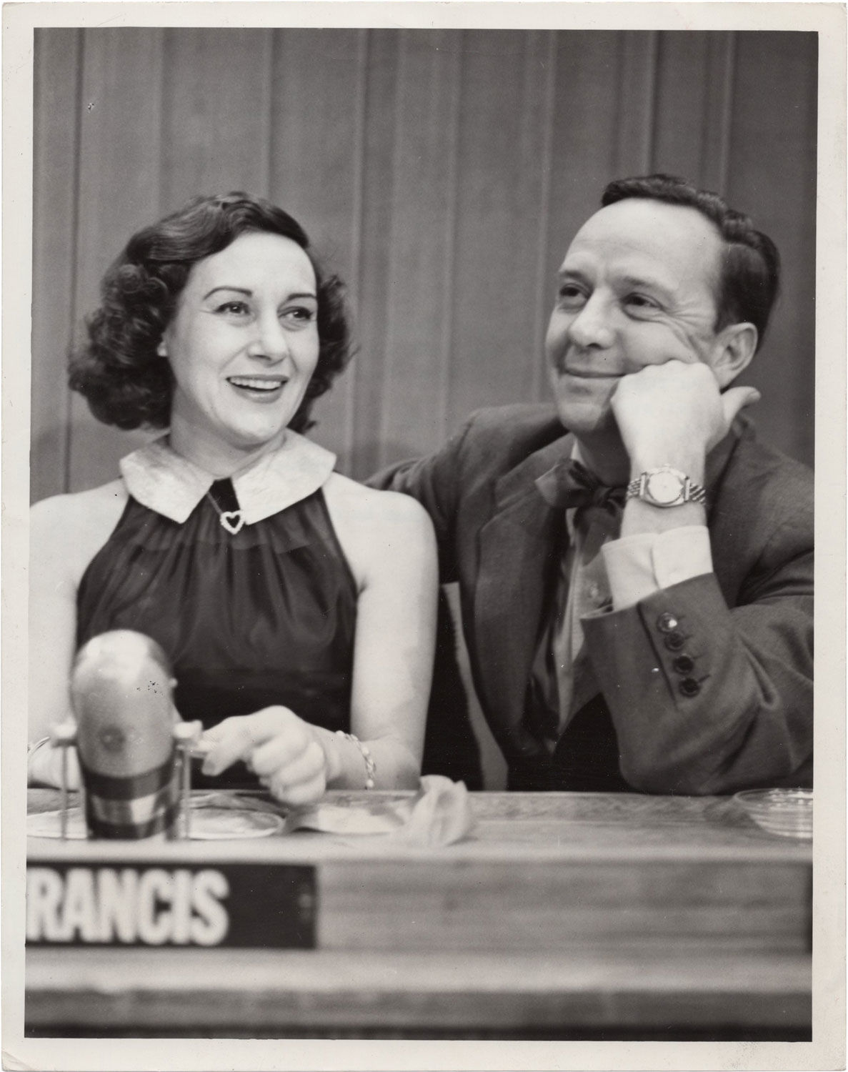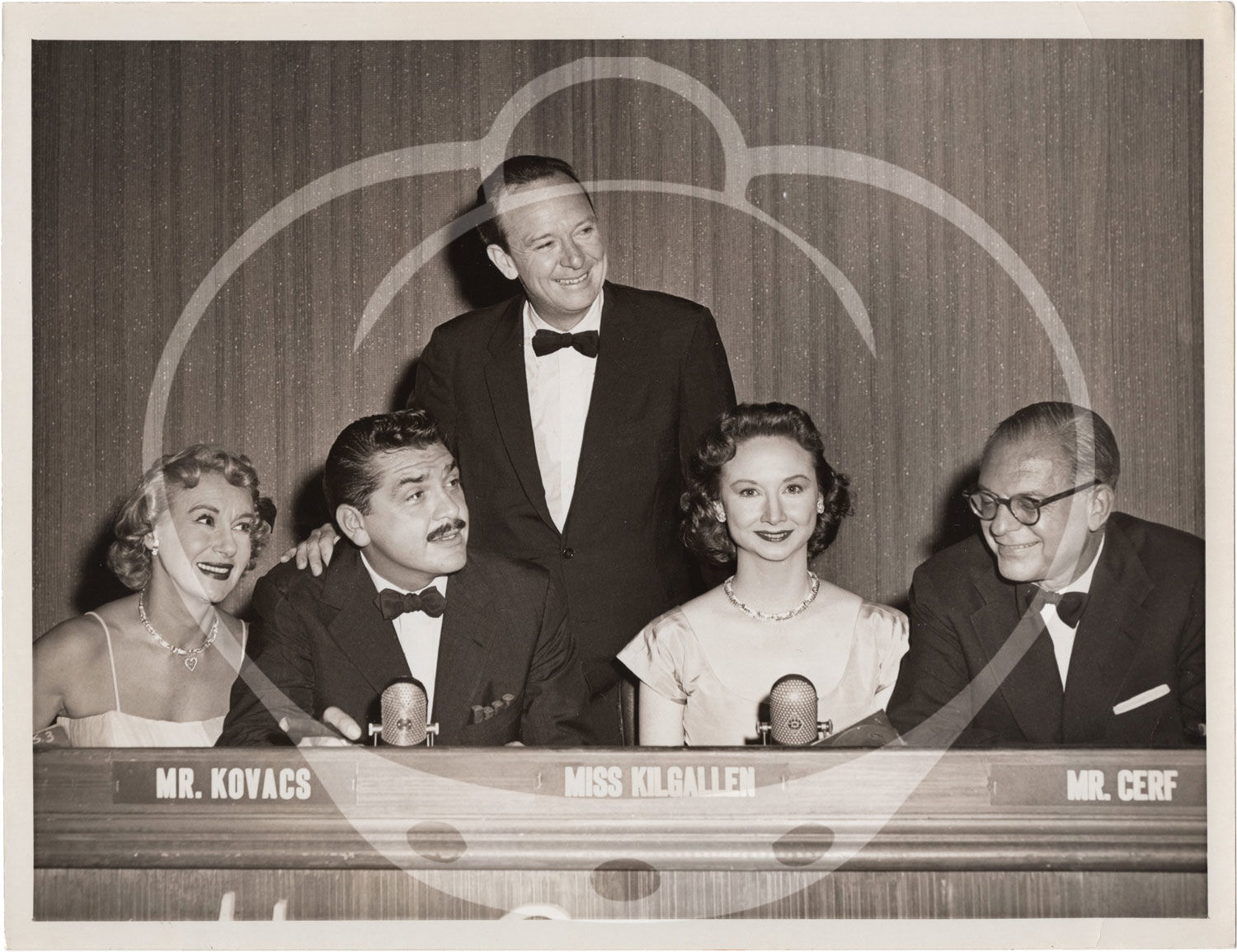 New York: Columbia Broadcasting System [CBS], 1950. Six vintage promotional photographs from the 1950-1967 television series. Collection includes three portrait photographs of Arlene Francis, Dorothy Kilgallen, John Charles Daly, and Bennett Cerf, as well as a photograph of Daly with Arlene Francis, a photograph of Daly, Francis, Cerf, and Kilgallen with guest Ernie Kovacs. Printed mimeo snipes affixed to the versos of five photographs.
