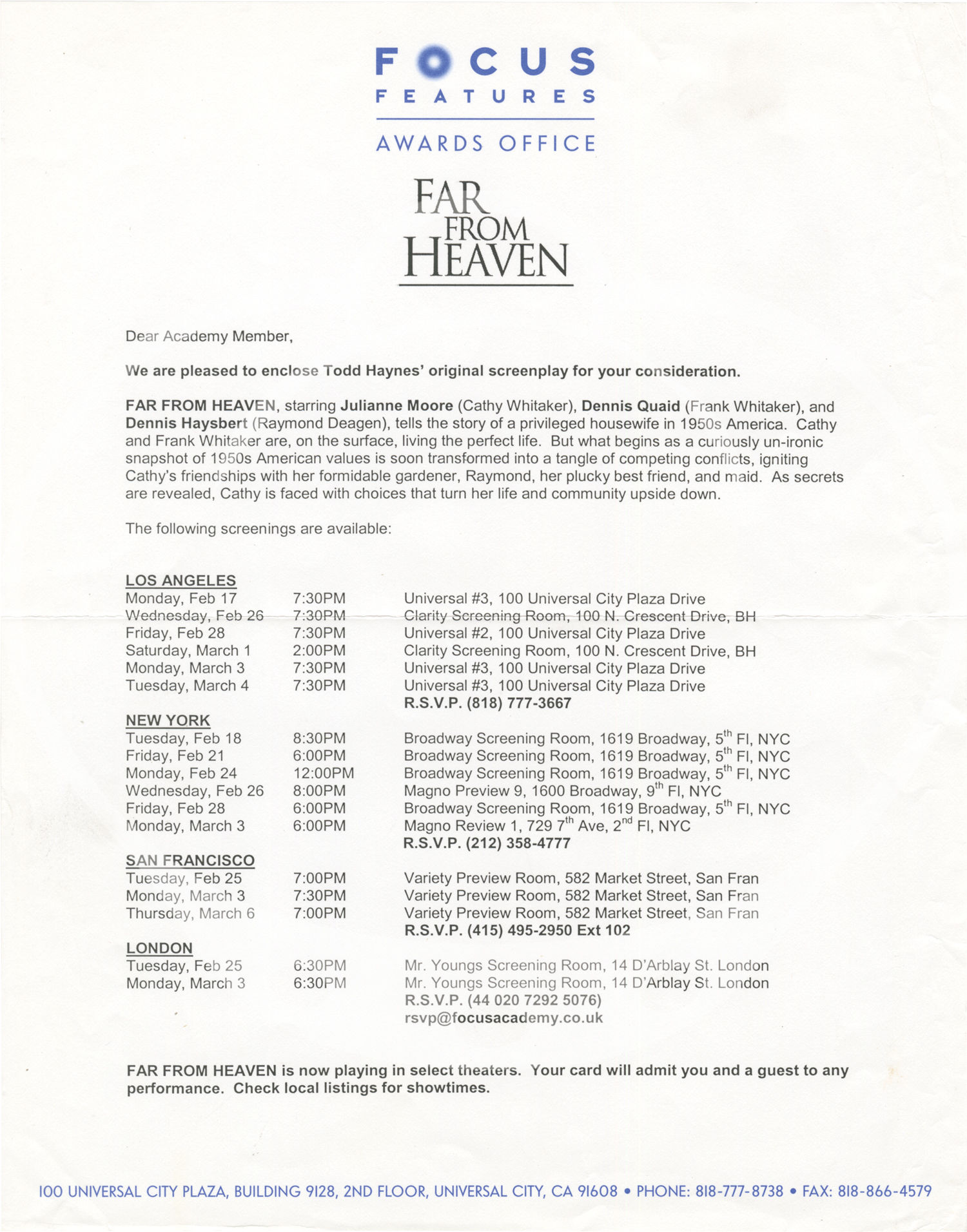 Far From Heaven (For Your Consideration screenplay for the 2002 film)