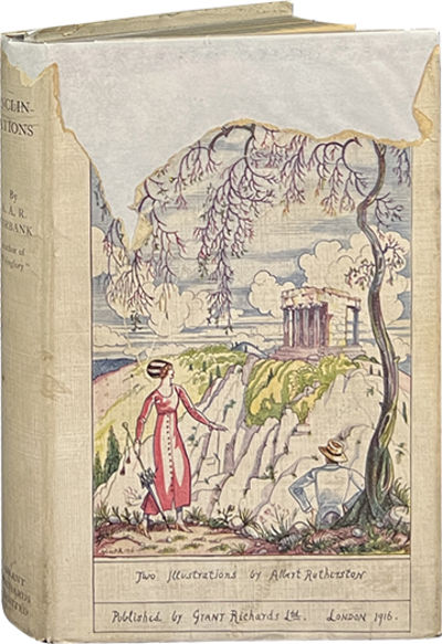 London: Grant Richards Ltd, 1916. First Edition. Hardcover. Very Good/Good. With two illustrations by Albert Rutherston. Very Good in an about Good jacket, unclipped (no price), a large portion of the top of the panel missing. Black buckram with gilt lettering on the spine and front board. Firmly bound with a slight forward lean. Firbank's second published novel, one loosely following a fifteen-year-olds travels to Greece with a chaperone.