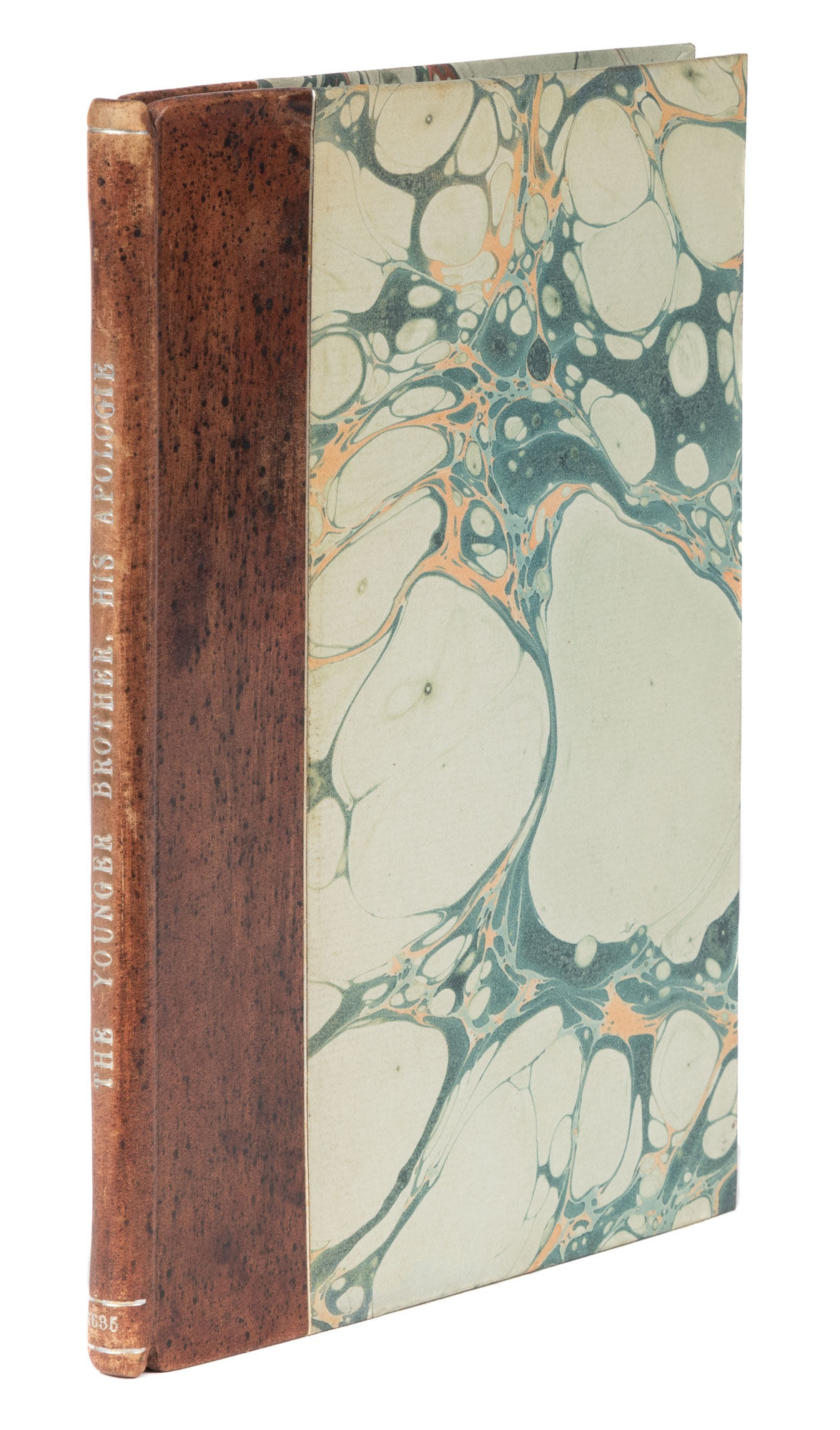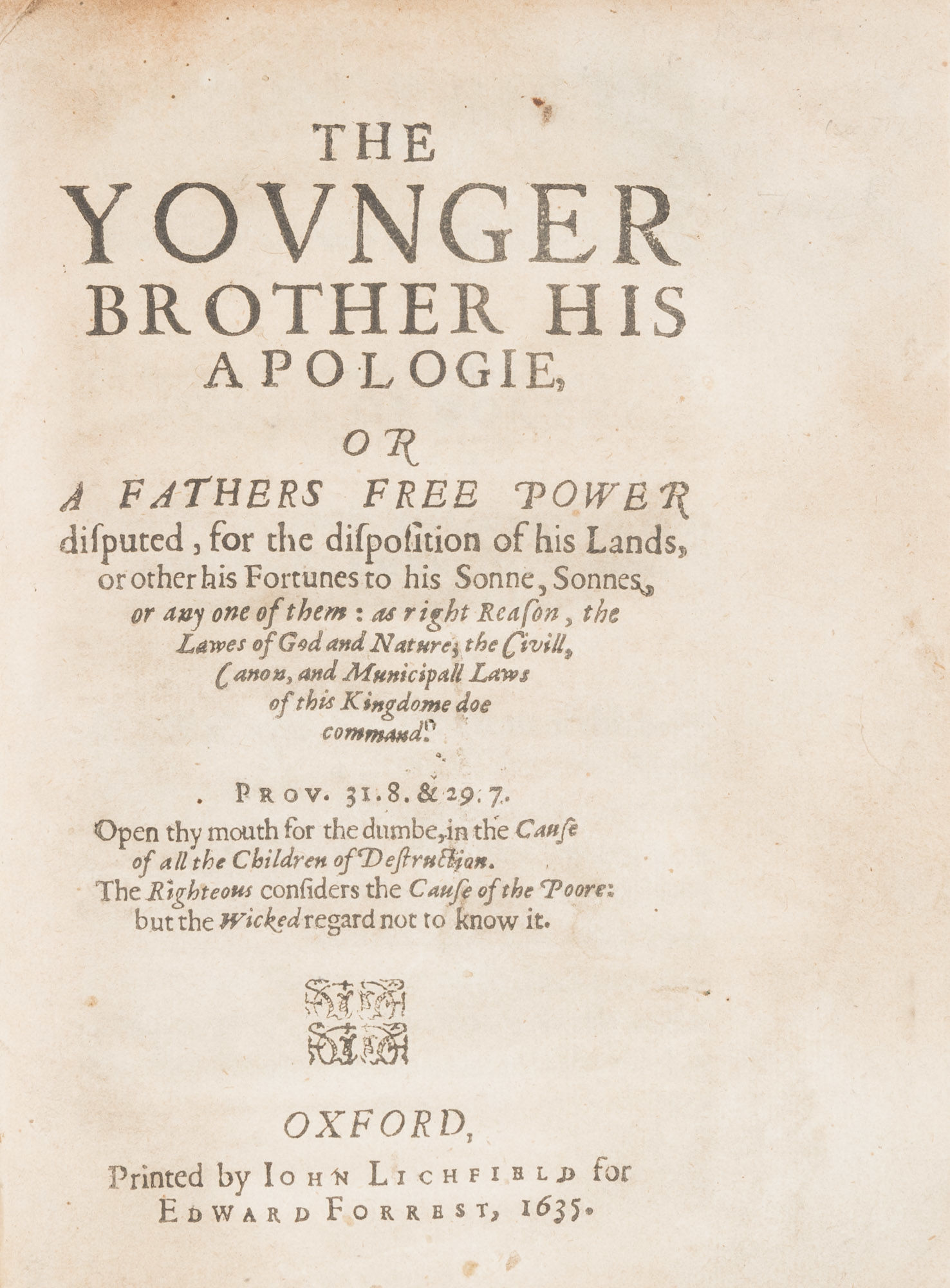 1635. Oxford: Iohn Lichfield for Edward Forrest, 1635.. Oxford: Iohn Lichfield for Edward Forrest, 1635. A Seventeenth-Century Argument Against Primogeniture [Ap-Robert, John]. The Younger Brother His Apologie, Or a Fathers Free Power Disputed, For the Disposition of His Lands, Or Other His Fortunes to His Sonne, Sonnes, Or Any One of Them: As Right Reason, The Lawes of God and Nature, The Civill, Canon, And Municipall Laws of this Kingdome doe Command. Oxford: Printed by Iohn Lichfield for Edward Forrest, 1635. [x], 56, [2] pp. Quarto (7" x 5-1/4"). Stab-stitched pamphlet bound into recent quarter calf over marbled boards, gilt title to spine, endpapers renewed. Moderate toning to interior, light soiling to title page and upper outside corners of a few leaves. $500. * Third issue. First published in 1618 with a title beginning The Yonger Brother His Apology by It Selfe, this pamphlet argues that the law of primogeniture may be overruled due to a father's desire or family circumstances. The final issue was published in 1671. Like many copies of the 1634 issue, the date on the title page has a correction in a contemporary hand. All issues are scarce. OCLC locates 5 copies of the 1634 issue in North American law libraries (Harvard, Library of Congress, San Francisco Law Library, University of Minnesota, Yale). English Short-Title Catalogue S100213.