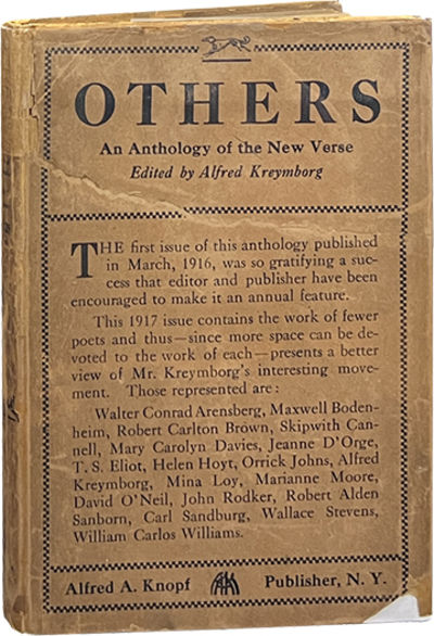 New York: Alfred A. Knopf, 1917. First Edition. Hardcover. Very Good/Good. Very Good in a Good jacket, unclipped ($1.25 on the spine), generally toned and soiled, multiple chips, a large closed tear on the front panel, a two-inch kraft paper repair at the head of the spine and multiple reinforcements on the verso. Orange paper on the boards, toned and bumped at the edges. Square, bound with some reading wear, clean internally. The third issue of this anthology featuring poetry from thirty-five writers like T.S. Eliot, Mina Loy, Marianne Moore, Wallace Stevens, William Carlos Williams, among others.