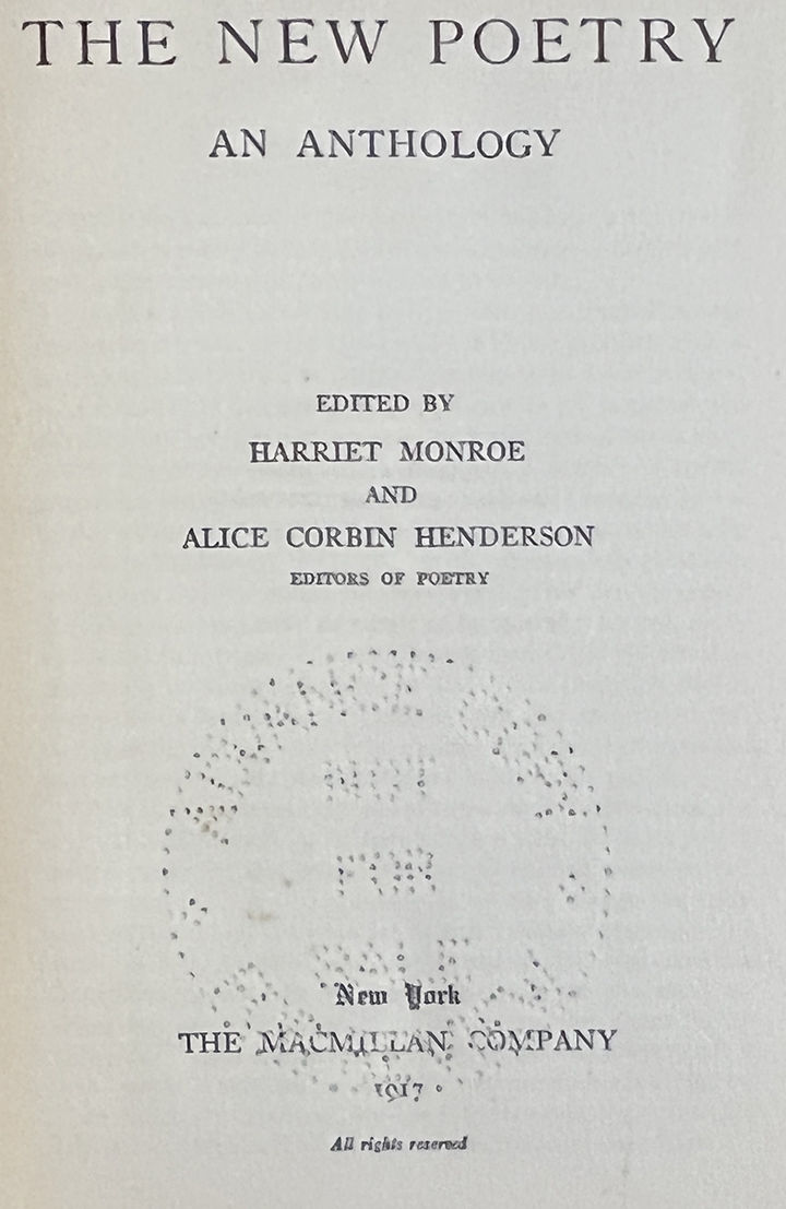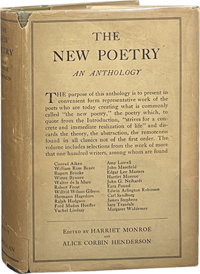 New York: Macmillan, 1917. First Edition. Hardcover. Near Fine/Very Good. Review Copy. Near Fine in a Very Good jacket, unclipped ($1.75 on spine), generally toned, some shallows chips and closed tears. Green buckram, faded at the edges, with gilt lettering on the spine and front board. Square and firmly bound, some stains at the endpapers, perforated "Not for sale | review copy" on the title page, clean otherwise. An important anthology of early 20th century poetry from the likes of Aiken, Brooke, Frost, Lindsay, Lowell, Pound, Sandburg, Stevens, H.D., Millay, Masters, among others.