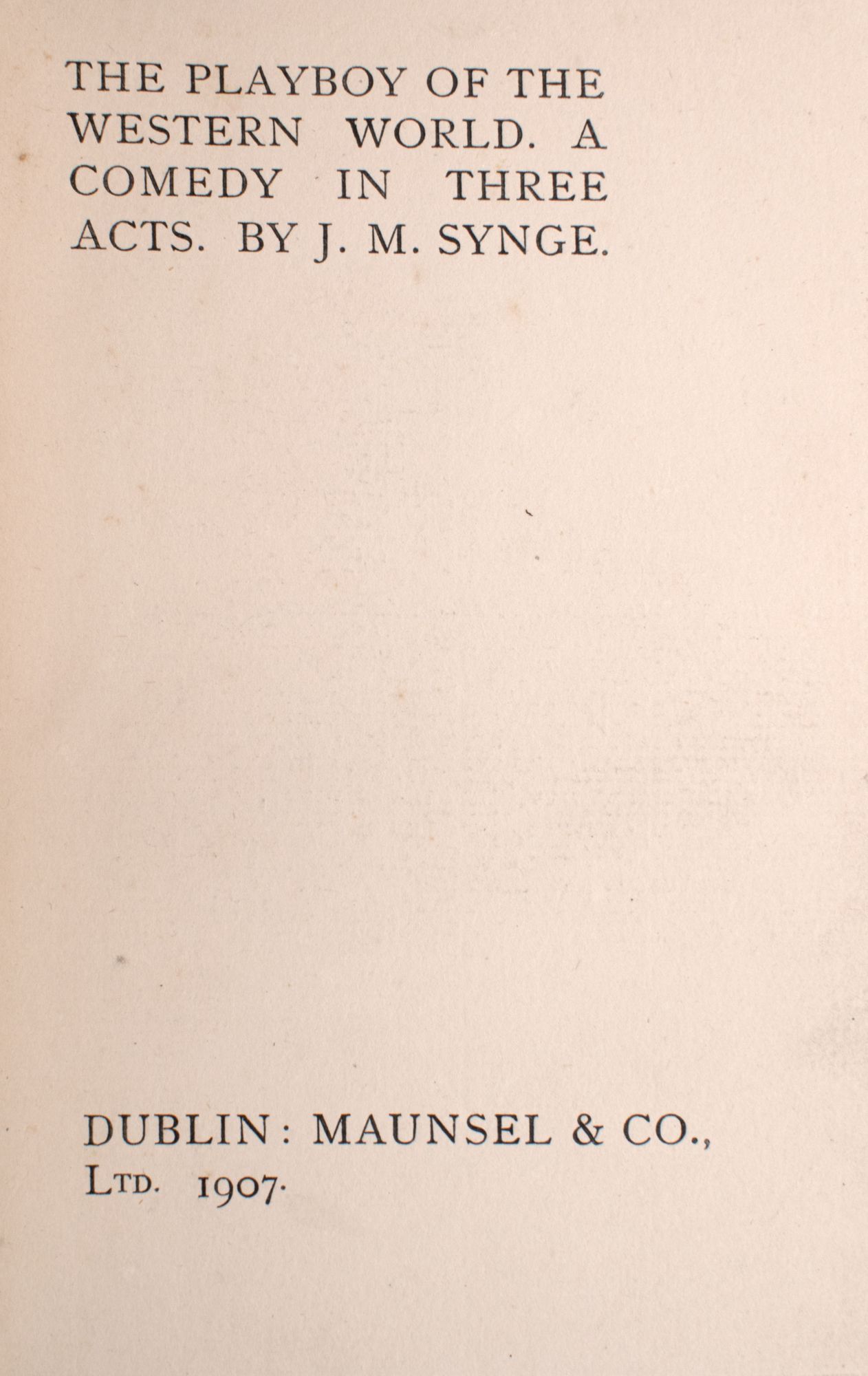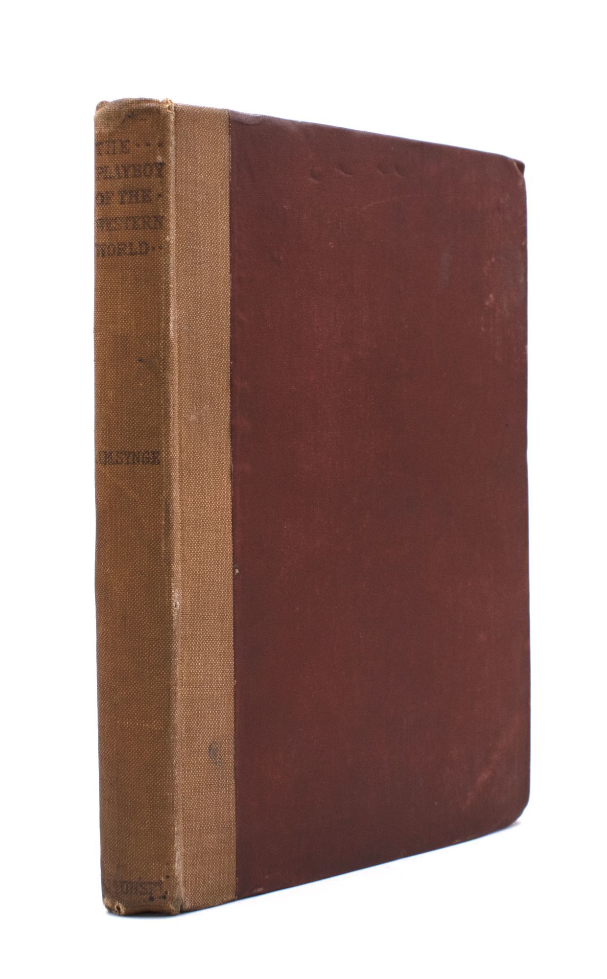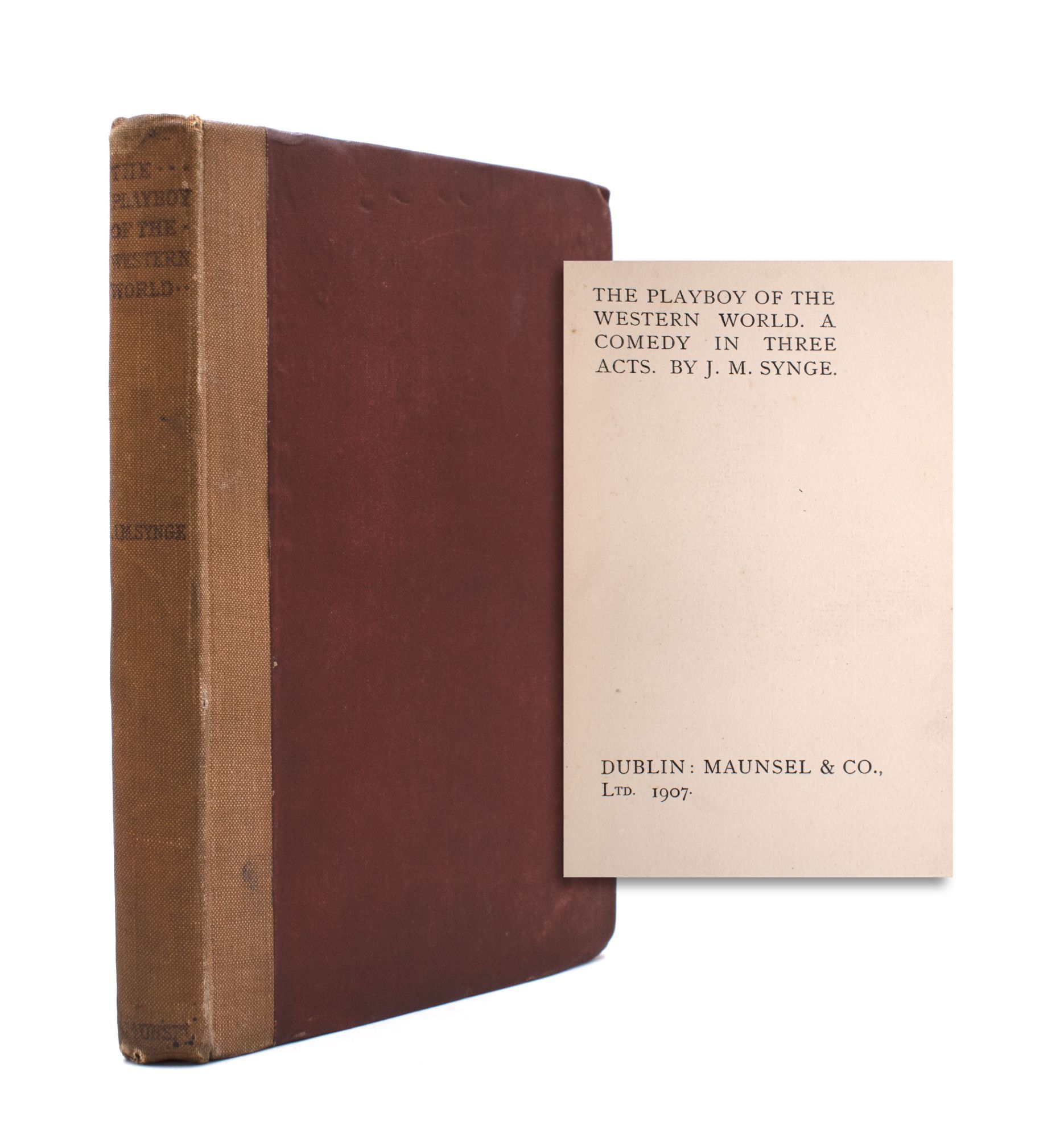 Dublin: Maunsel & Co, 1907. First edition. Frontisepiece portrait "Synge at Rehearsal / WB Yeats Jan 25 - 1907"; viii, 86, 4 pp. ads. 8vo. Red cloth covered boards with tan cloth spine with red lettering, lean to spine, some soiling and rubbing around the edges, very good; ownership signature to verso of frontispiece; pages 6-7 are toned from the laid-in clipped photograph from a 1934 newspaper with Arthur Shields as Chiristy Mahon and a clipping from a 1927 Davis & Orioli catalogue with this title and Synge's The Aran Islands underlined. First edition. Frontisepiece portrait "Synge at Rehearsal / WB Yeats Jan 25 - 1907"; viii, 86, 4 pp. ads. 8vo. The play that caused a riot at its premier at Dublin's Abbey Theatre on 26 January 1907 (and continued to do so while on tour in the United States starting in 1911, even after the offending lines had been excised). The lines that caused such a scandal are found on page 80: "It's Pegeen I'm seeking only and what'd I care if you brought me a drift of chosen females, standing in their shifts itself".