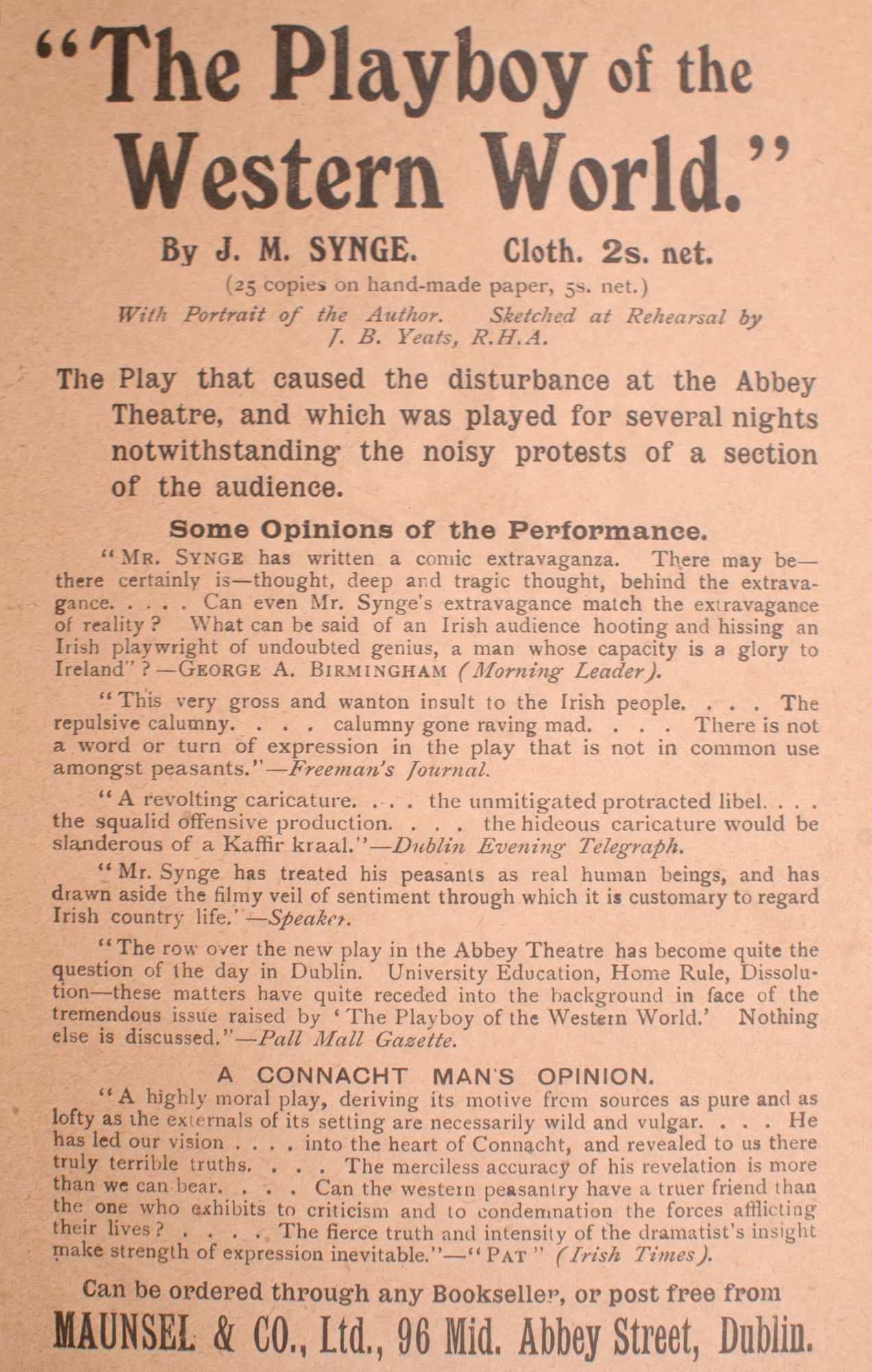 - Frontisepiece portrait "Synge at Rehearsal / WB Yeats Jan 25 - 1907"; viii, 86, 4 pp. ads. 8vo