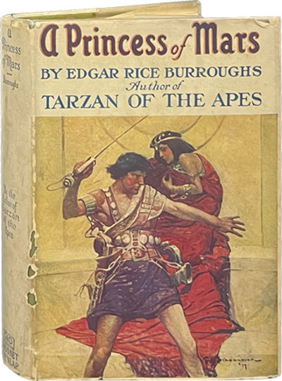 New York: Grosset and Dunlap. Hardcover. Very Good/Very Good. Illustrated by Frank E. Schoonover. Reprint Edition. Very Good in an about Very Good jacket, unclipped (no price), generally toned, a few small chips at the edges, three holes at the front panel fold. Green buckram, some fading at the edges, with red ink lettering on the spine and front board. Square and firmly bound, some foxing at the edges. The first novel in Burroughs's Barsoom series, which tells the story of American John Carter and his adventures on Mars. Though this is a Grosset & Dunlap reprint, jacketed copies are still relatively scarce.