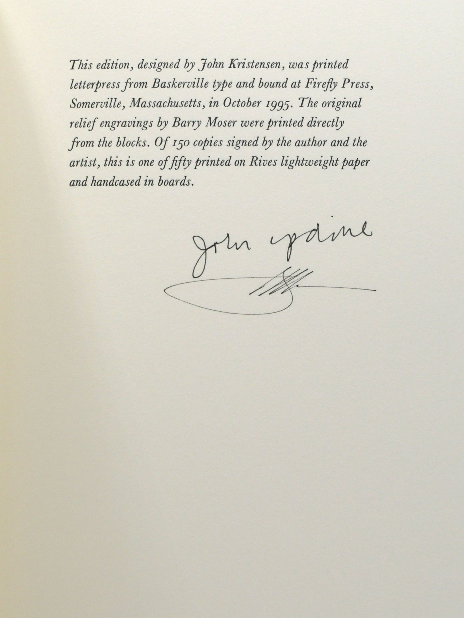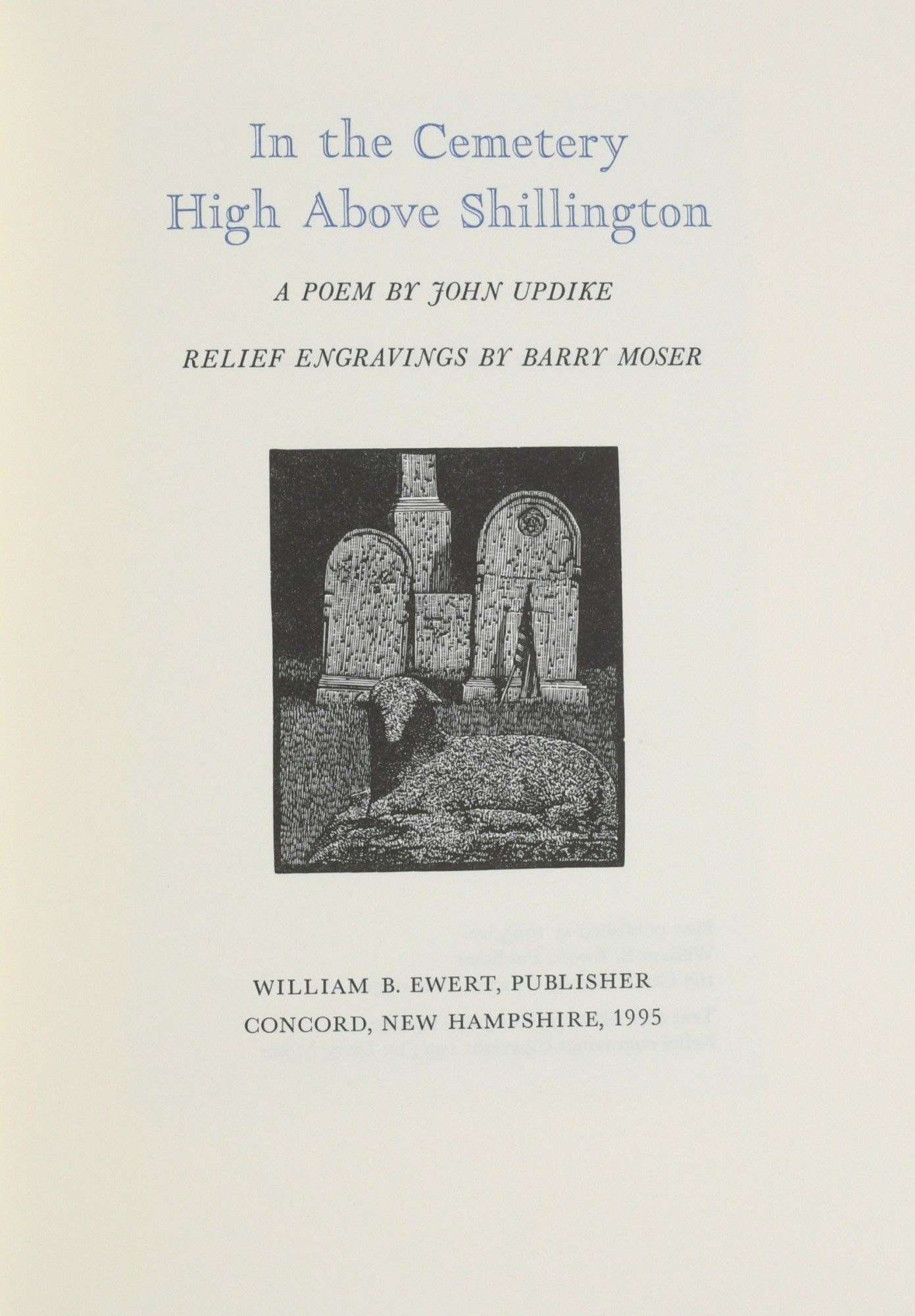 Concord, New Hampshire: William B. Ewart, Publisher, 1995. Limited Edition. Hard Cover. Fine binding. Quarto (10 1/4" x 7 1/4"); in printed blue laid-paper covered boards, backed in navy blue cloth; [16] pages, with illustrations by Barry Moser; with title page printed in blue and in black: limited to 50 copies, signed by Mr. Updike and illustrator Barry Moser.~~From the colophon: "The edition, designed by John Kristensen, was a printed letterpress from Baskerville type, and bound at Firefly Press, Somerville, Massachusetts, in October 1995. The original relief engravings by Barry Moser were printed directly from the blocks. Of 150 copies signed by the author and the artist, this is one of fifty printed on Rives lightweight paper and handcased in boards."~~Shillington was Mr. Updike's childhood home town. Fine binding.