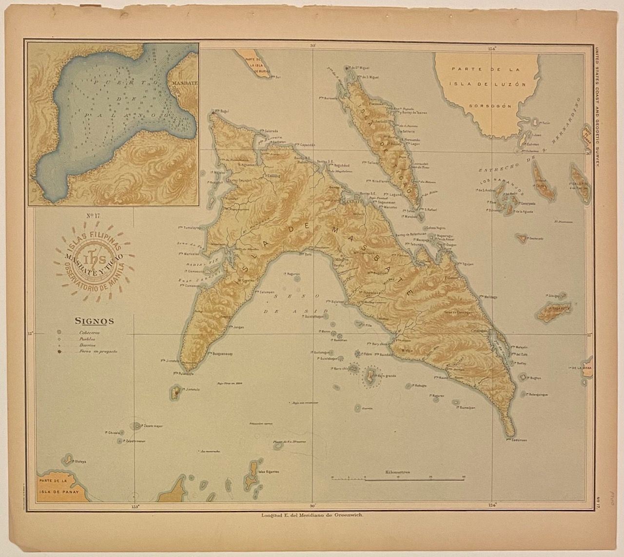 This map depicting the islands of Masbate and Ticao was originally prepared as part of a series made by the Manila Observatory of the Jesuits in 1899. Led by director P. Jose Algue, the Observatory employed only native Philippine draftsmen to complete the technical work required for the project. Upon learning of the Jesuits' undertaking, the U.S. Coast and Geodetic Survey entered into cooperation with the Observatory to produce a comprehensive atlas of the Philippine archipelago. The 30 maps were then brought to the U.S., redrawn slightly with regards to scale and projection, and published by the Survey in 1900 as the "Atlas of the Philippine Islands," the third edition in a series of special publications. This unique combination of American command and a wholly Spaniard or Filipino staff made the Observatory a rare example of cooperation during the period of the Philippine-American War, which continued from 1898 to 1902. Furthermore, the project is significant in its own right given the historic difficulty of mapping the islands, owing in particular to constant disputes between the warring imperial powers of Spain and Portugal. As the superintendent of the Survey describes in the atlas's introduction, the Jesuits spared no pains in securing all available data, and verified them by consultation with members of other religious orders, as well as with old residents, travels, and explorers.