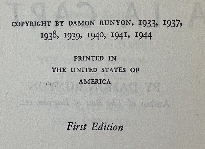 Philadelphia: J.B. Lippincott Company, 1944. First Edition. Hardcover. Near Fine/Good. Near Fine in a Good jacket, clipped, generally rubbed and worn, chips at the edges, closed tears throughout. Grey buckram, bumped at the corners, with red ink lettering on the spine and front board. Square and firmly bound with a red top stain, lengthy gift inscription on the front endpaper, clean otherwise. A collection of Runyon's stories "of his daffy dolls of Broadway and slightly goofy guys to whom a horse is a line of type in the Racing Form.