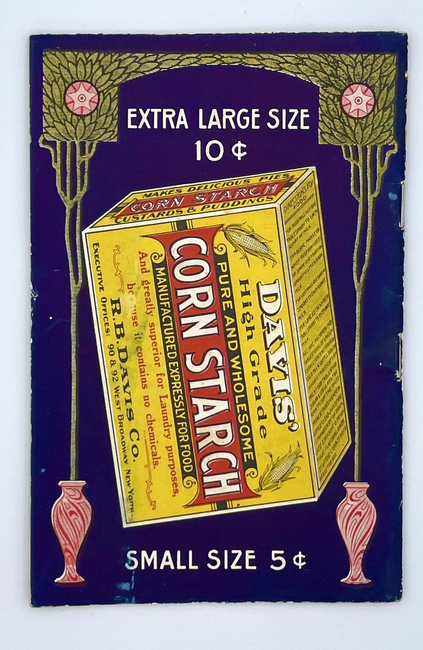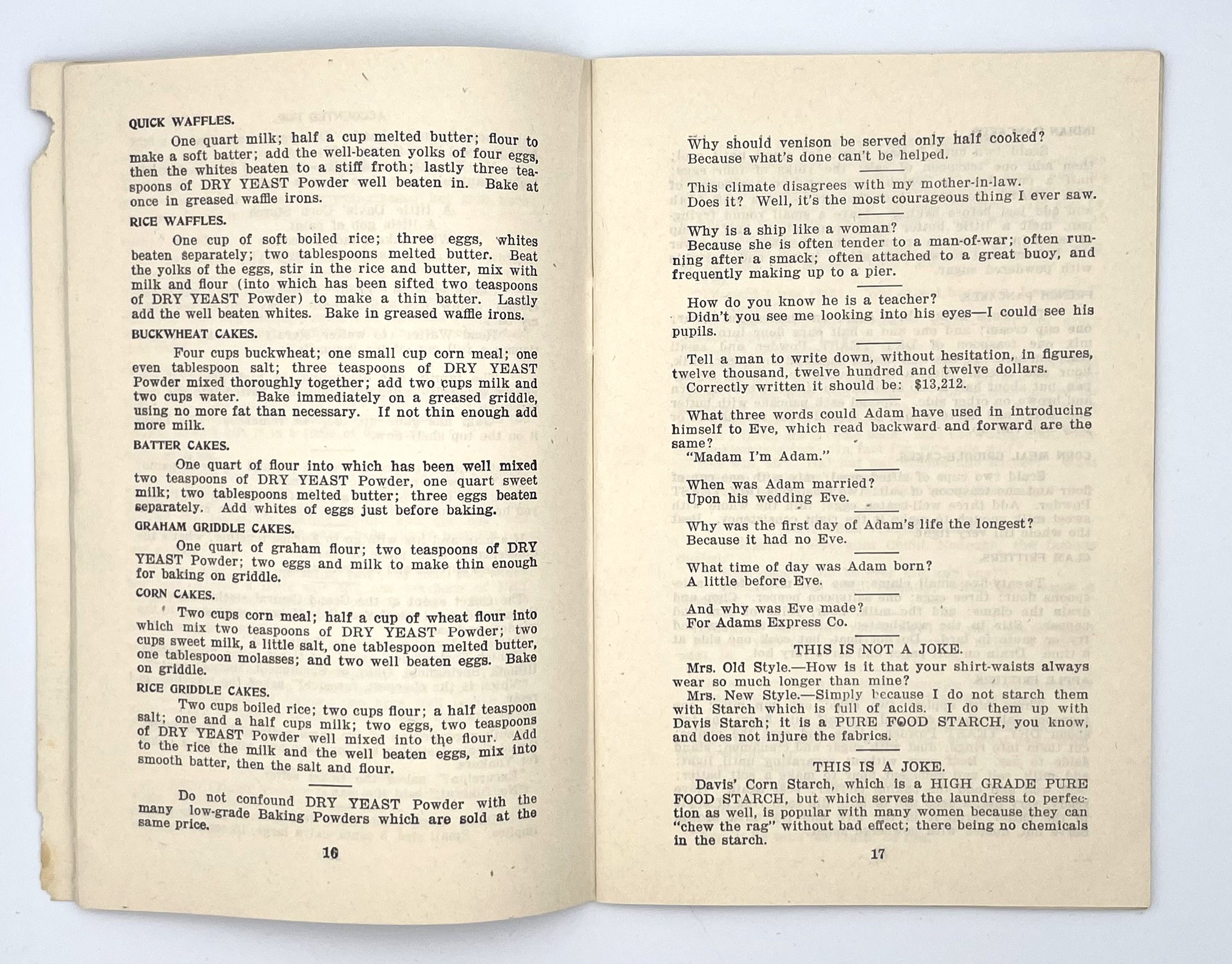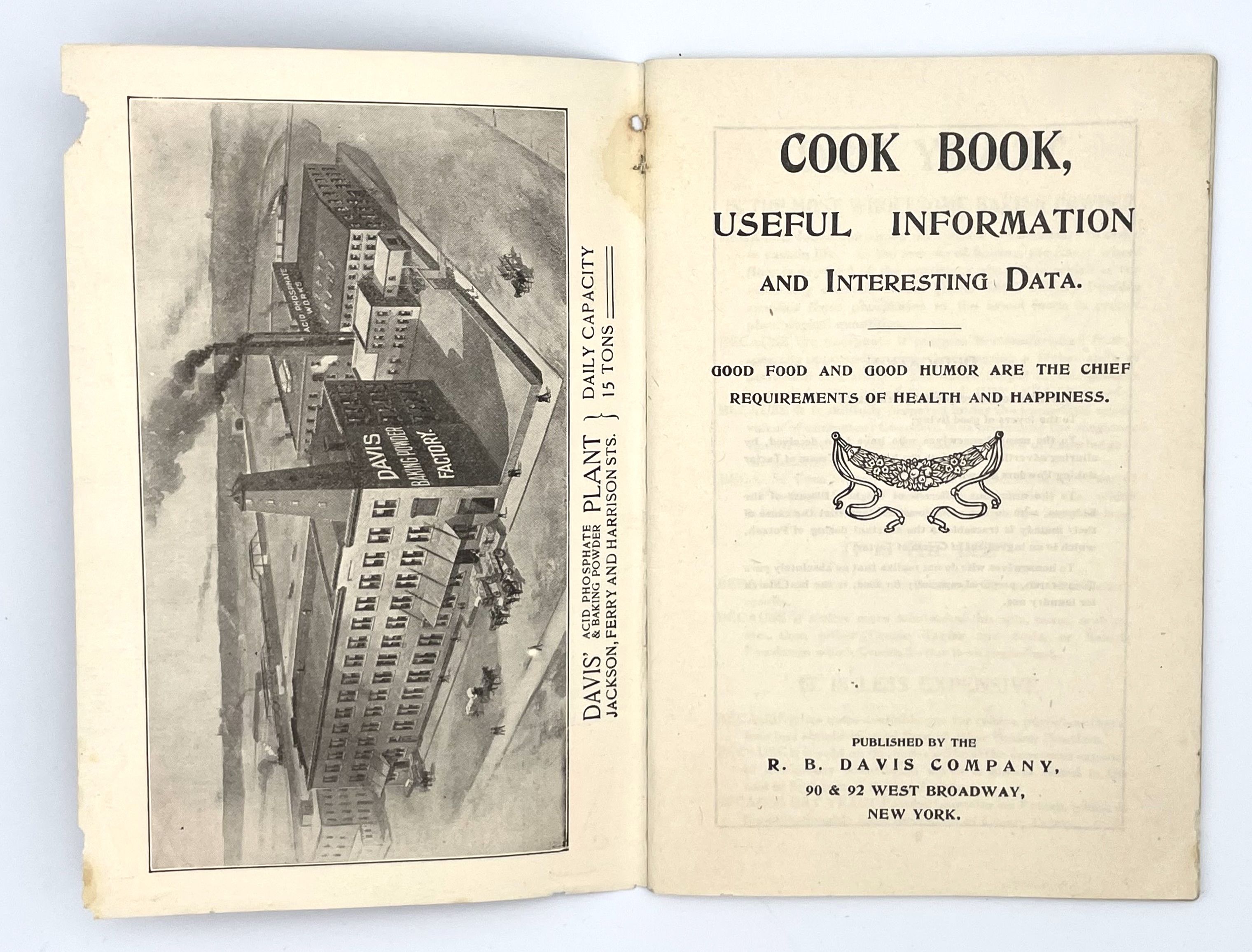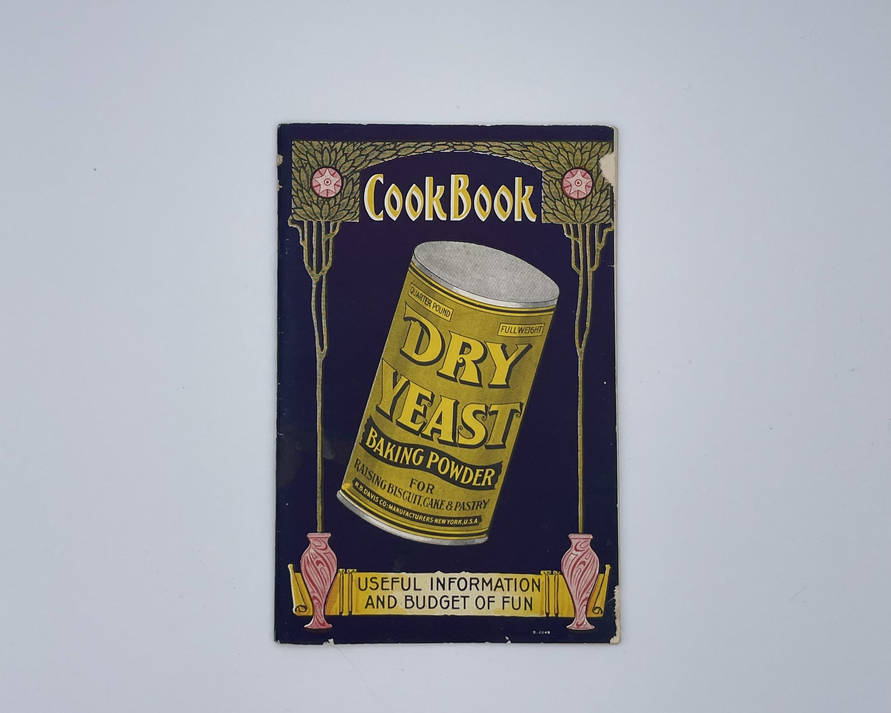 Hoboken, NJ: R.B. Davis Company, 1904. Staplebound. Dark blue illustrated wraps. Very good. 64 pages, 17 x 11.5 cm. The R.B. Davis Manufacturings Dry Yeast Baking Powder Cookbook begins with a dedication to housewives who have been misled into a purchase of Baking Powder with Cream of Tartar and to those sufferers of Brights Disease which they attribute to this same substance. The booklet is a combination jokebook, cookbook, advertisement for the Dry Yeast Baking Powder. It has a selection of jokes, alternating with its simple recipes for sponge cake and roast beef for the average homemaker. 1 cm chip on front cover, some rubbing at corners and spine, otherwise crisp and clear.