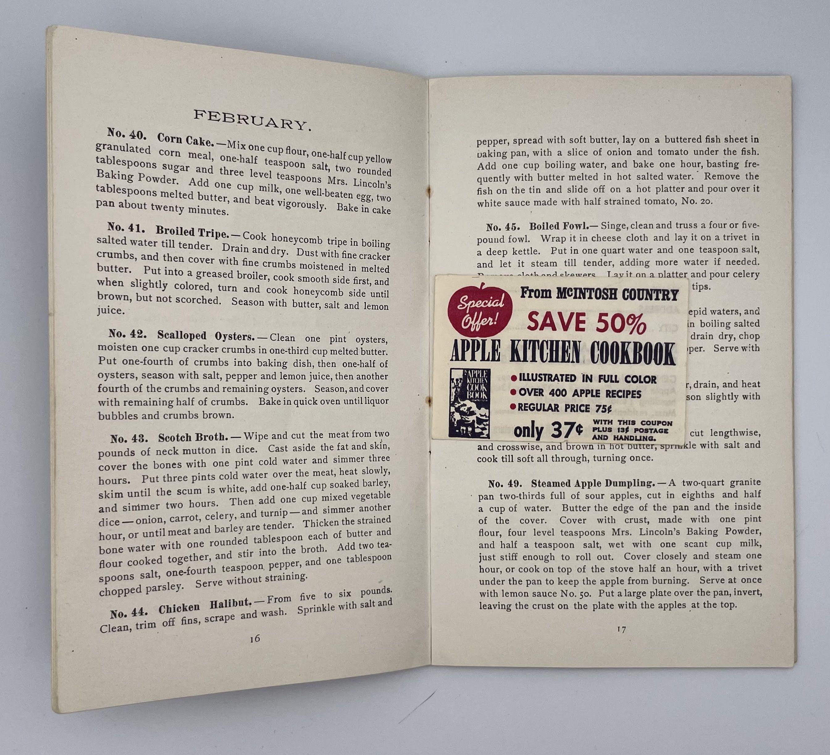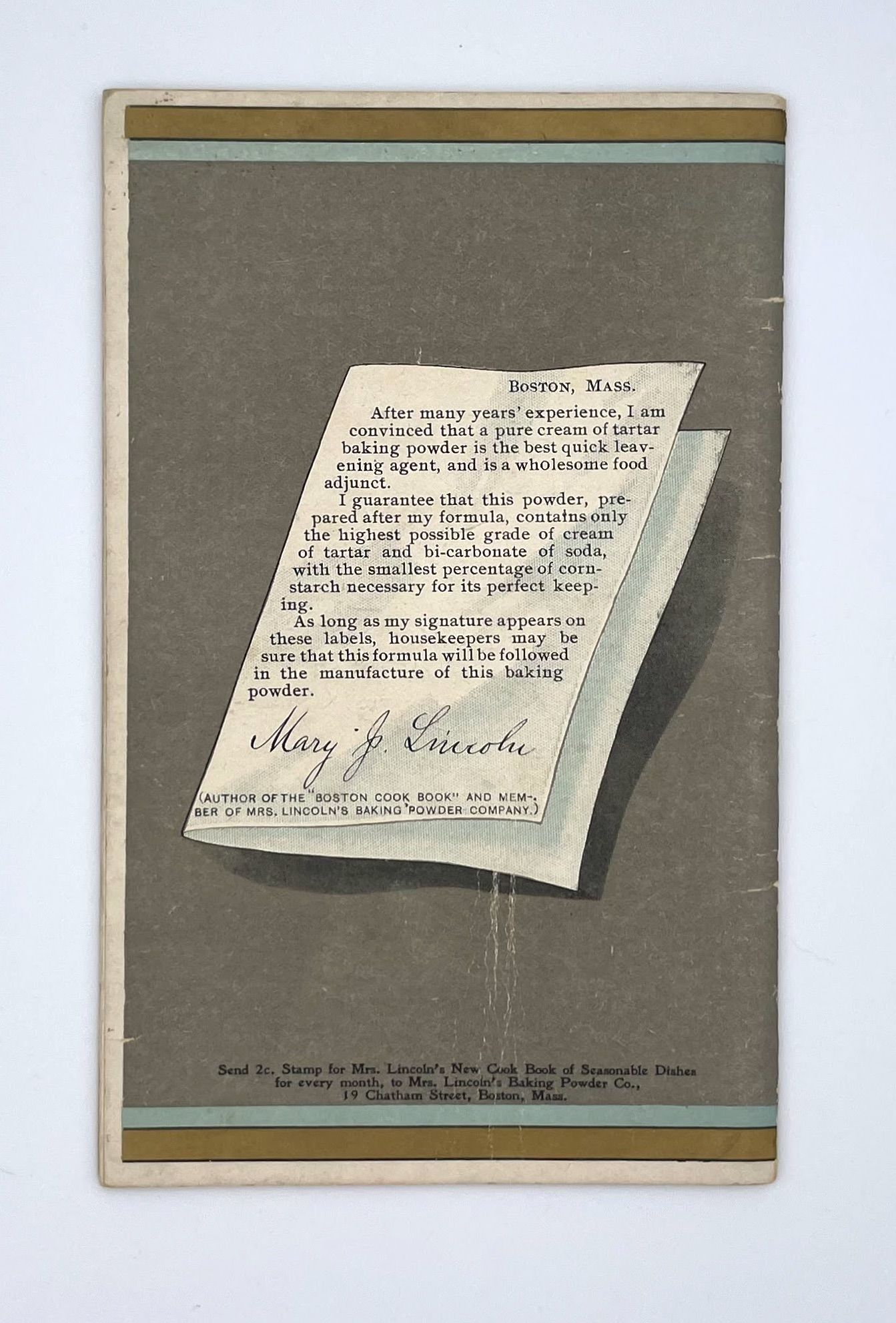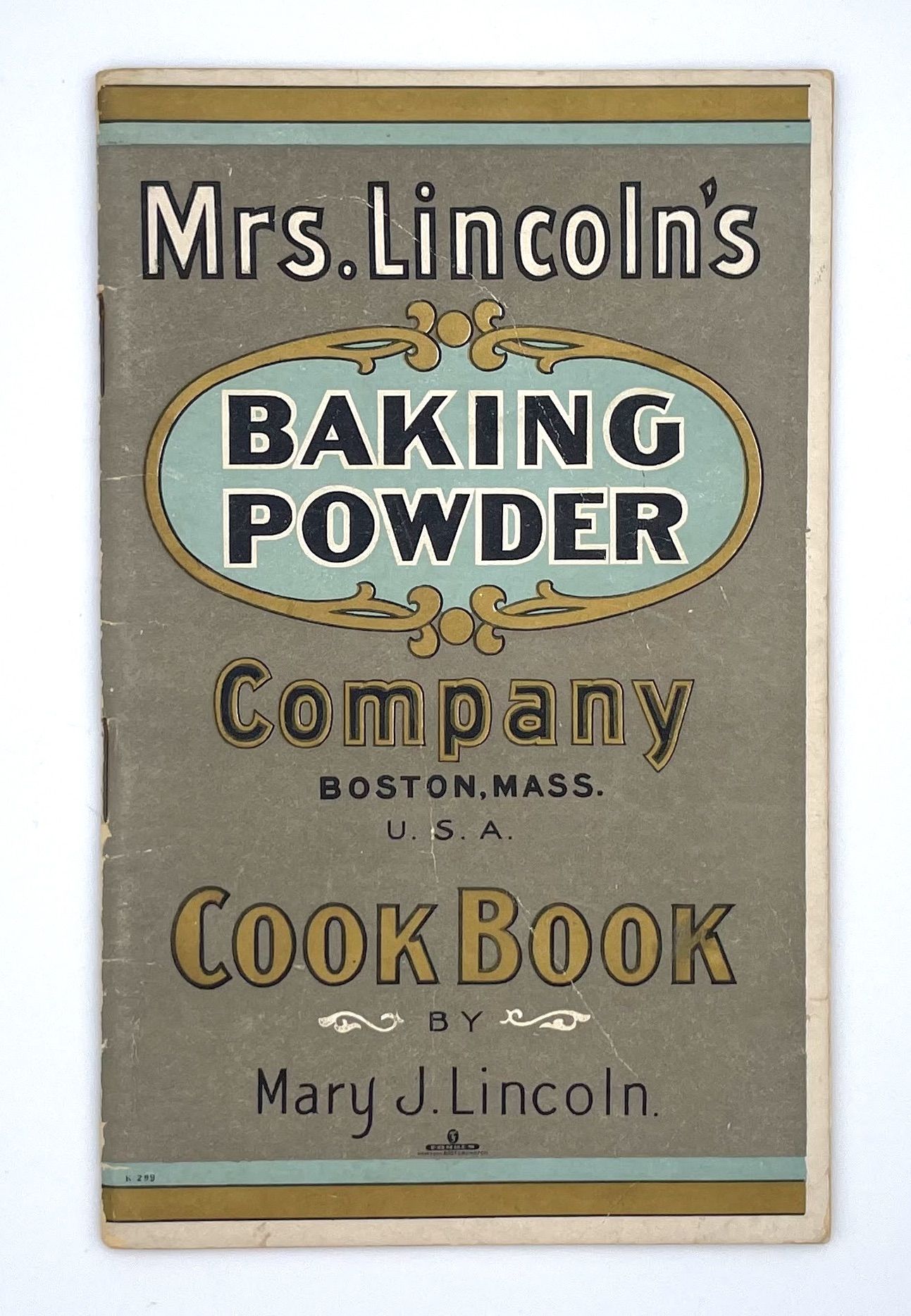 Boston, MA: Mrs. Lincoln's Baking Powder Company, 1899. staplebound. Gray printed wraps. Very good. 48 pages, 17.5 cm x 11cm. The Mrs. Lincolns Baking Powder Company Cookbook features an introduction from Mary J. Lincoln herself, a culinary celebrity at the time of the books publication. Lincoln wrote the Boston Cookbook, the preeminent cookbook of the moment and the predecessor of her student, Fannie Farmer's Boston Cooking School Cookbook of 1896, one of the most enduring American cookbooks of all time. With this celebrity status and the rise of branded products, she began to endorse brands of cooking products, most notably the Mrs. Lincolns Baking Powder that bears her name. This recipe book advertises this brand featuring recipes assembled by her, organized by month. She speaks directly to her readers in many of her addresses presumably as she might have addressed her many students at the Boston Cooking School. Apple Kitchen Cookbook advertisment inlaid. Some light scratches on cover, very good