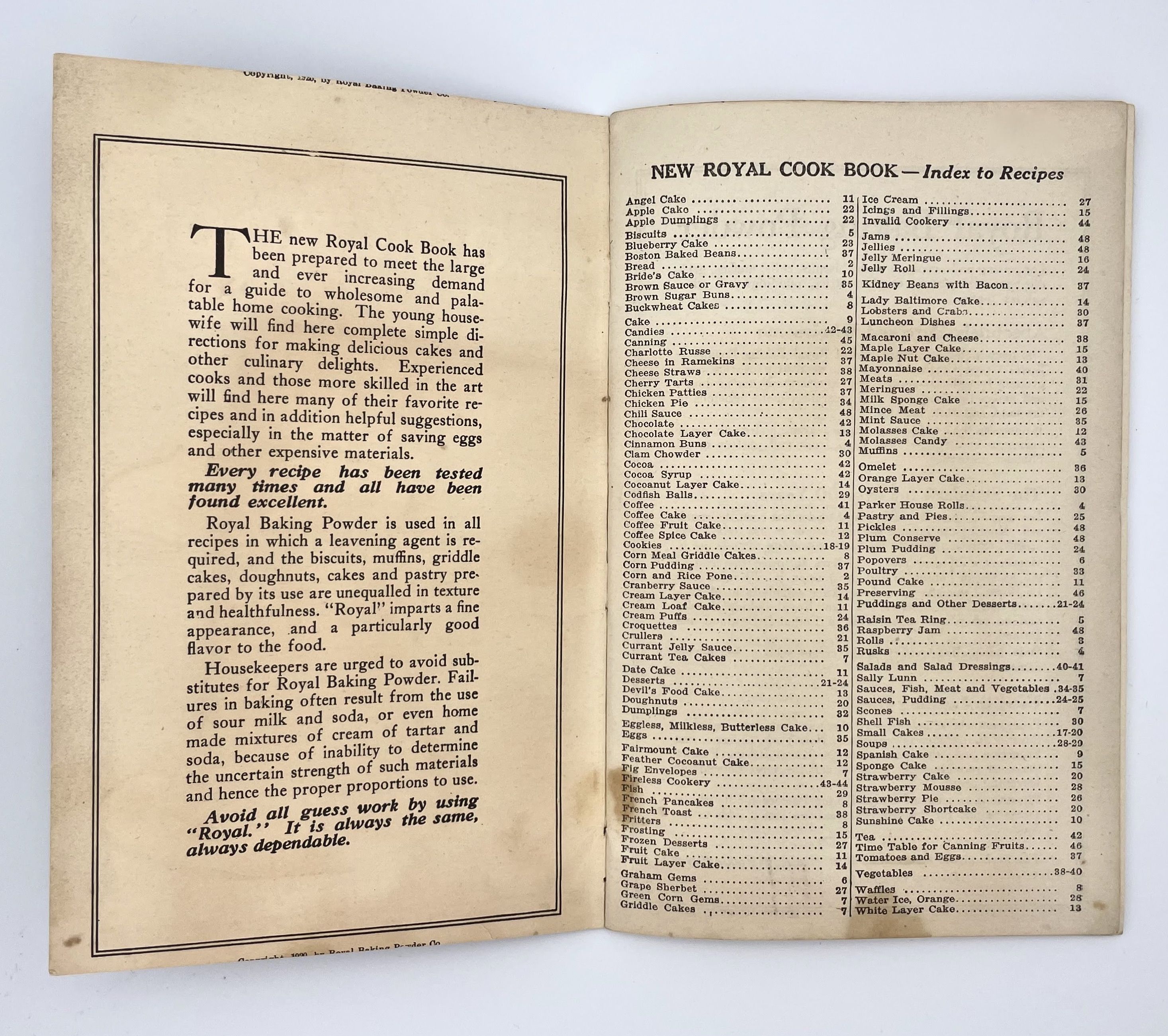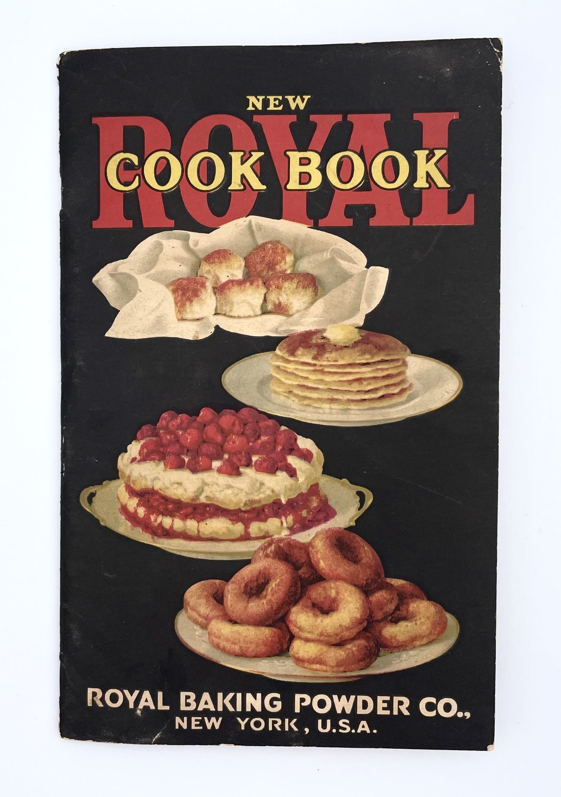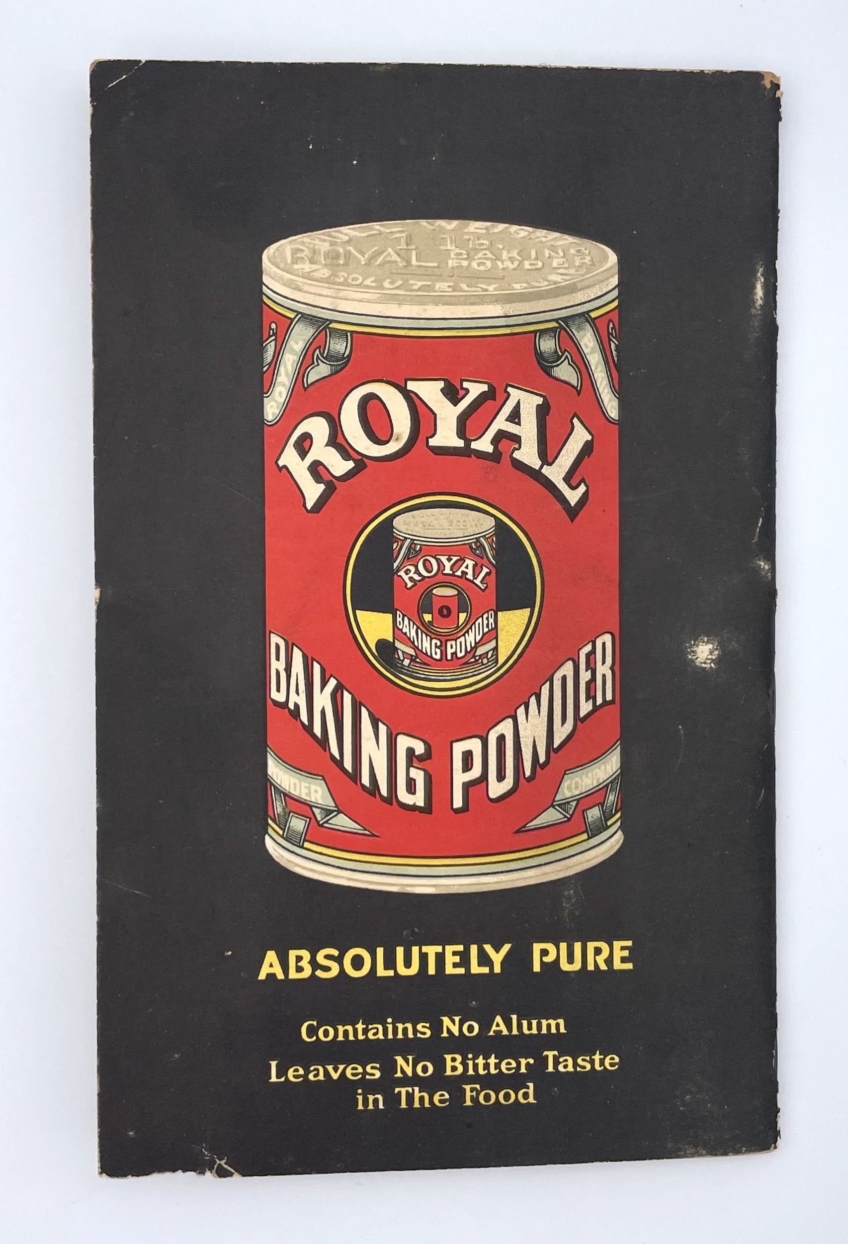 New York, NY: Royal Baking Powder Co., 1922. Staplebound. Black printed wraps, Near fine. 50 pages, 20 cm x 13 cm. The New Royal Cook Book is the 1922 release of the Royal Baking Powder Company in their line of advertisement recipe booklets. The cover has detailed, full color illustrations of some of the recipes inside, a large change from the 1902 and 1911 Royal Baker and Pastry Cook books this edition replaced. Inside the front page of the book, there is a yellow insert to fill out and send back with the names and addresses of three friends to whom Royal will send the book, free of charge. Laid in are a handwritten recipe for Picallili, a postcard from Stoneham, Massachusetts from 1907, and a recipe for Coffee Bavarian Cream written on a paper from the prescription pad of Dr. M. D. Sheehan. 2 small stains on front page, otherwise very clean.