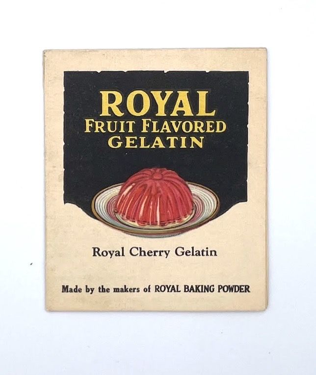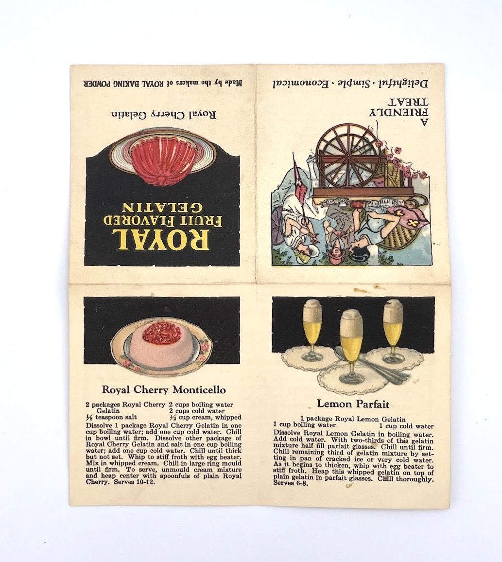 New York, NY: Royal Baking Powder Company, 1927. Folded. Cream printed card, Very good. Unpaginated, 6.5 x 7.5 cm. This "Royal Cherry Gelatin" foldable is illustrated with bright, colorful images of recipes made with the product and a drawing of three women enjoying a classy tea with their gelatin dessert with the caption "A Friendly Treat". The recipes include Lemon Parfait and Pineapple Jelly and Fruit Salad and all include Royal Fruit Flavored Gelatin in their ingredients list. Some small stains.