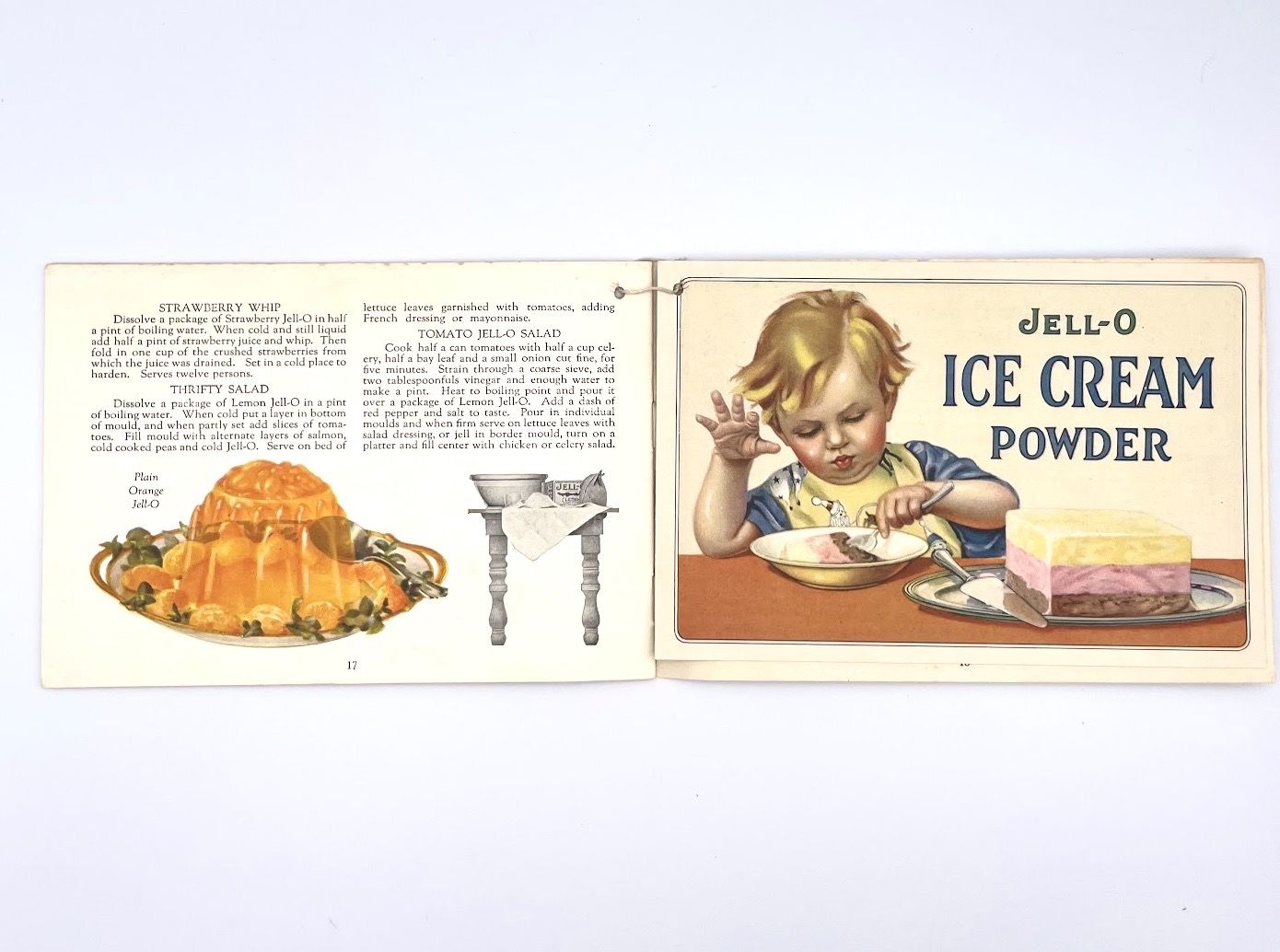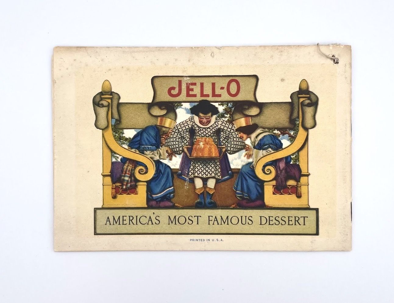 Le Roy, NY: The Genesse Pure Food Company, 1924. Staplebound. Cream illustrated wraps, Very good. Parish, Maxfield. 18 pages, 15.5 x 11 cm. Illustrations by Maxfield Parish. This adverisement for "America's Most Famous Dessert" notably comes from the brief time during which Chocolate Jell-O was produced by the company. It contains recipes for all six of the flavors, as well as an insert on Jell-O ice cream powder. Foxing and some small tears near spine not going all the way through the cover