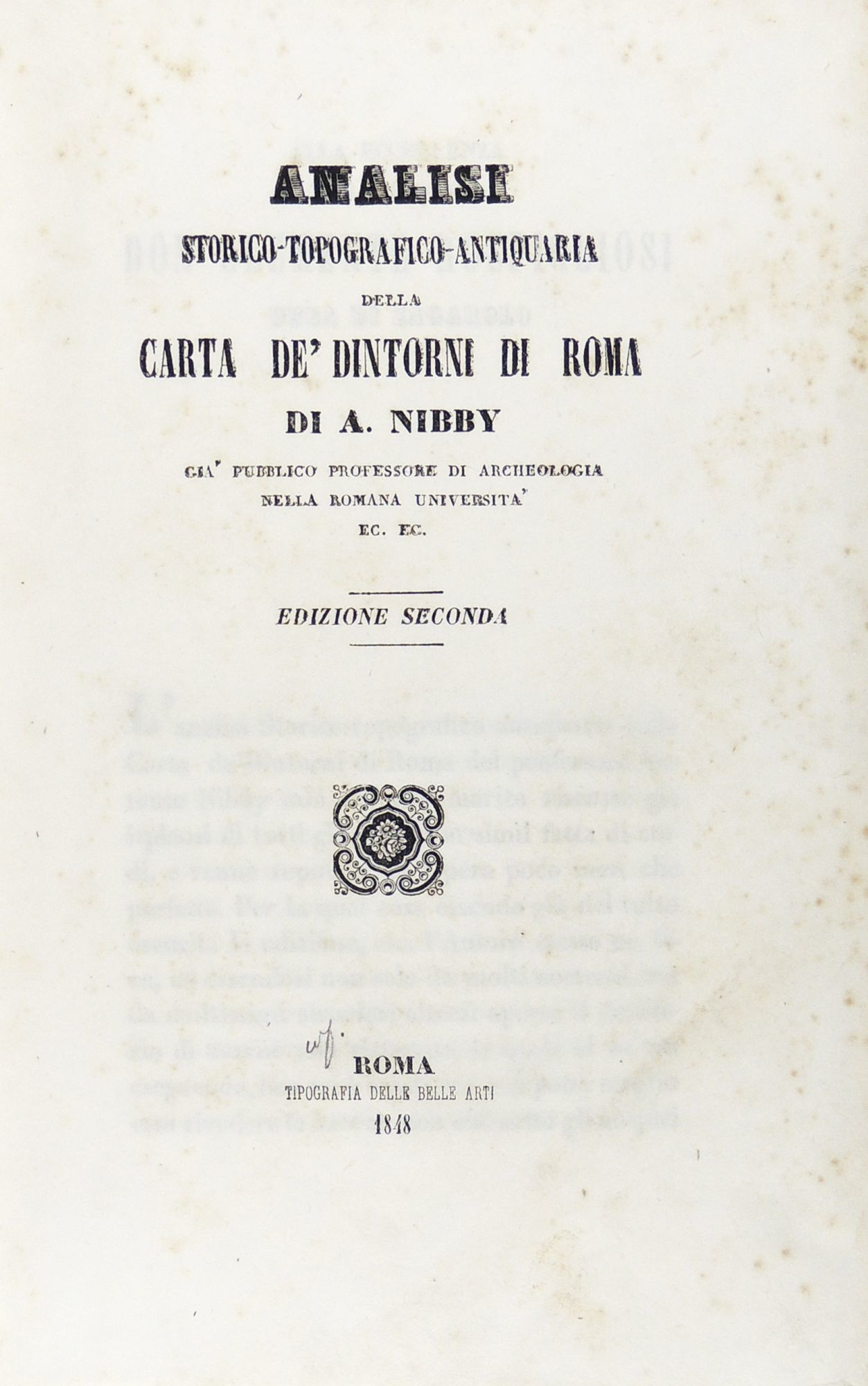 Antonio Nibby (1792 – 1839) was an Italian archaeologist and topographer. He was an expert on the topography of Rome and its environs. He was a professor of archaeology in the University of Rome and in the French Academy in Rome. For a few years Nibby worked together with the British archaeologist William Gell and together they published a study on the walls of Rome in 1820. They had plans of publishing a study on the topography of the Roman Campagna, but they ended up publishing separately [Wikipedia].
