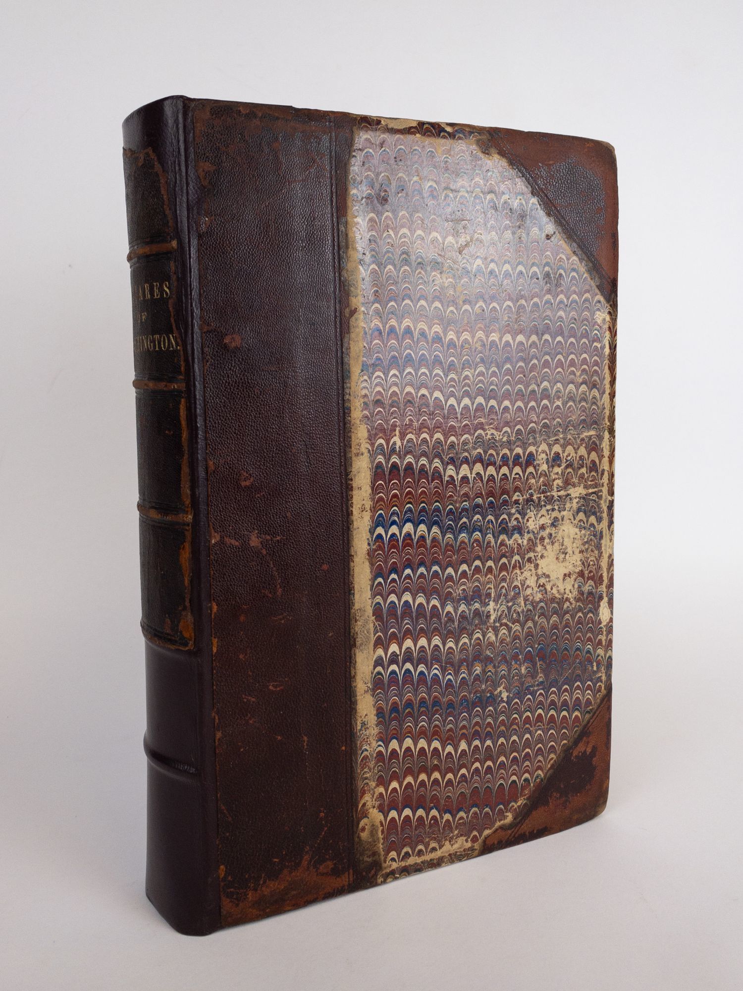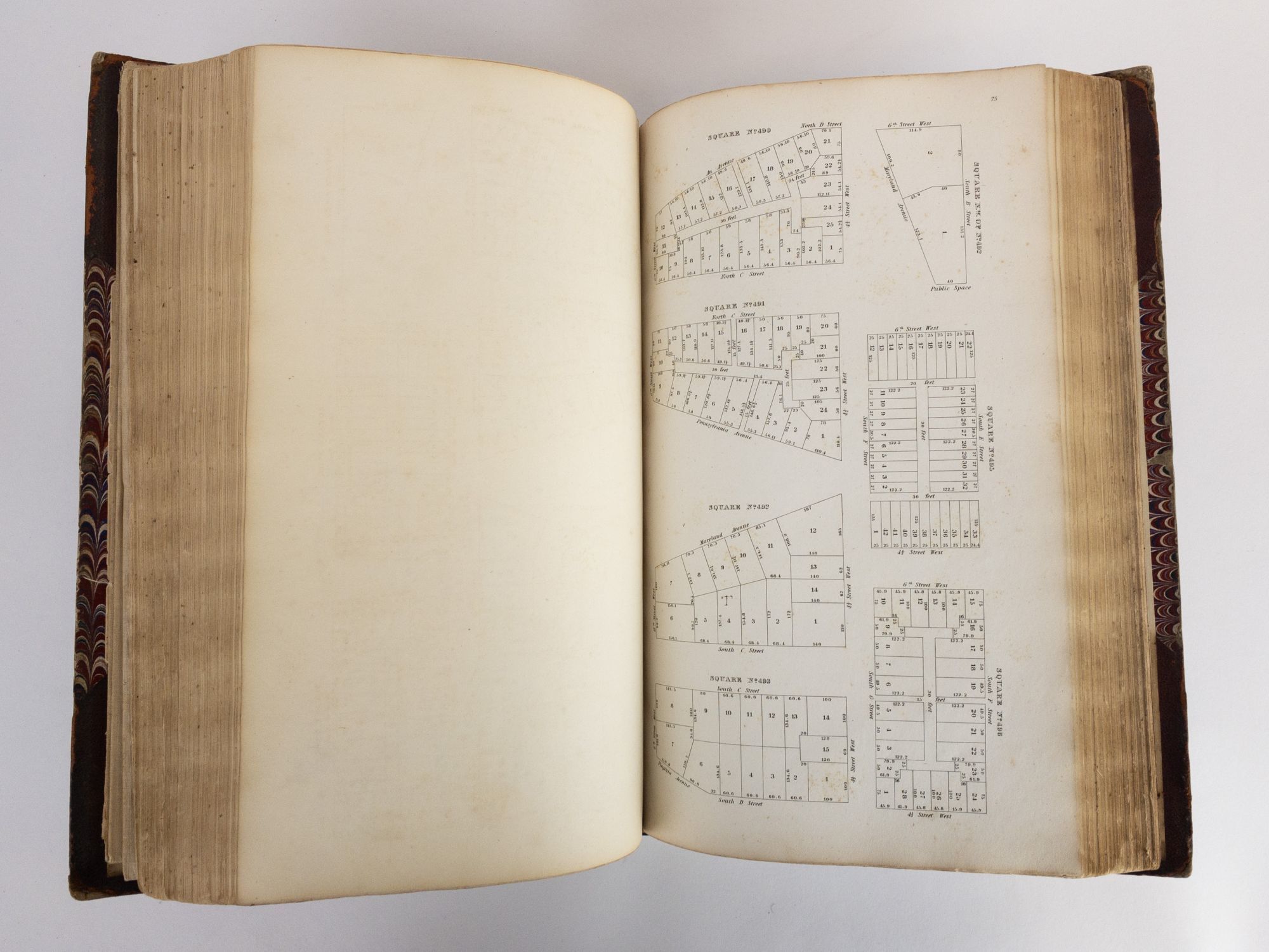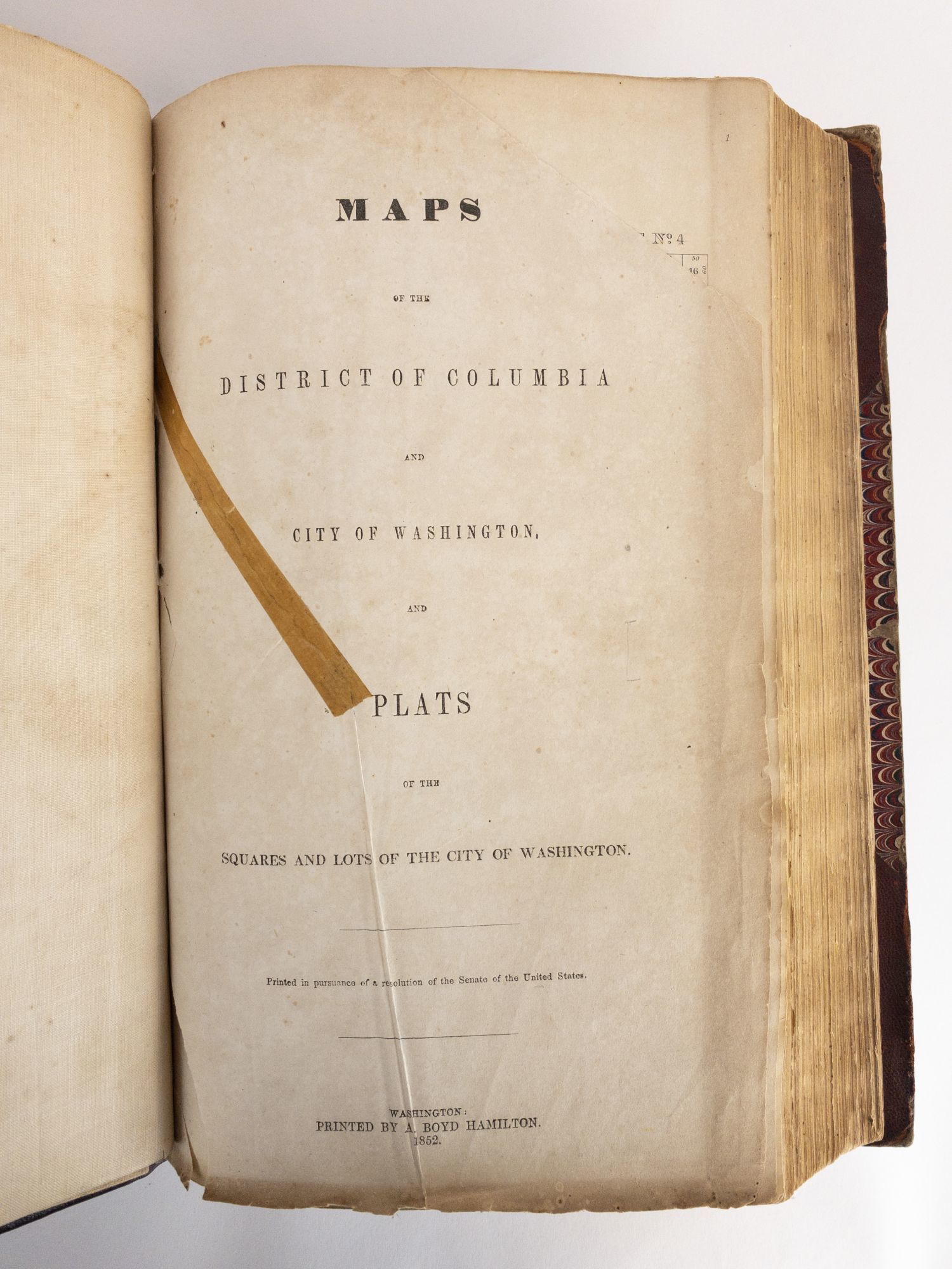 Washington, D.C.: Printed by A. Boyd Hamilton, 1852. Hardcover. Quarto, 159 numbered leaves. In Good plus condition. Bound in contemporary half leather with marbled paper boards. Newly rebacked preserving the spine and boards. Paneled spine with gilt lettering, reading "Squares of Washington". Moderate shelfwear. Scuffing and rubbing to front and rear boards. Bumping to corners. Small dent to top edge of rear board. Age toning and foxing to text block. Slight warping to text block. Tearing to front endpapers and title page. Tape adhered to title page. Stamp of previous owner on third to last page in rear. Features three additional fold-out maps tipped in and reinforced with cloth backing. Shelved above Case 4.