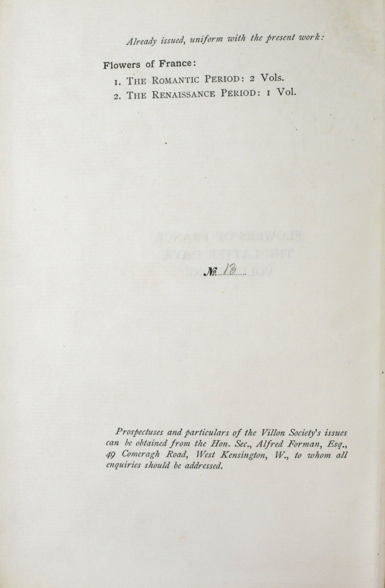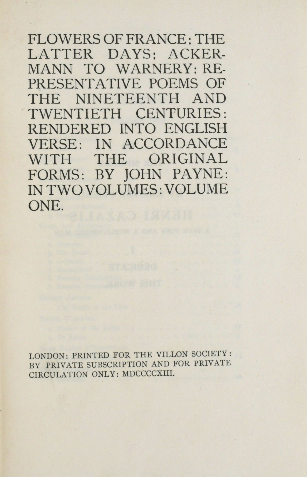 [POETRY] [ANTHOLOGY] FLOWERS OF FRANCE: THE LATTER DAYS: ACKERMAN TO WARNERY: REPRESENTATIVE POES OF THE NINETEENTH AND TWENTIETH CENTURIES: RENDERED INTO ENGLISH VERSE: IN ACCORDANCE WITH THE ORIGINAL FORMS ... IN TWO VOLUMES (COMPLETE)