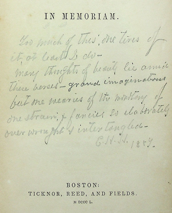 Boston: Ticknor, Reed, and Fields, 1850. Second American edition, with Hobart & Robbins on copyright page and "3" omitted on p.3. Octavo (19cm). Blindstamped brown cloth, titled in gilt on spine; yellow endpapers; 216,48pp; 48pp publisher's catalogue at rear. Ownership inscription and occasional pencil annotations of E. H. Harding of Milton. Sound but spine lightly rolled, wear to spine ends and corners, lacking rear free endpaper, occasional spots of foxing: Good. TRYON & CHARVAT A190a.