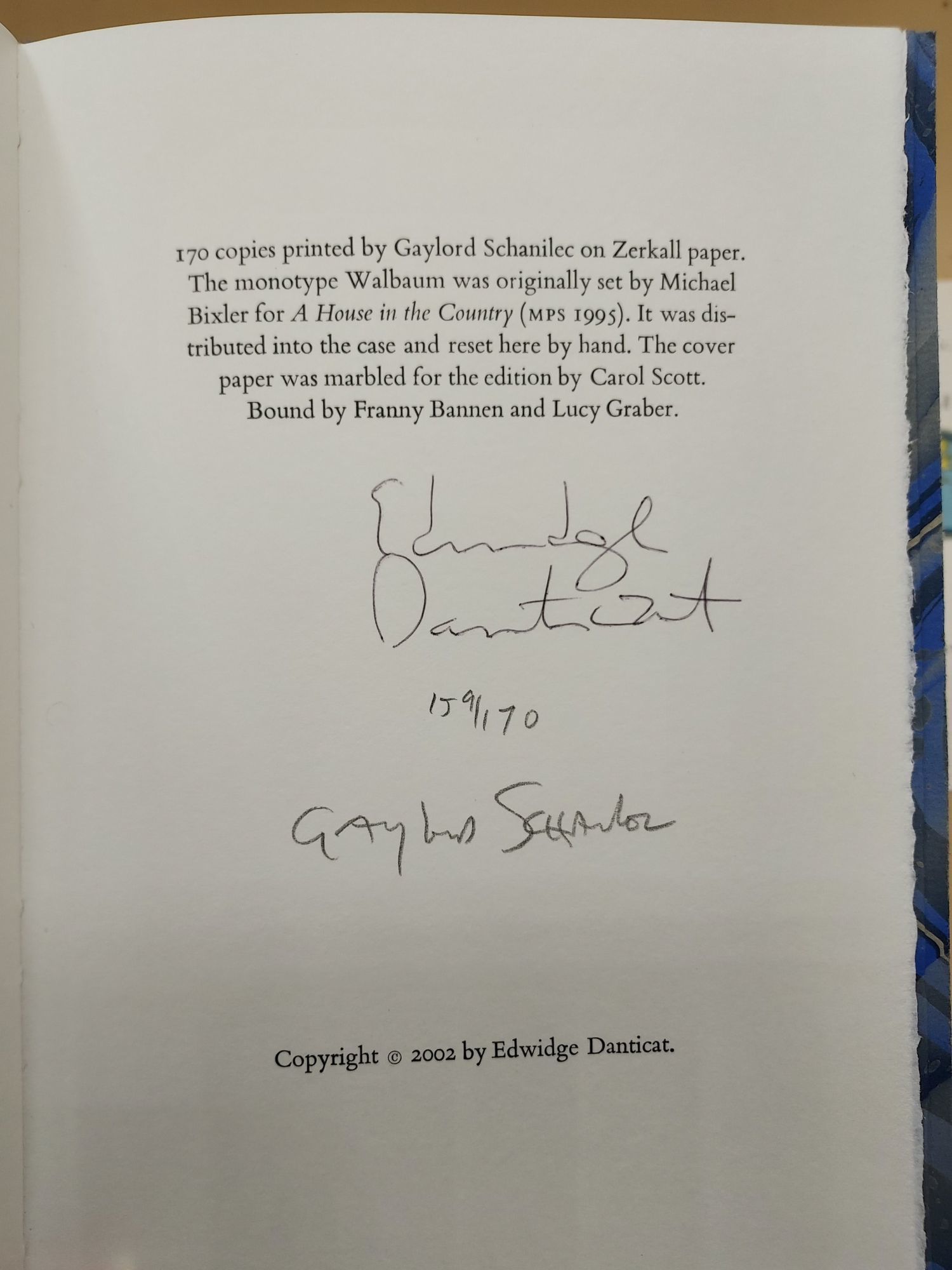 Number 159 in an edition limited to 170 copies. Signed by Edwidge Danticat and the printer, Gaylord Schanilec, on the limitation page.