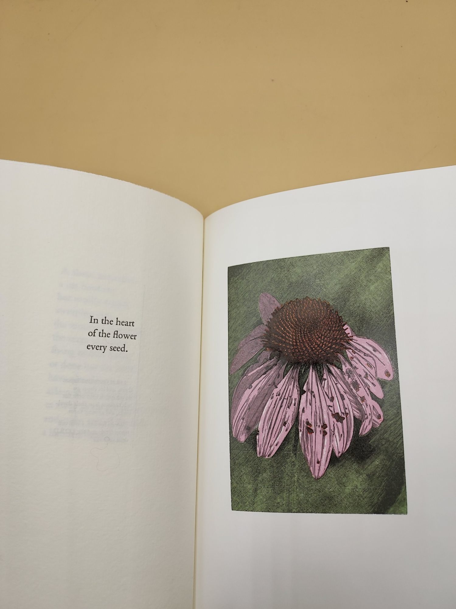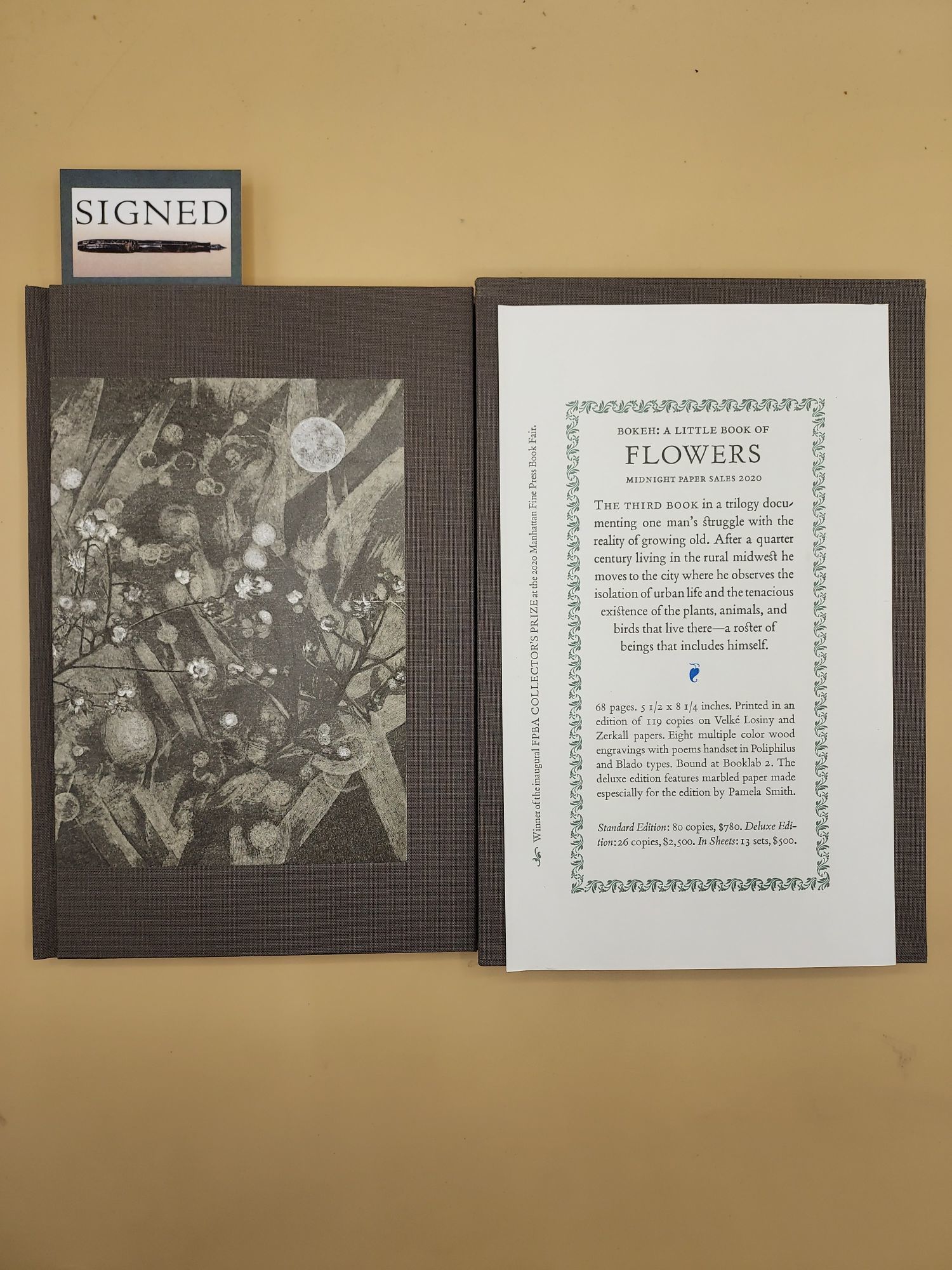 Midnight Paper Sales, 2020. Limited Edition. Hardcover. Fine. SIGNED. Slim octavo [22 cm] Gray cloth over boards with decorative paper labels on the spine and boards. Top edge trimmed; other edges deckled. Composed, handset, and printed by Gaylord Schanilec. Printed on paper hand made at the Velké Losiny mill in the Czech Republic. In a gray cloth covered slipcase. Publisher's prospectus and errata tucked in. Bound by Marc Hammonds, Keri Schroeder, & Craig Jensen. The wood engravings were based on photographs taken by Schanilec using a 100 mm f/2.8 macro lens, and were printed on paper mould made at Zerkall-Bütten mill in Germany.