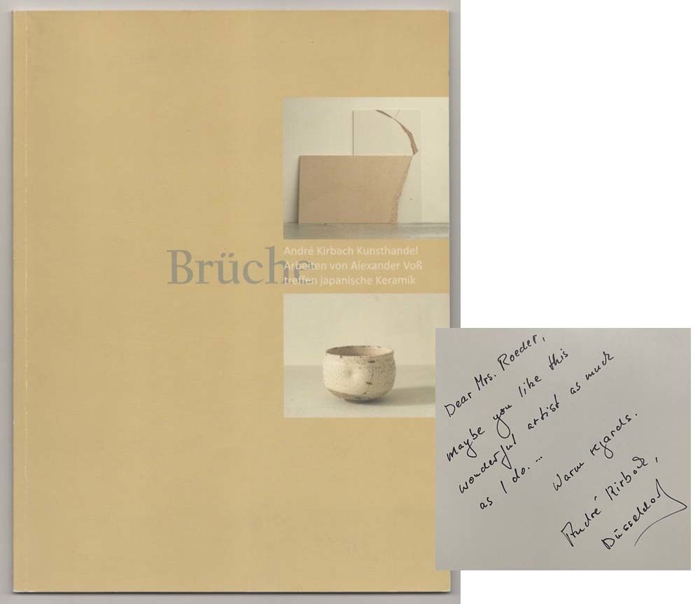 Dusseldorf: Andre Kirbach Kunsthandle, 2011. First edition. Softcover. Exhibition catalog for a show that ran September 17 through October 29, 2011. Subtitled: Arbeiten des Mulheimer Kunstlers Alexander Voß im Dialog mit alten und reparierten Objekten japanischer Keramik. Text in German. Includes numerous color illustrations of vintage and new Japanese ceramics. A clean very near fine copy in wrappers. Signed and inscribed by the galleriest Kirbach to another gallerist. Uncommon.