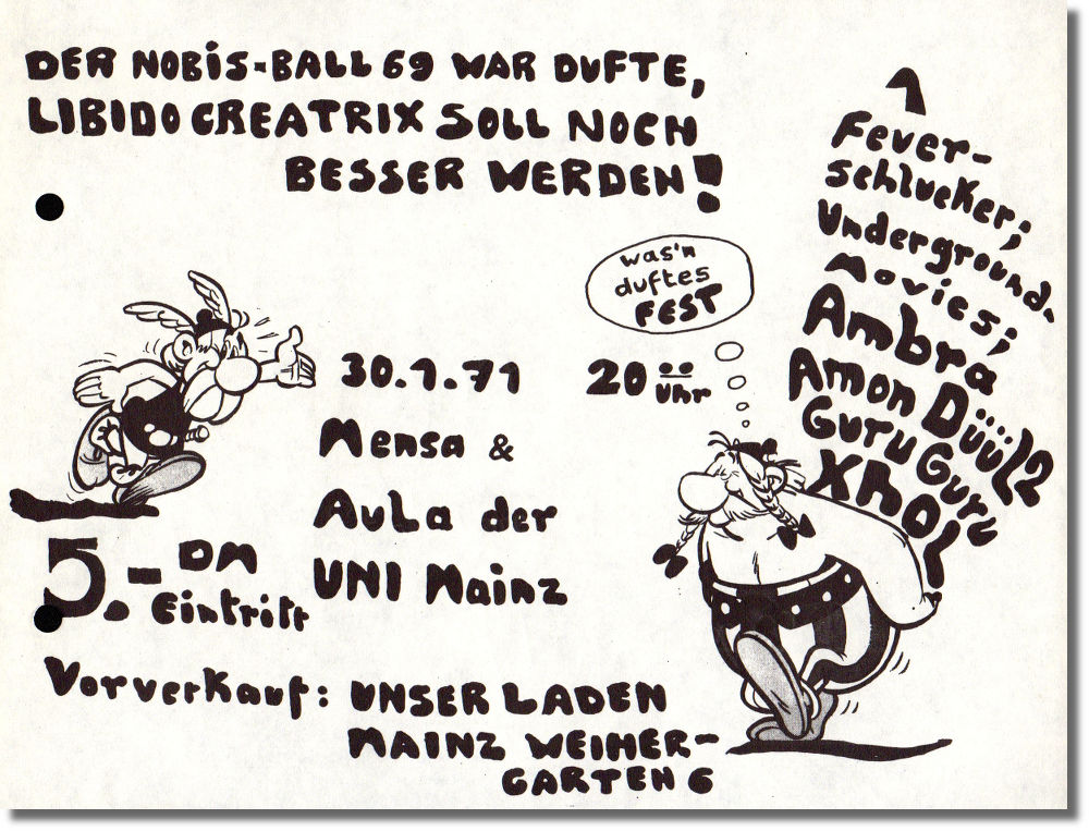 Mainz: University of Mainz, 1971. 16 by 21 cm. Black printing on plain white stock. Two small hole punches on left side, one affecting the number "5", else very good. Original flyer for an event called “Libido Creatrix,” which was to take place on January 30th, 1971 in the cafeteria and auditorium of the University of Mainz in West Germany. The right side of the poster advertises “one fire-eater, underground movies, Ambra, Amon Düül 2, Guru Guru, and Xhol.” The final three bands are a “who’s who” of early Krautrock and a great snapshot of some important groups in their heyday, playing a show on a college campus with a five Deutschmark entry fee.