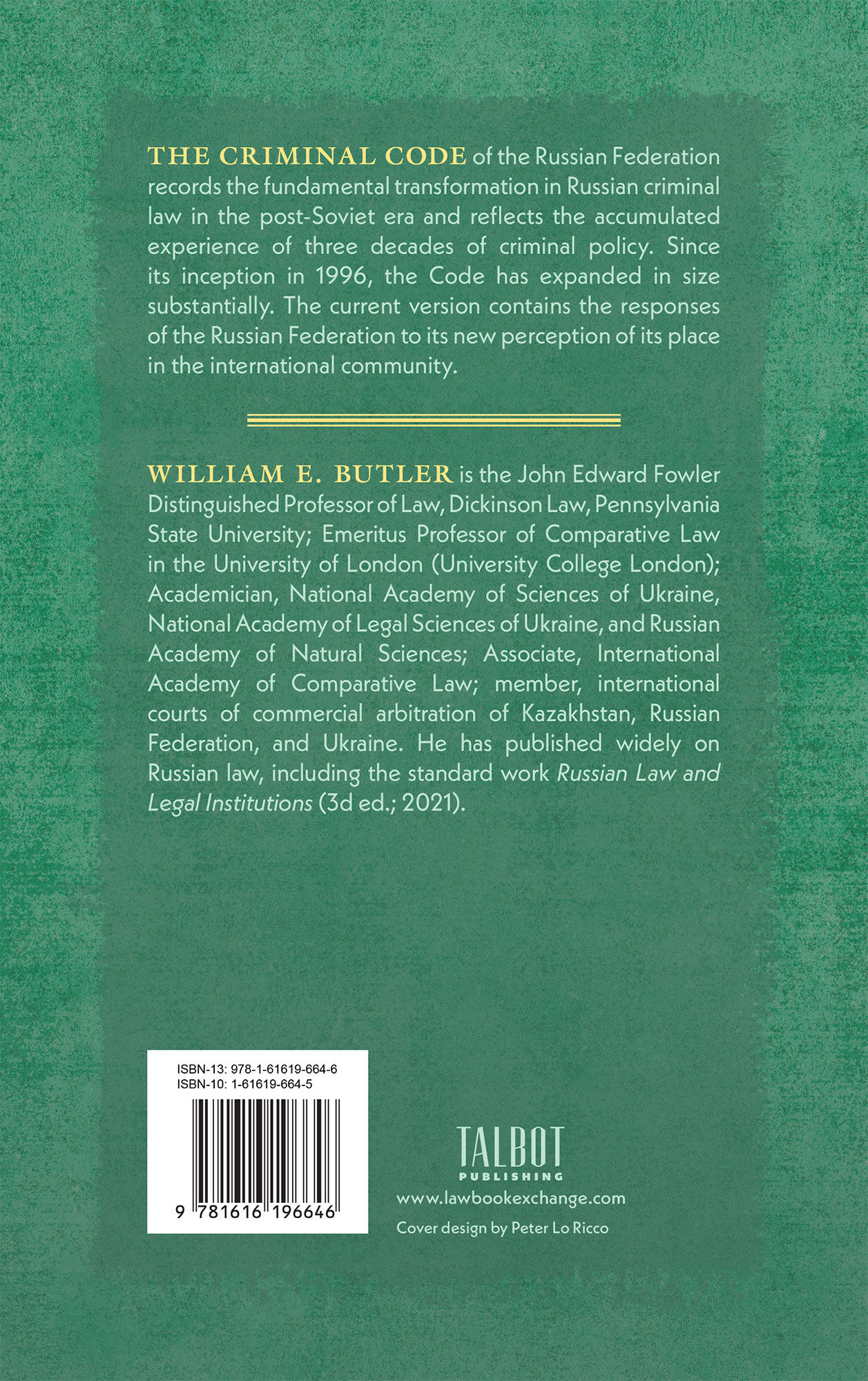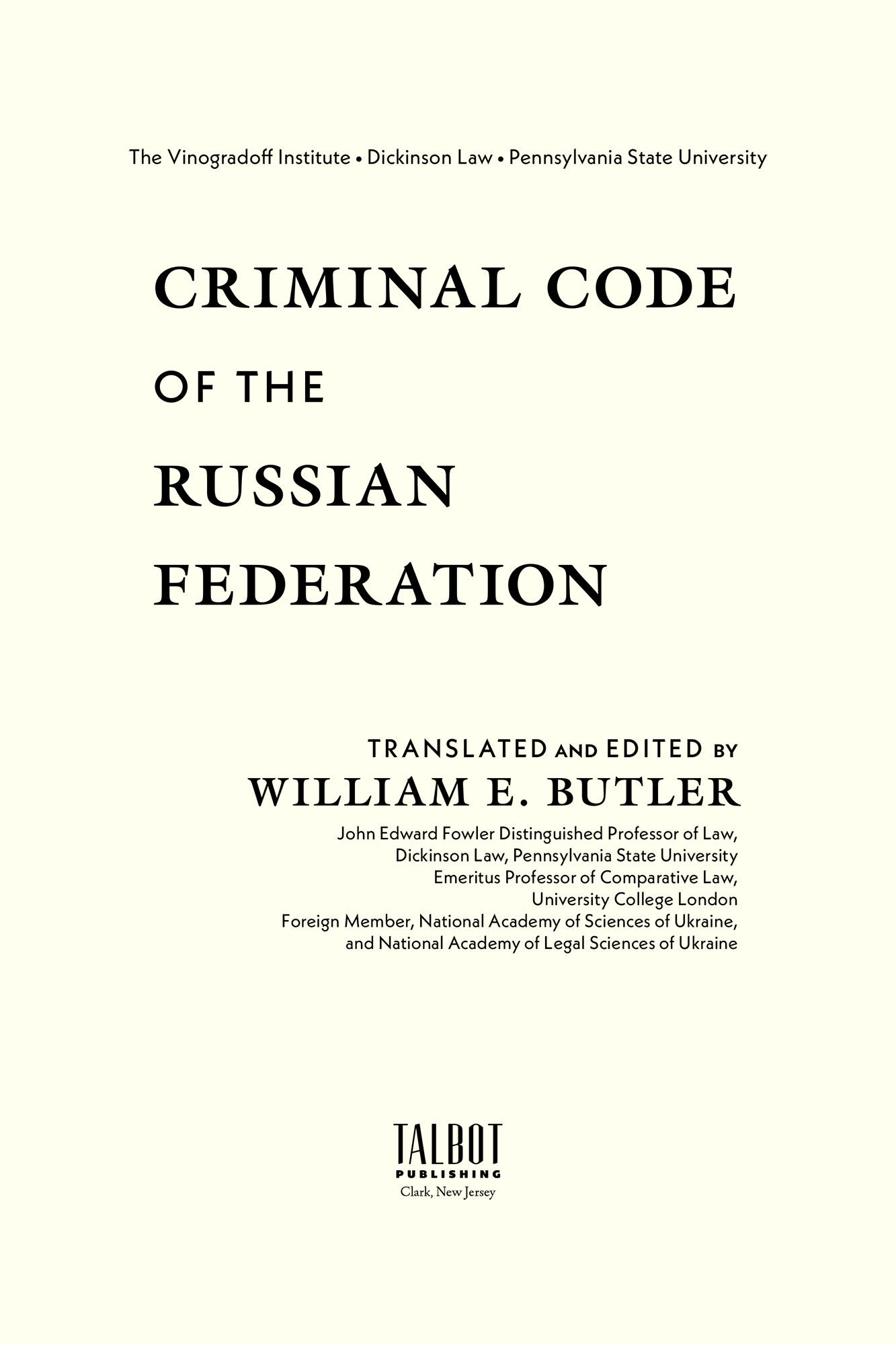 2022. ISBN-13: 9781616196646; ISBN-10: 1616196645. Butler, William E., Translator and Editor. Criminal Code of the Russian Federation. Clark, New Jersey: Talbot Publishing (An Imprint of The Lawbook Exchange, Ltd.), September 2022. liv, 409 pp. ISBN-13: 9781616196646 ISBN-10: 1616196645 Hardcover. New. $185. * A title in the series Russian, Eurasian, and East European Codes of Law. The Criminal Code of the Russian Federation records the fundamental transformation in Russian criminal law in the post-Soviet era and reflects the accumulated experience of three decades of criminal policy. Since its inception in 1996, the Code has expanded in size substantially. The current version contains the responses of the Russian Federation to its new perception of its place in the international community. WILLIAM E. BUTLER is the John Edward Fowler Distinguished Professor of Law, Dickinson Law, Pennsylvania State University; Emeritus Professor of Comparative Law in the University of London (University College London); Academician, National Academy of Sciences of Ukraine, National Academy of Legal Sciences of Ukraine, and Russian Academy of Natural Sciences; Associate, International Academy of Comparative Law; member, international courts of commercial arbitration of Kazakhstan, Russian Federation, and Ukraine. He has published widely on Russian law, including the standard work Russian Law and Legal Institutions (3d ed.; 2021).