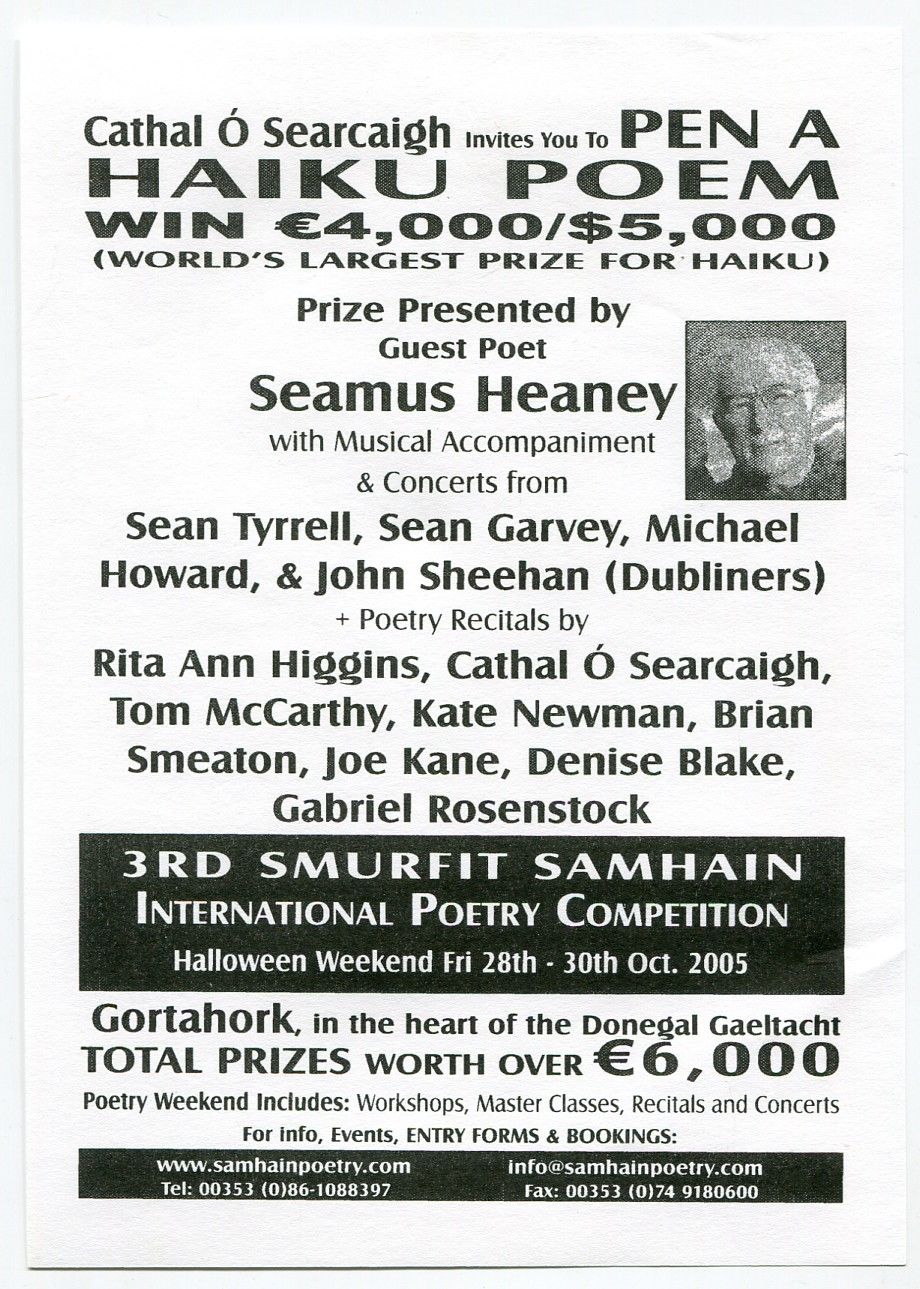 Unbound. Fine. Handbill for the 3rd Smurfit Samhain International Poetry event with a $5,000 prize presented by Seamus Heaney. Printed in black and white. Measuring approximately 5¾" x 8¼". Fine. The event took place over Halloween weekend in 2005 at Gortahork, Ireland. With musical accompainment and concerts from: Sean Tyrell, Sean Garvey, Michael Howard, and John Sheehan. Poetry recitals by Rita Ann Higgins, Cathal O Searcaigh, Tom McCarthy, Kate Newman, Brian Smeaton, Joe Kane, Denise Blake, and Gabriel Rosenstock.
