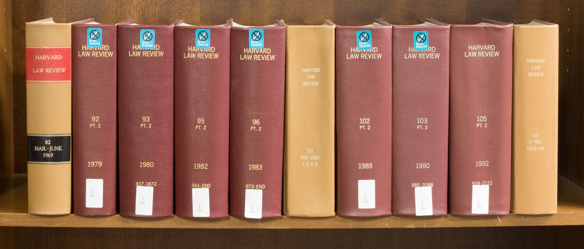 1994. 10 books noted below. 10 books noted below. Harvard Law Review. Cambridge, Mass.: Harvard Law Review Association. Bound Volumes 82 (1969); 92 Pt 2(1979); 93 Pt 2 (1980); 95 Pt 2 (1982); 96 Pt2 (1983); 101 Pt 2( 1988); 102 Pt 2 (1989); 103 Pt (1990); 105 Pt 2 (1990); 107 Pt 1 (1994). Together 10 books. Mixed bindings, maroon buckram with gilt stamped spines, and tan buckram with gilt stamped spines. Ex-library, very good. $150. * The Harvard Law Review is a student-run organization formally independent of the Harvard Law School, which publishes eight issues per year/volume, containing articles by of legal scholarship by student editors as well as professors, judges, and practitioners and solicits reviews of important recent books from recognized experts. Individual volumes and standing order service available for future volumes as published.