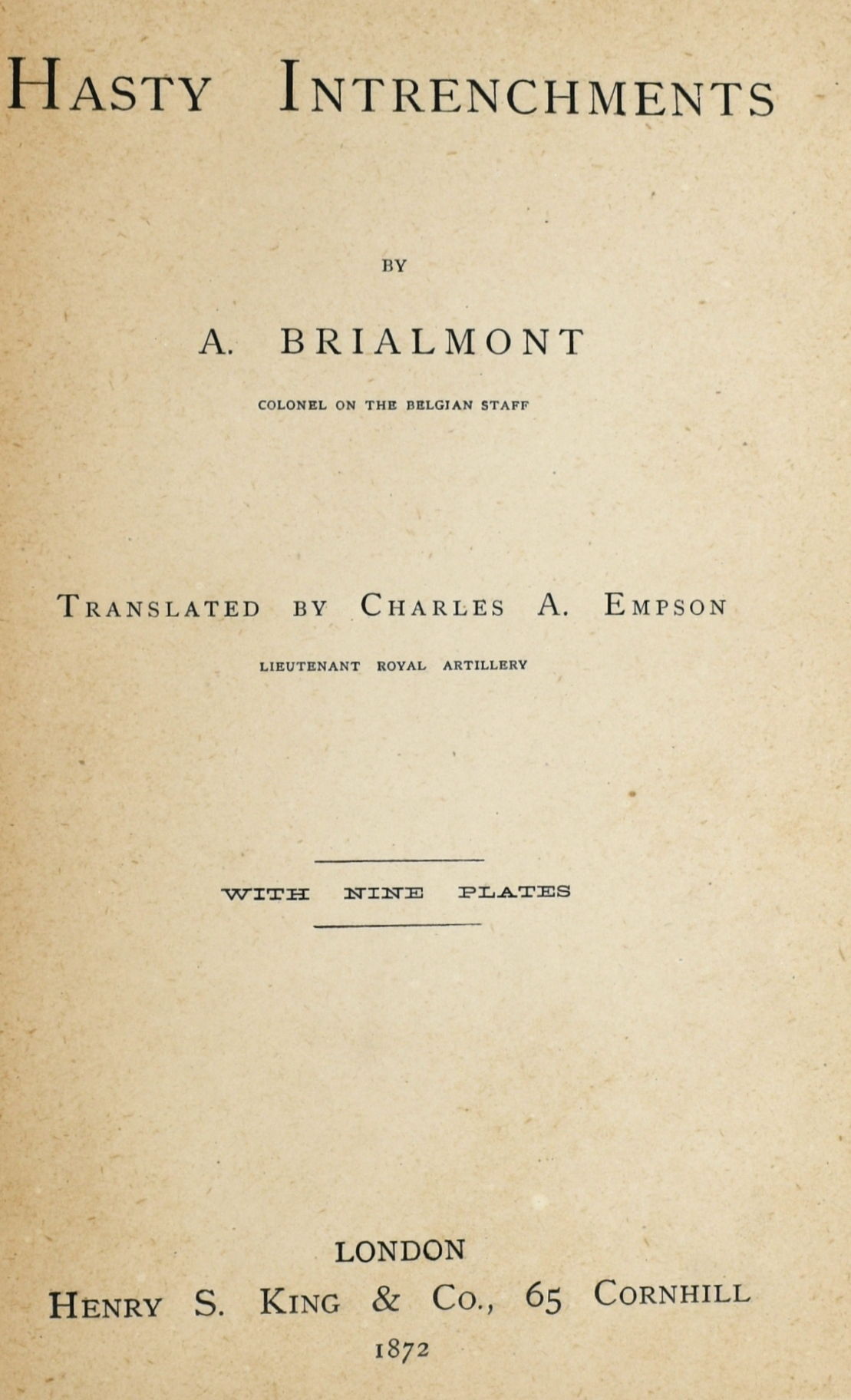 London: Henry S. King & Co, 1872. First Edition. Hard Cover. Very Good binding. 8vo. (8 1/2" x 5 1/2"); in the publisher's red cloth with black rules and titling in gilt; 94 pages with 9 leaves of plates, and a catalogue for H. S. King and for Kegan Paul at the rear of the book; some surface loss at the front hinge; ~~First English translation of an important work (La Fortification Improvisee printed in 1870) by the Belgian soldier Alexis Brialmont who was the leading fortifications engineer of the late 19th century. His innovative approaches to fortifications evolved from his plans to protect Antwerp and other Belgian cities from the new long-range artillery. French engineers in the First World War were greatly influenced by Brialmont and successfully so. Critical analysis of fortifications on the battlefield and their effects on battle. Very Good binding.