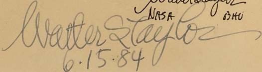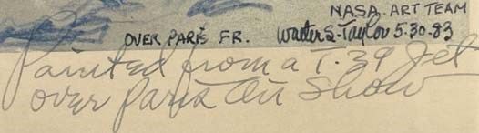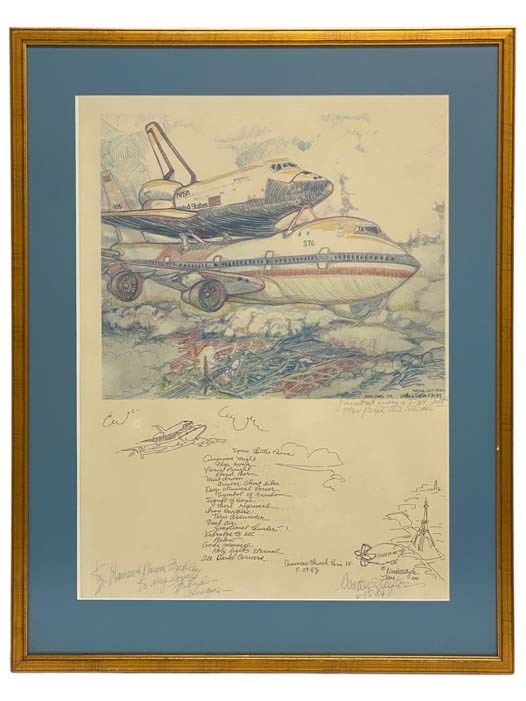 S.N, 1983. Signed Copy. Print. Near Fine. Taylor, Walter S. Signed by author. 1983 Print. 30 x 23 inches outside to outside. Gold frame, light blue matting, includes poems and sketches beneath the image. Signed by official NASA artist Walter S. Taylor, who painted the image from a jet during the Paris Air Show.