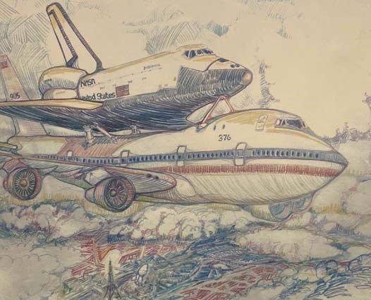 Framed Print of NASA Space Shuttle Enterprise Transported by Jumbo Jet at the Paris Art Show, Signed by Official NASA Artist Walter S. Taylor