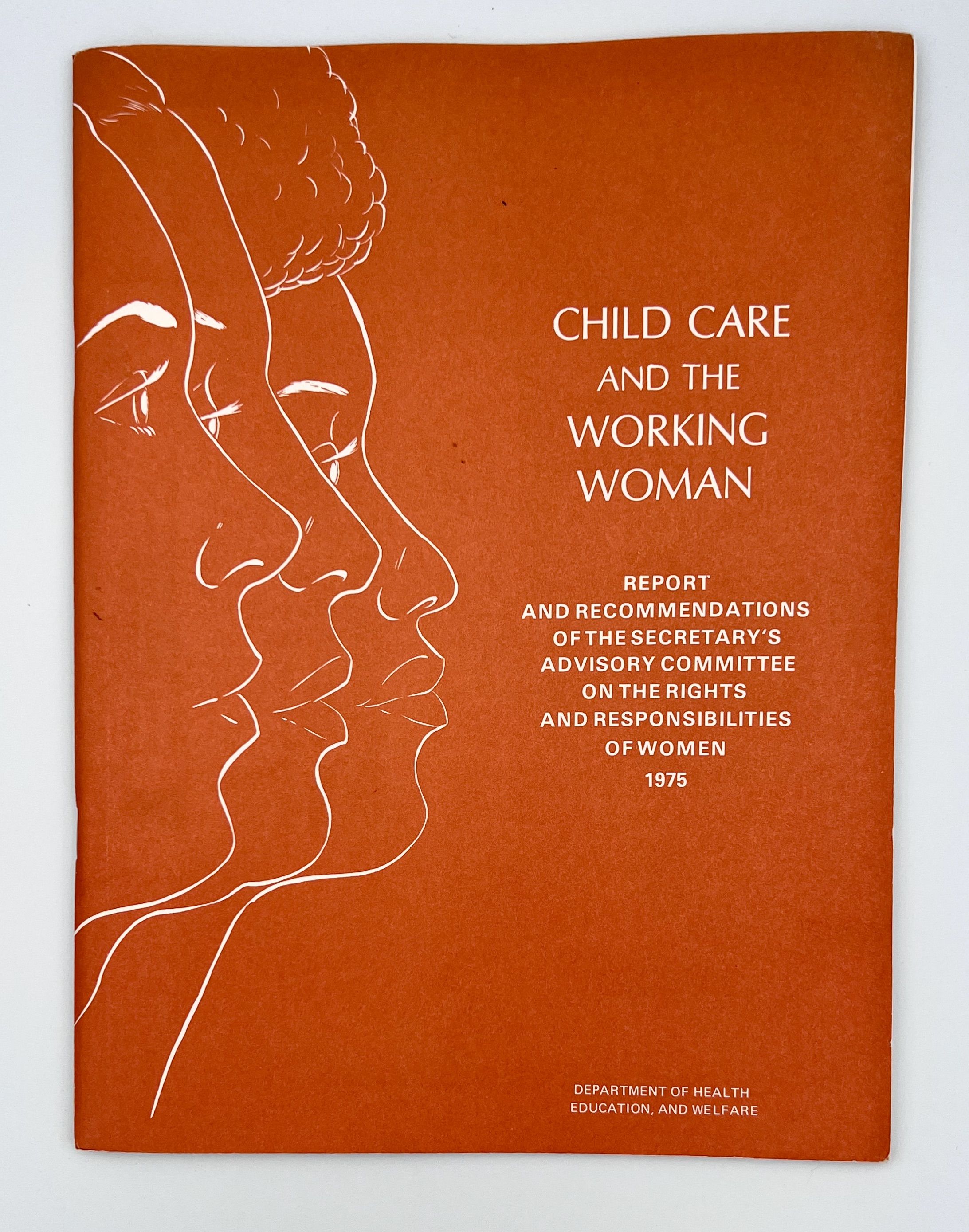 Washington DC: U.S. Government Printing Office, 1975. First Edition. Staplebound. Orange staplebound pictoral wrappers. Near fine. 54 pages. 26.5 x 20 cm. Follows the 1975 report of the subcommittee on social services and welfare, the SACRRW conference on child care and the working woman, and recommendations for changes in light of these. Advocates for better child care programs for mothers through the department of health, education, and welfare using illustrated examples of child care organizational models, charts of advantages and disadvantages of independent child care systems, and more. Some light wear on spine.