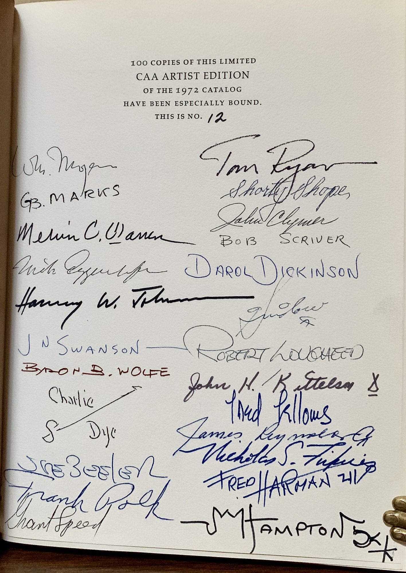 Flagstaff: Northland Press, 1972. First edition. Hardcover. Publisher's quarter brown cloth and textured salmon colored cloth. Fine. 80 pages. 25 x 19 cm. Limited edition copy 12 of 100 signed by twenty six cowboy artists. Illustrated throughout with photographs and drawings. Exhibition list June 10 through September 5, 1972 and a list of Previous Exhibition Winners.