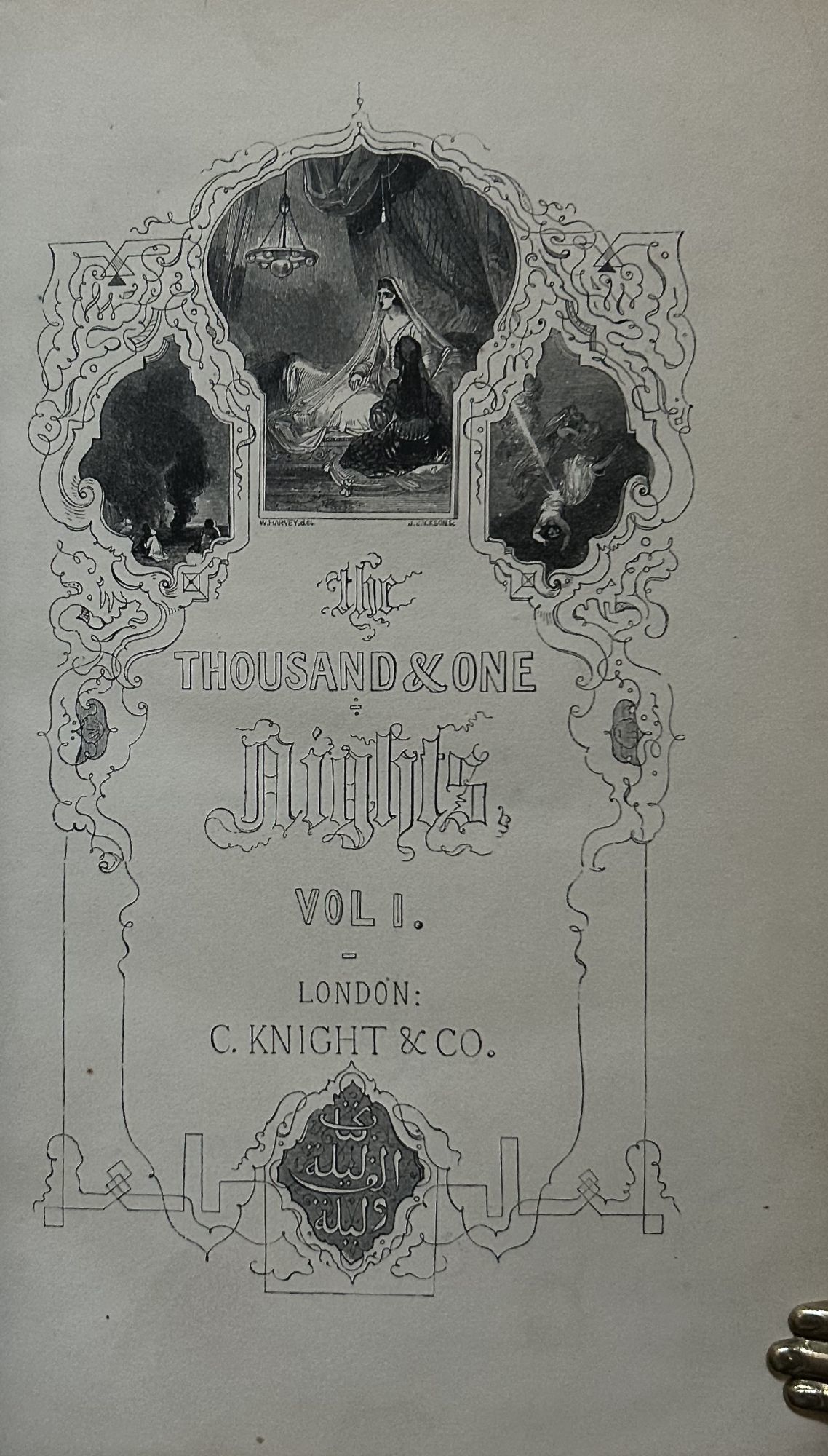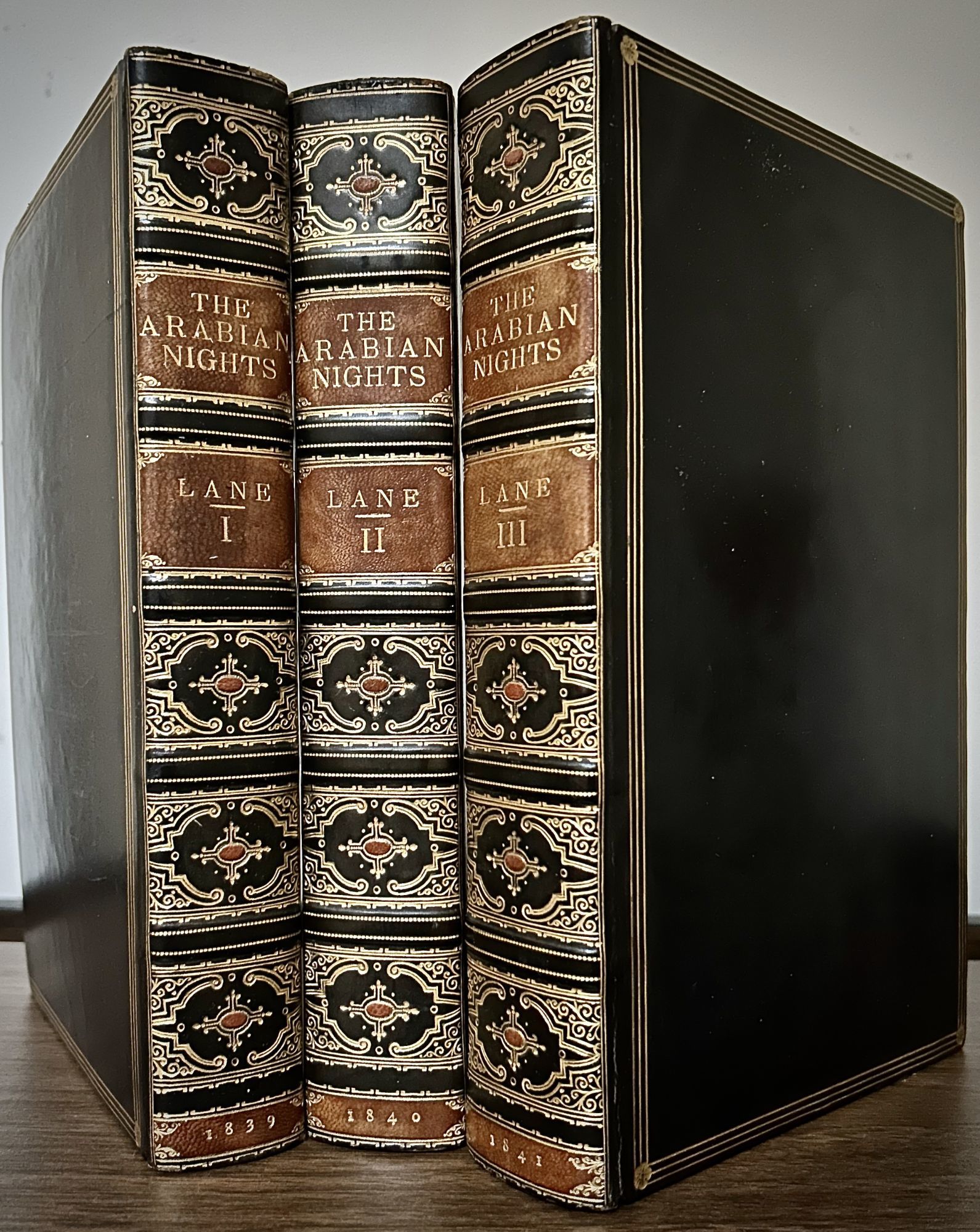 London: Charles Knight, 1841. First edition thus. leather_bound. Black polished calf. Teg. Fine. 3 Vols. (XXXII) 618, 643, 763 pages. 25 x 16 cm. Bound by Zaehnsdorf. Hundreds of engravings on wood by William Harvey. Index. Lane, a noted Oriental scholar resided many years in Egypt in the early 19th century also authored a valuable Arabic lexicon. "William Harvey (1796-1866) was Bewick's favorite pupil, and by all accounts, a most amiable man, one who reached the top of the tree as both engraver and artist." Lane added abundant and scholarly notes, elucidating terms, explaining customs and illustrating points of Islamic faith, which were later assembled to form a book entitled Arabian Society in the Middle Ages. The translation was almost entirely from the Arabic edition of the text published at Bulaq in Cairo in 1835. He was unquestionably the most eminent English Arabist of his time. Raised bands, panels elaborately decorated in gold motifs with a center oval in brown, matching the spine labels also in brown and gilt lettered. Triple gilt border panels, inner dentelles and marbled endpapers. First few leaves of Vol.1 very lightly toned.