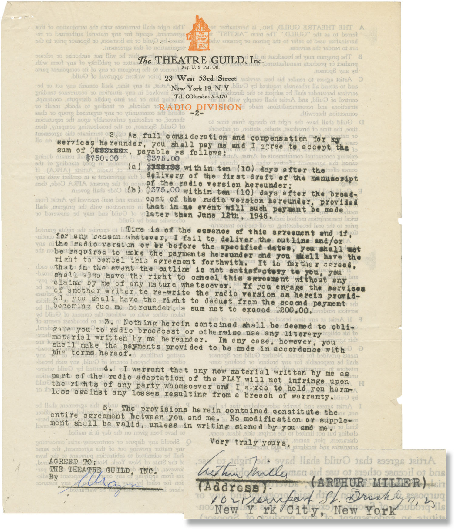 N.p.: The Theatre Guild, 1945. Small archive of material relating to the 1945 radio play, including the original play script, a Theatre Guild contract signed by Arthur Miller, and an original program for the live performance.