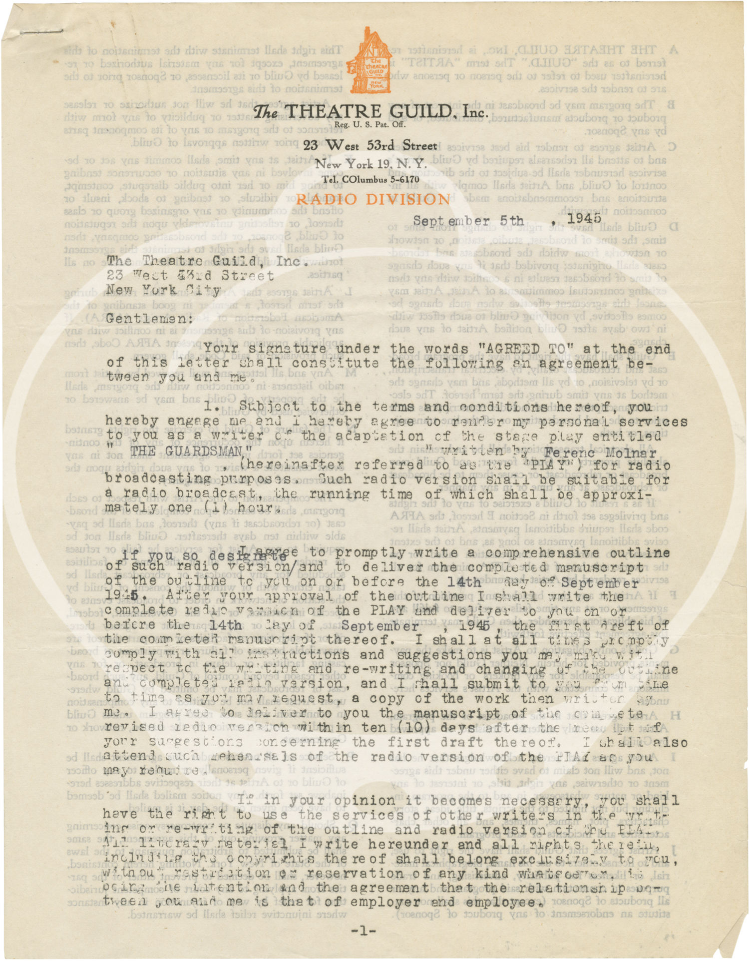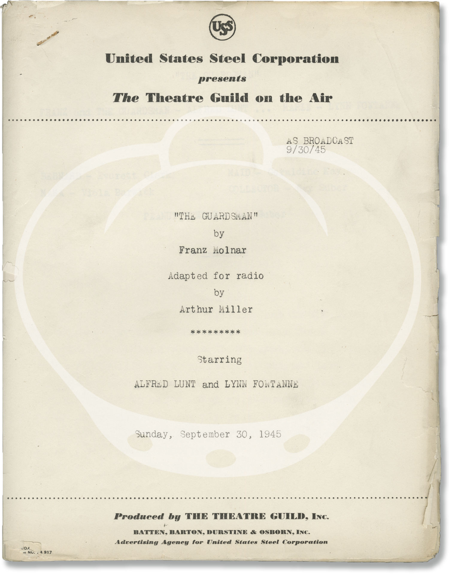 The Theatre Guild on the Air: The Guardsman (Small archive of material relating to the 1945 radio play, including a play script, a Theatre Guild contract signed by Arthur Miller, and an original program for the live performance)