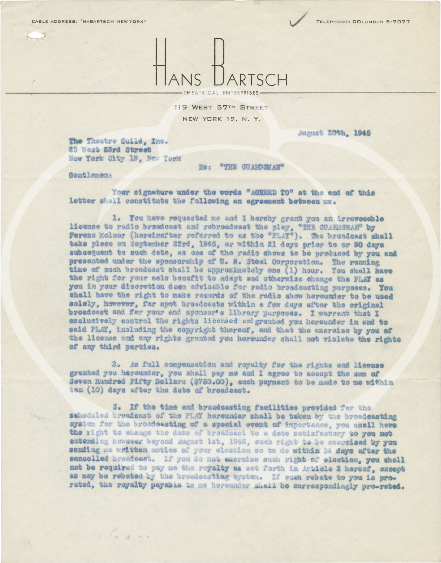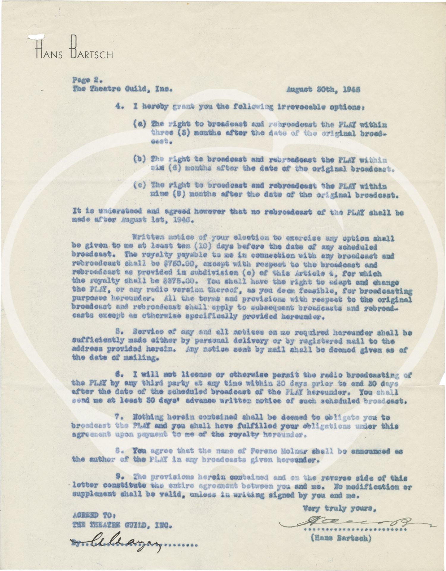 Included with the script are two contracts: one between the Guild and Miller, signed by Miller and dated September 5, 1945, and one between the Guild and royalty holder Hans Bartsch, signed by Bartsch and dated August 30, 1945. Additionally included with the script is an original program given to the studio audience for the radio performance, dated September 30, 1945.