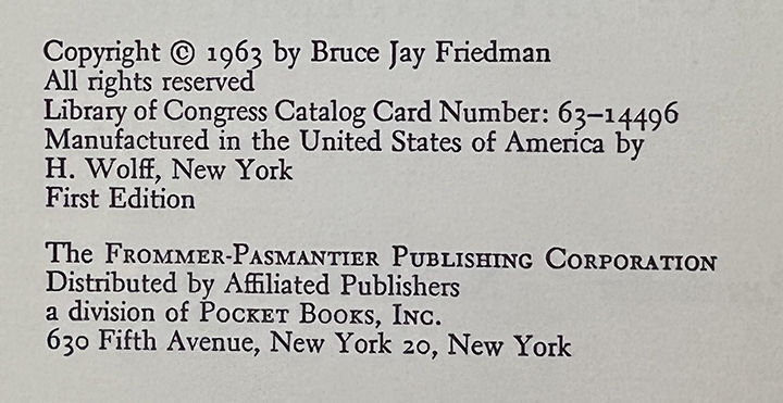 New York: Alfred A. Knopf, 1963. First Edition. Hardcover. Near Fine/Very Good. Near Fine in a Very Good jacket, unclipped ($4.50), rubbed at the edges, a bump at the front panel. Quarter brown cloth with black paper on the boards. Square and firmly bound with a yellow top stain, clean internally. Friedman's first collection of short stories that deals with "the foibles and emotional climate of present-day America.