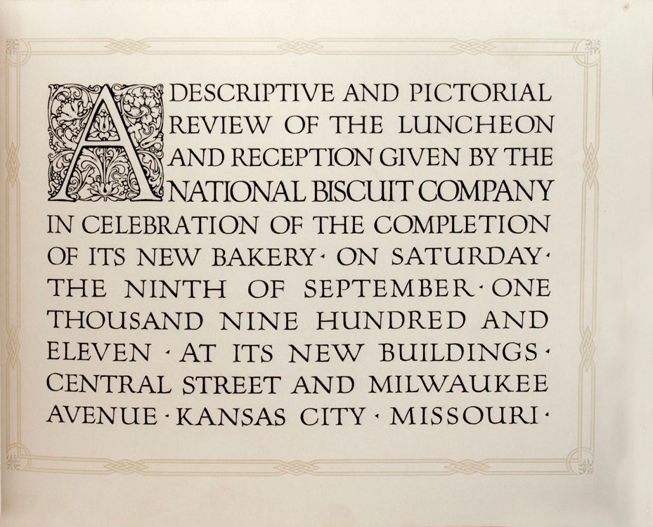 A Descriptive and Pictorial Review of the Luncheon and Reception given by the National BIscuit Company in celebration of the completion of its new bakery, on Saturday, the ninth of September, one thousand nine hundred and eleven, at its new buildings, Central Street and Milwaukee Avenue, Kansas City, Missouri