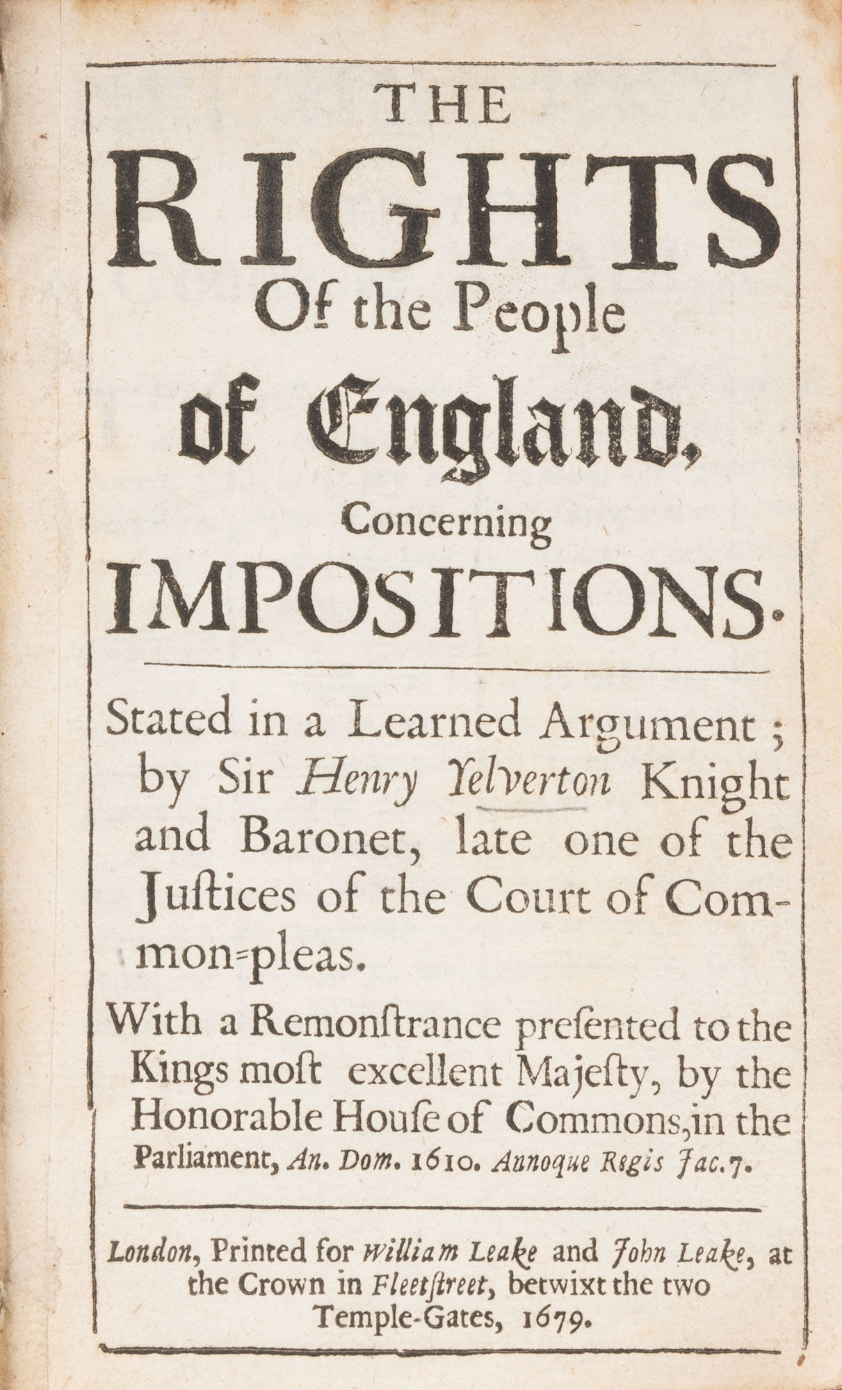 1679. The Complement of Coke's Theory of the Supremacy of the Law" Yelverton, Sir Henry [1566-1629]. [Whitelocke, Sir James (1570-1632)]. The Rights of the People of England, Concerning Impositions. Stated in a Learned Argument; By Sir Henry Yelverton Knight and Baronet, Late one of the Justices of the Court of Common-Pleas. With a Remonstrance Presented to the Kings Most Excellent Majesty, By the Honorable House of Commons, In the Parliament, An. Dom. 1610. Annoque Regis Jac. 7. London: Printed for William Leake and John Leake, 1679. [xiv], 117, [3] pp. With 2 pp. publisher catalogue. Octavo (5-1/2" x 3-1/4"). Contemporary sheep, blind rules to boards, blind fillets to spine, blind tooling to board edges, pastedowns loose. Light rubbing and a few small spots and scratches to boards, moderate rubbing to extremities, front board starting slightly at head but secure, chip to head of spine, hinges cracked, faint offsetting to endleaves, front endleaves starting at head but secure, recent brief annotations in pencil to one of them. Light toning to interior, very light foxing and soiling to a few leaves, light worming to upper left corner of text block beginning on p. 63, minor loss to text in places but no loss to legibility. $750. * Final edition. "Coke's views as to the supremacy of the law have become a dogma of our modern law of the constitution. But, taken by itself, this dogma was not sufficient. The modern state needed a more active sovereign. The Royalists found such a sovereign in the king. If, therefore, the need for a sovereign power in the constitution was admitted, and if Parliament denied the sovereignty of the king, it must be prepared too find a substitute. Some of the Parliamentary party, no doubt, appreciated this need. But the first to elaborate a theory to meet it was James Whitelock. In the debate upon impositions in 1610, [later reprinted as The Rights of the People], he propounded a theory of Parliamentary sovereignty, which was the complement of Coke's theory of the supremacy of the law. It has become, like Coke's theory, an accepted principle of our modern constitutional law; and it is historically important because it is the earliest complete and formal statement of this principle" (Holdsworth). This essay was issued in 1641 and 1658 under different titles and without Yelverton's name. All three pri.