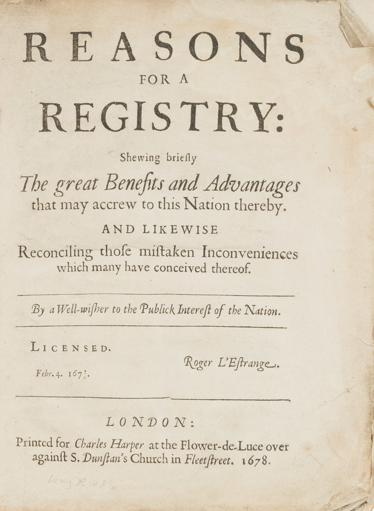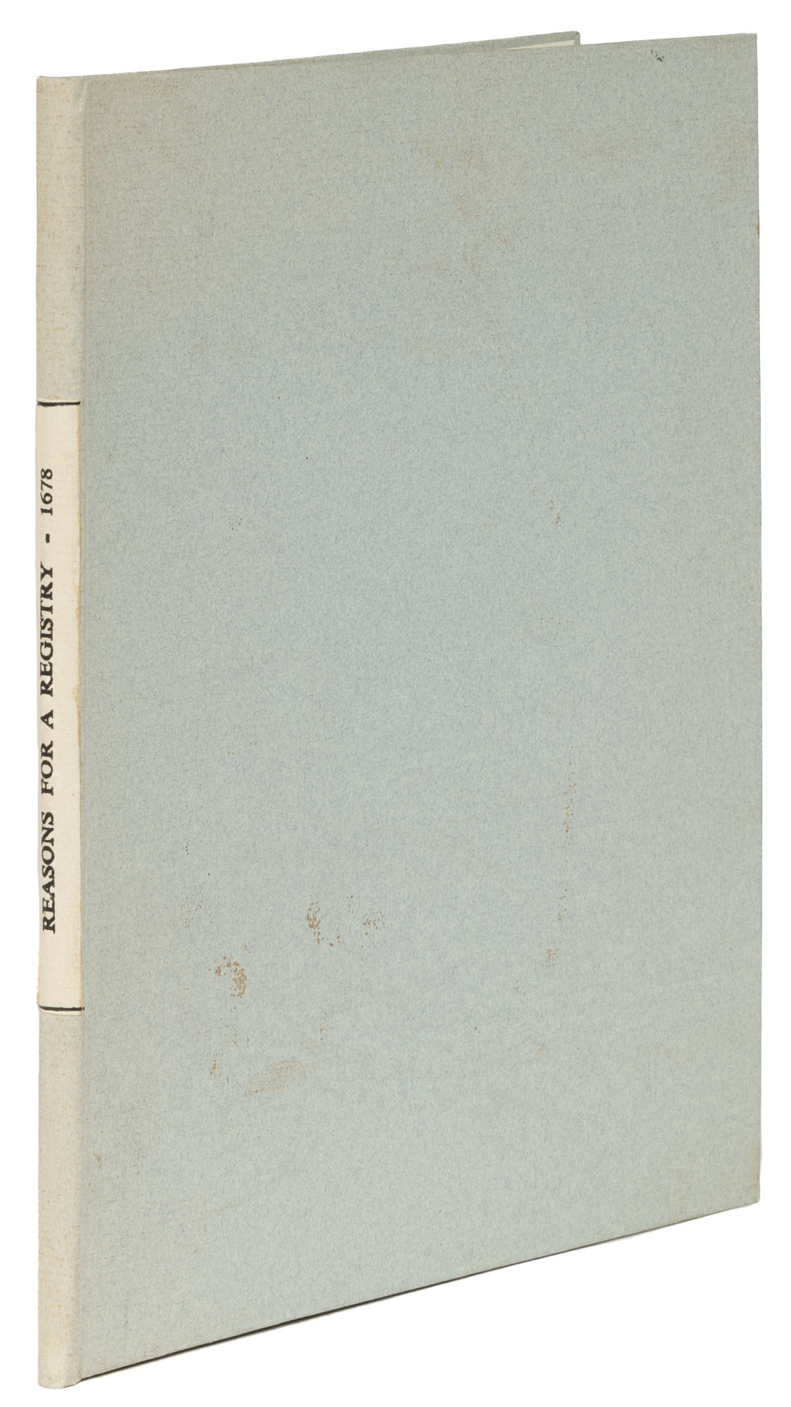 1678. An Early Argument for Universal Land Registration A Well-Wisher. Reasons for a Registry: Shewing Briefly the Great Benefits and Advantages That May Accrew to This Nation Thereby. And Likewise Reconciling Those Mistaken Inconveniences Which Many Have Conceived Thereof. By a Well-Wisher to the Publick Interest of the Nation. London: Printed for Charles Harper, 1678. [viii], 22, [2] pp. First and final leaves blank; publisher advertisements to foot of p. 22. Quarto (8-1/4" x 6-1/4"). Stab-stitched pamphlet bound into recent paper-covered boards, typed paper label to spine, fore and bottom edges untrimmed. Light toning and soiling to boards, light fading to spine. Moderate toning and light creasing to interior, occasional light foxing and soiling, faint dampstaining to first and final (blank) leaves. $550. * Only edition. This pamphlet, which advocates universal registration in order to achieve conveyancing security, was an early entry in the spirited and lengthy public debate in Great Britain over the establishment of a general register for titles and deeds. Though the idea was first proposed under Henry VIII, no such register would be created until the passage of the Land Registry Act in 1862, which established a registry of titles (but not deeds). The system created by the act was voluntary and largely ineffective; successive attempts at reform failed until the Land Registration Act of 1925. English Short-Title Catalogue R15635.