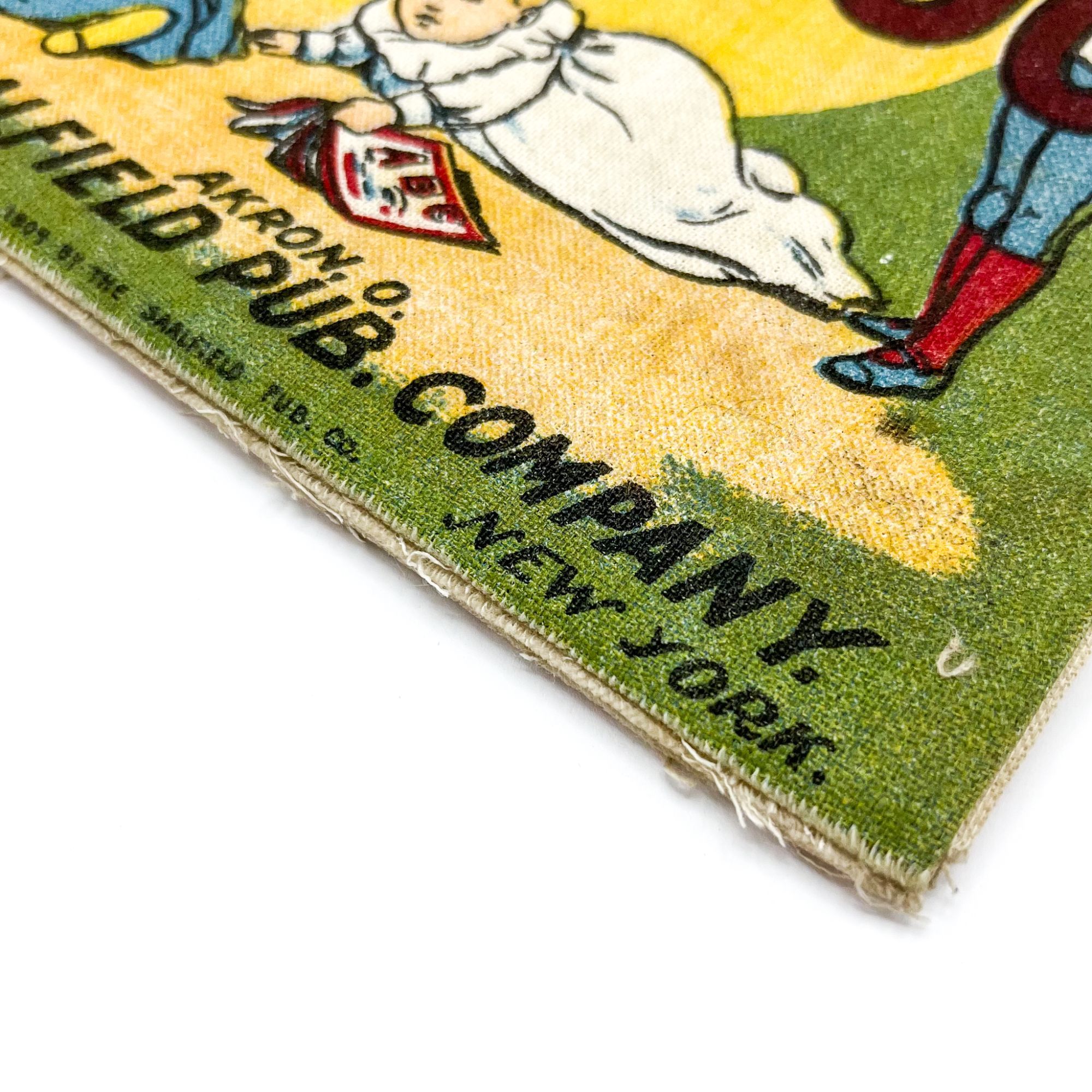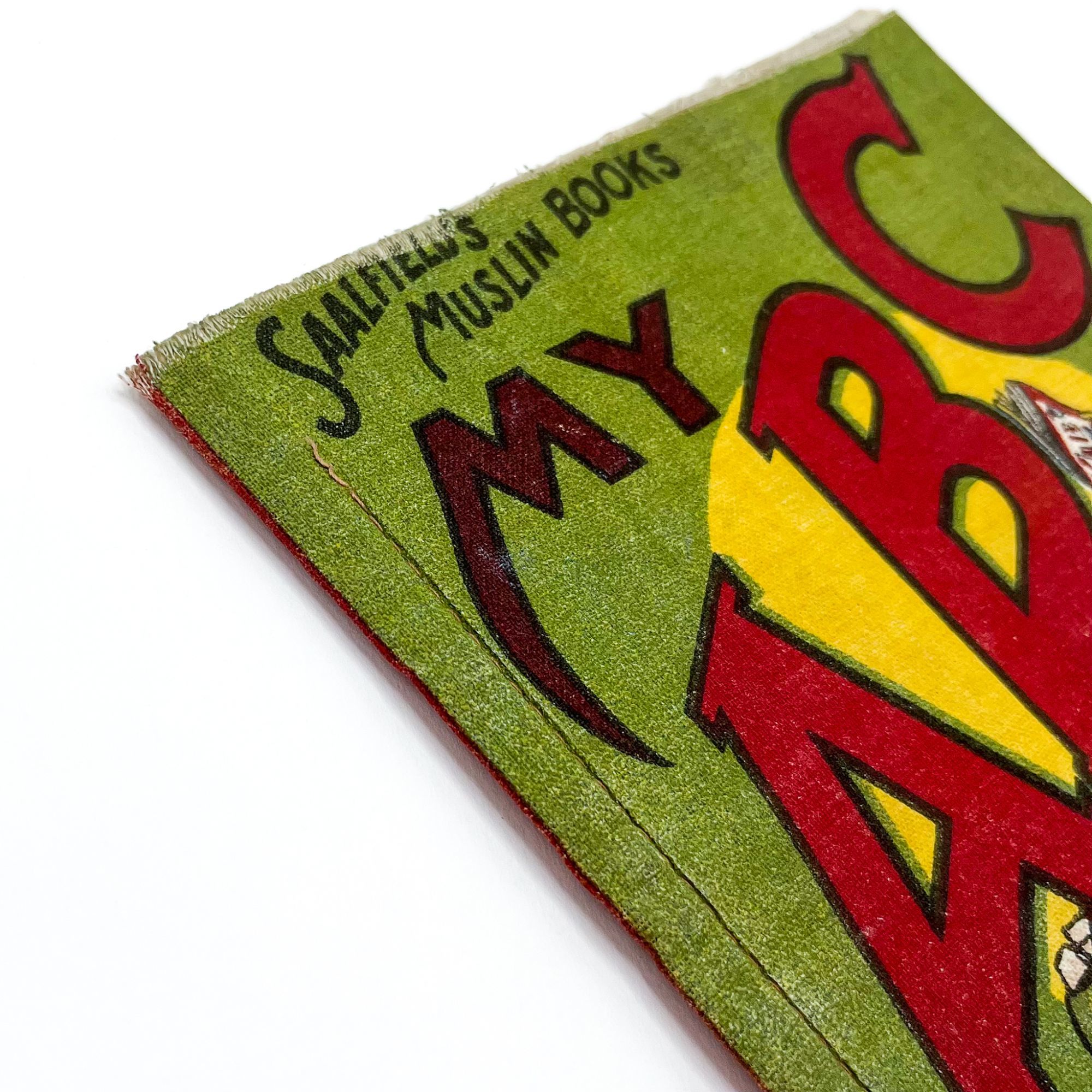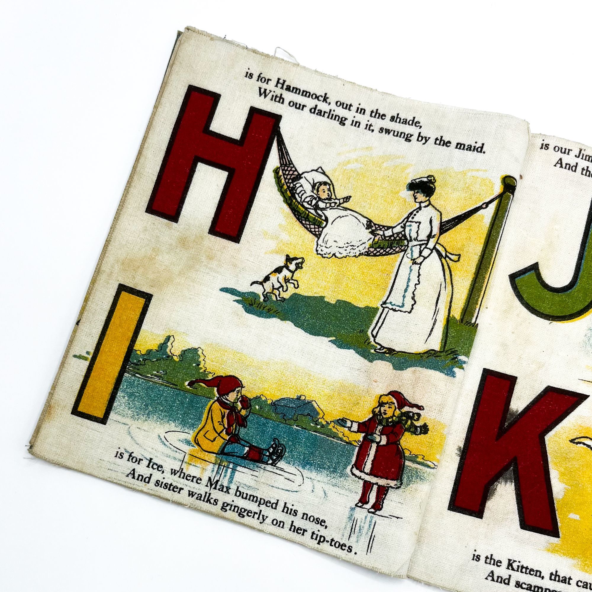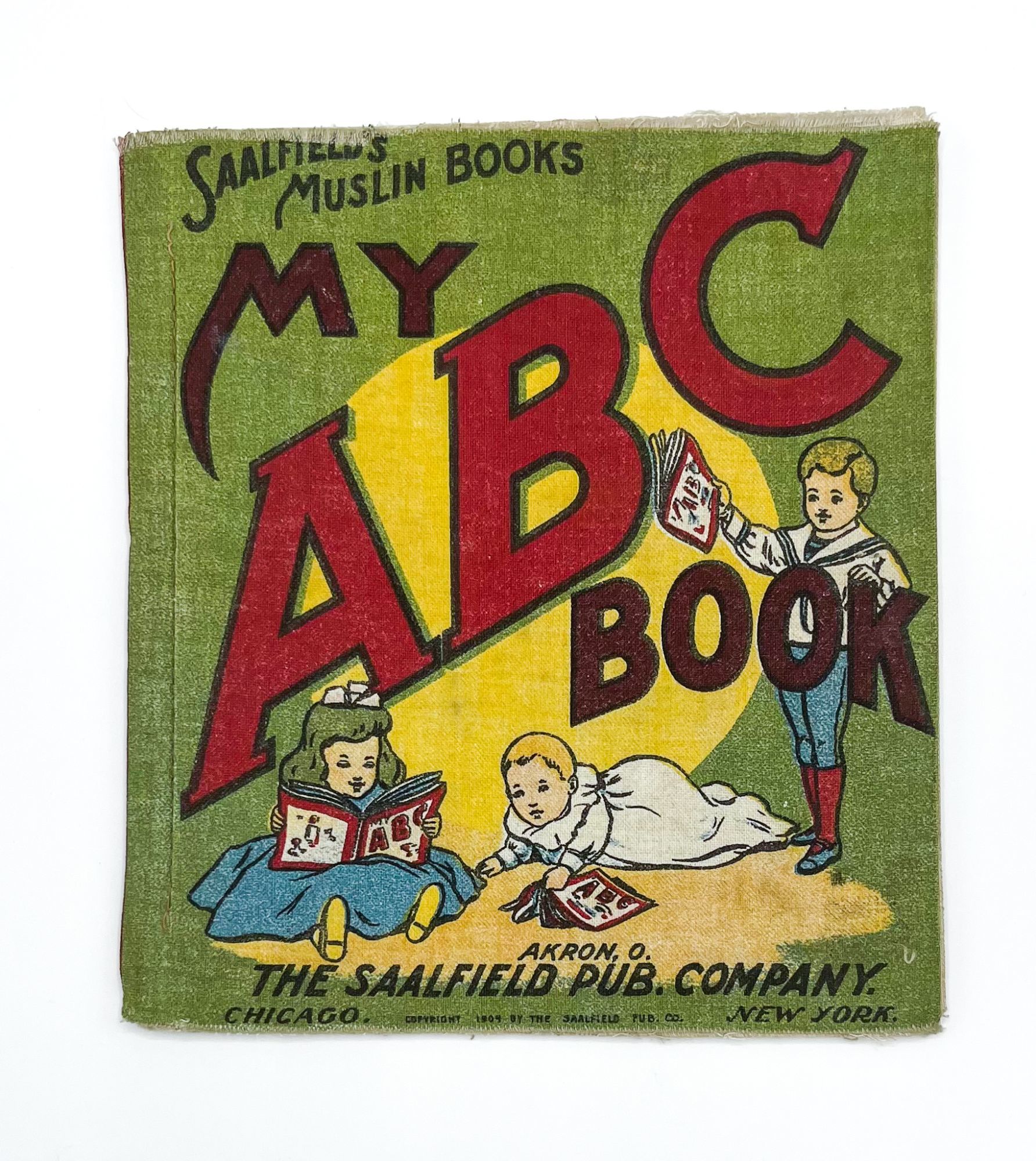 Akron, Ohio / Chicago / New York: The Saalfield Publishing Company, 1904. Very good.. Early 20th-century cloth alphabet book in verse, with images and rhymes associated with affluent families of the period. This line of "Saalfield's Muslin Books" were meant for heavy use by children: "They may be washed and colors will not run, A child can chew them and have lots of fun." "A is for Automobile, so shiny and bright"; "D is for Dandy, a great St. Bernard"; "H is for Hammock, out in the shade, With our darling in it, swung by the maid." 8.75'' x 7.75''. Original linen pictorial wrappers. Illustrated with large color images block letters and rhyming phrases on all leaves. [6] pages, printed one side only, folded at fore-edge and bound at gutter. Some fraying and spots of soil. Binding firm.
