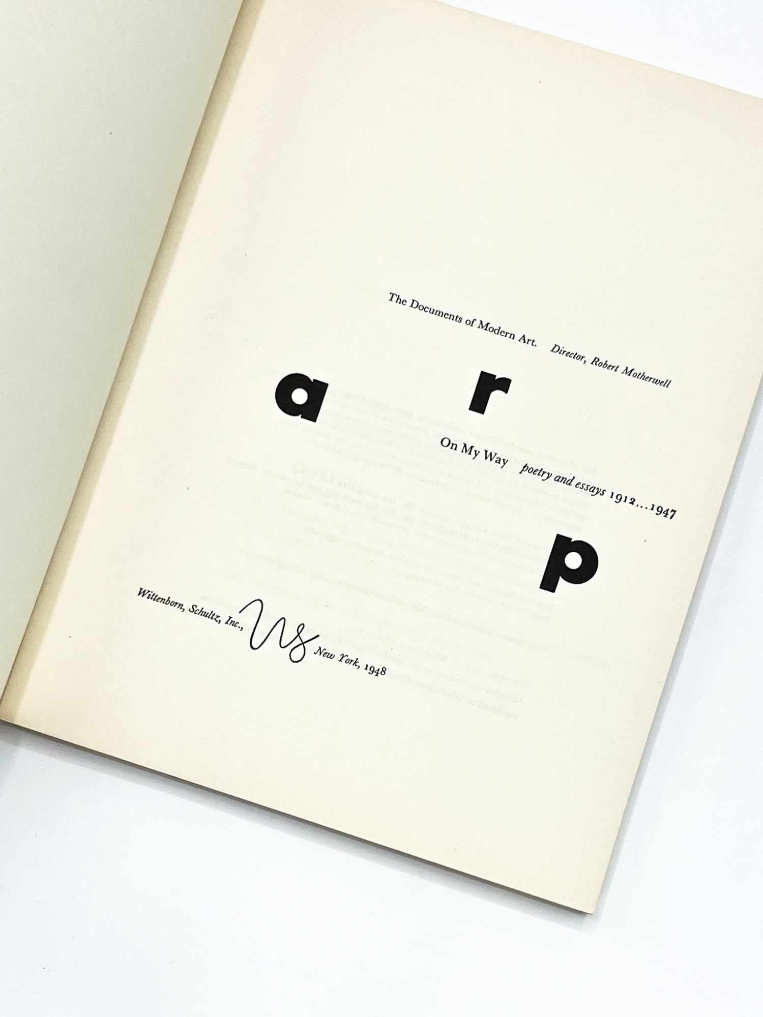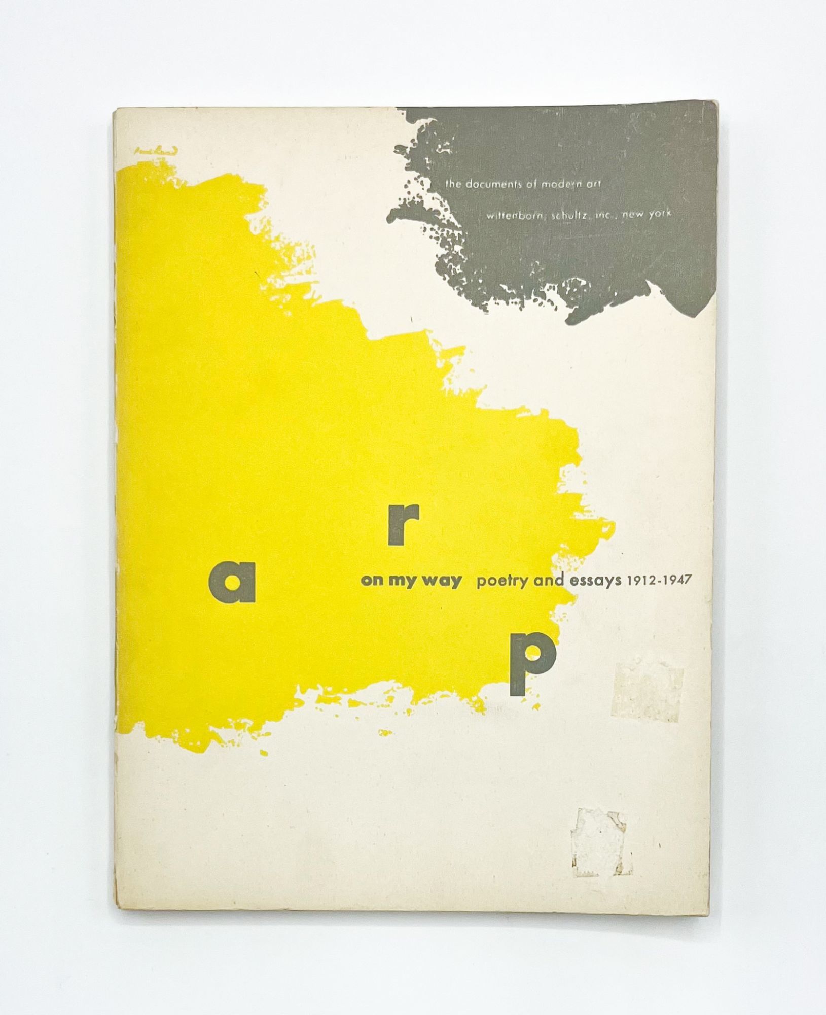 New York: Wittenborn, Schultz, Inc, 1948. First edition. Very good.. Collected writings by the great Dadaist painter and sculptor, with two original woodcuts. The sixth volume in the series "The Documents of Modern Art", directed by Robert Motherwell. In addition to Arp's own writings, ON MY WAY includes a preface by Motherwell and biographical essays by C. Giedion-Welcker and Gabrielle Buffet-Picabia, with a bibliography by Bernard Karpel. 10'' x 7.5''. Original grey and yellow wrappers with cover and typography by Paul Rand. 145, [1] pages. Text in English, French, and German. English translations by Ralph Manheim. Illustrated with 38 black and white plates and two original color woodcuts (frontispiece and insert). Two sticker shadows/scuffs to front cover; moderate edgewear and light toning. Both woodcuts present. Overall bright and sound.