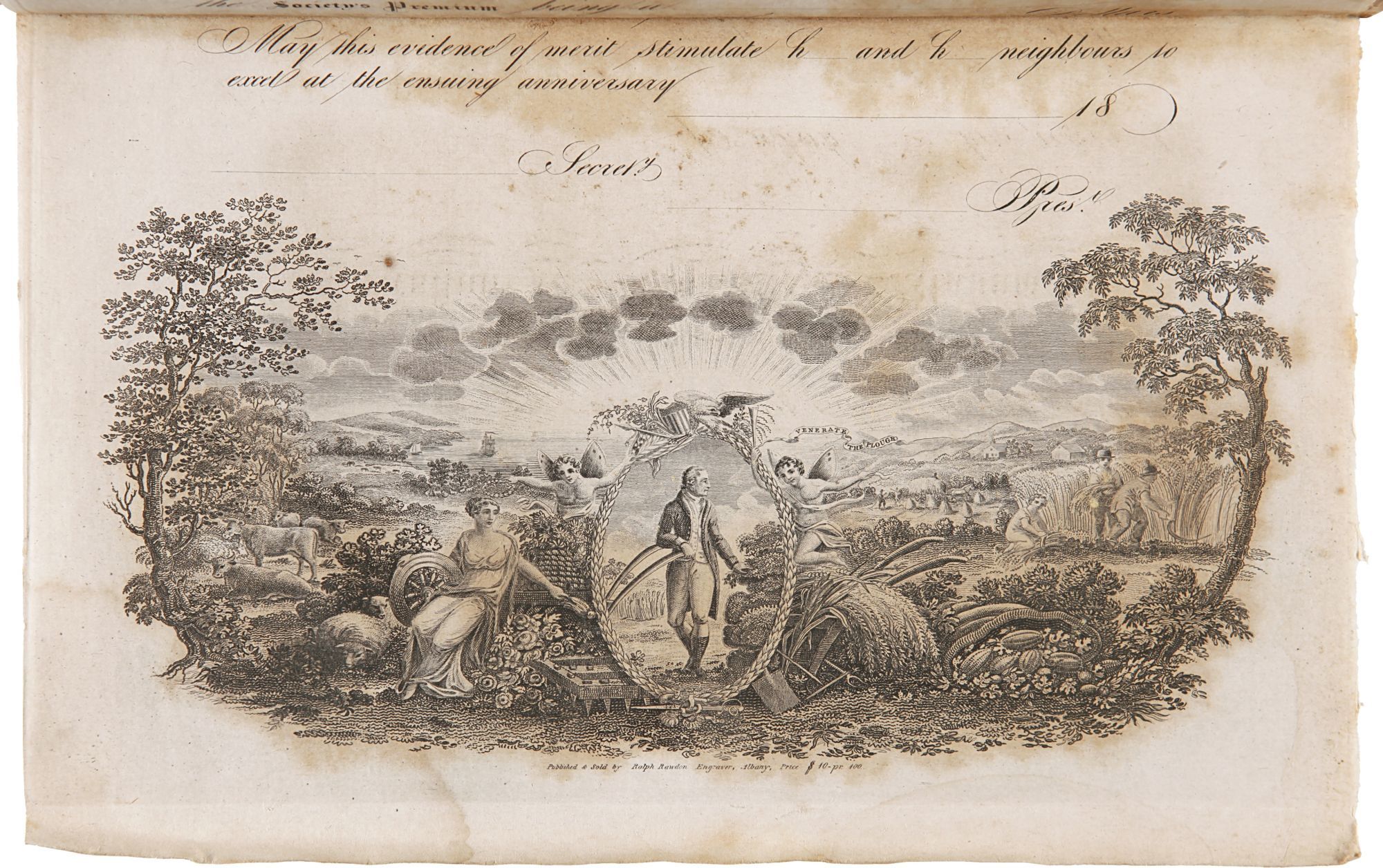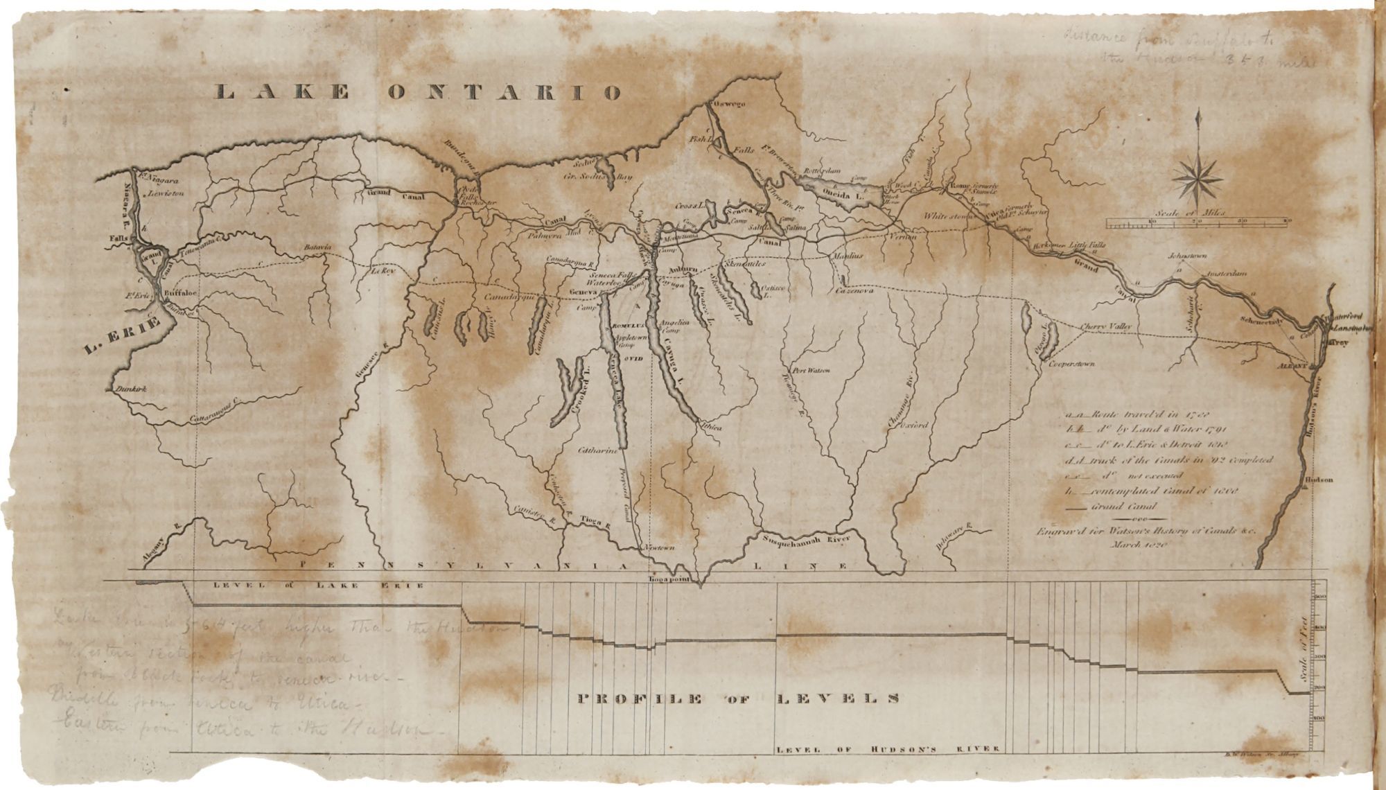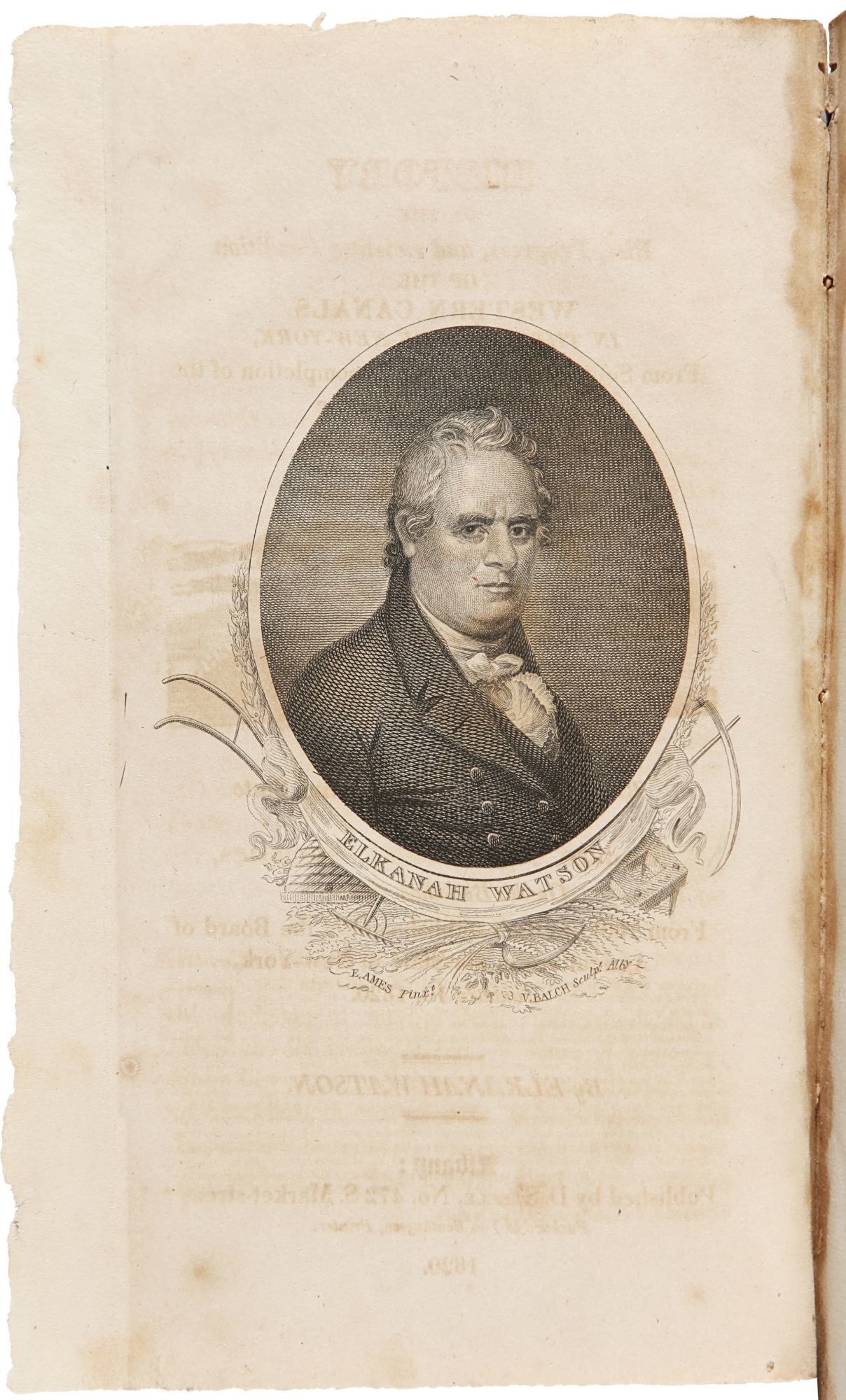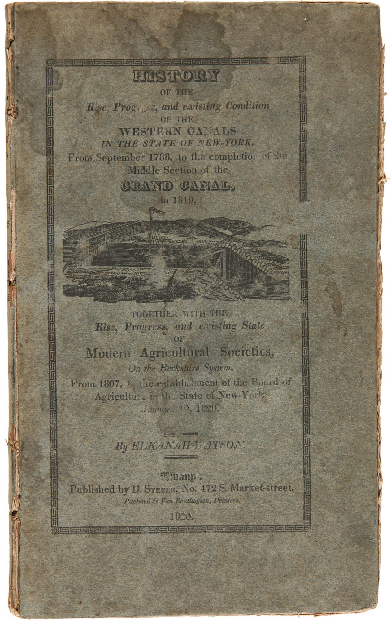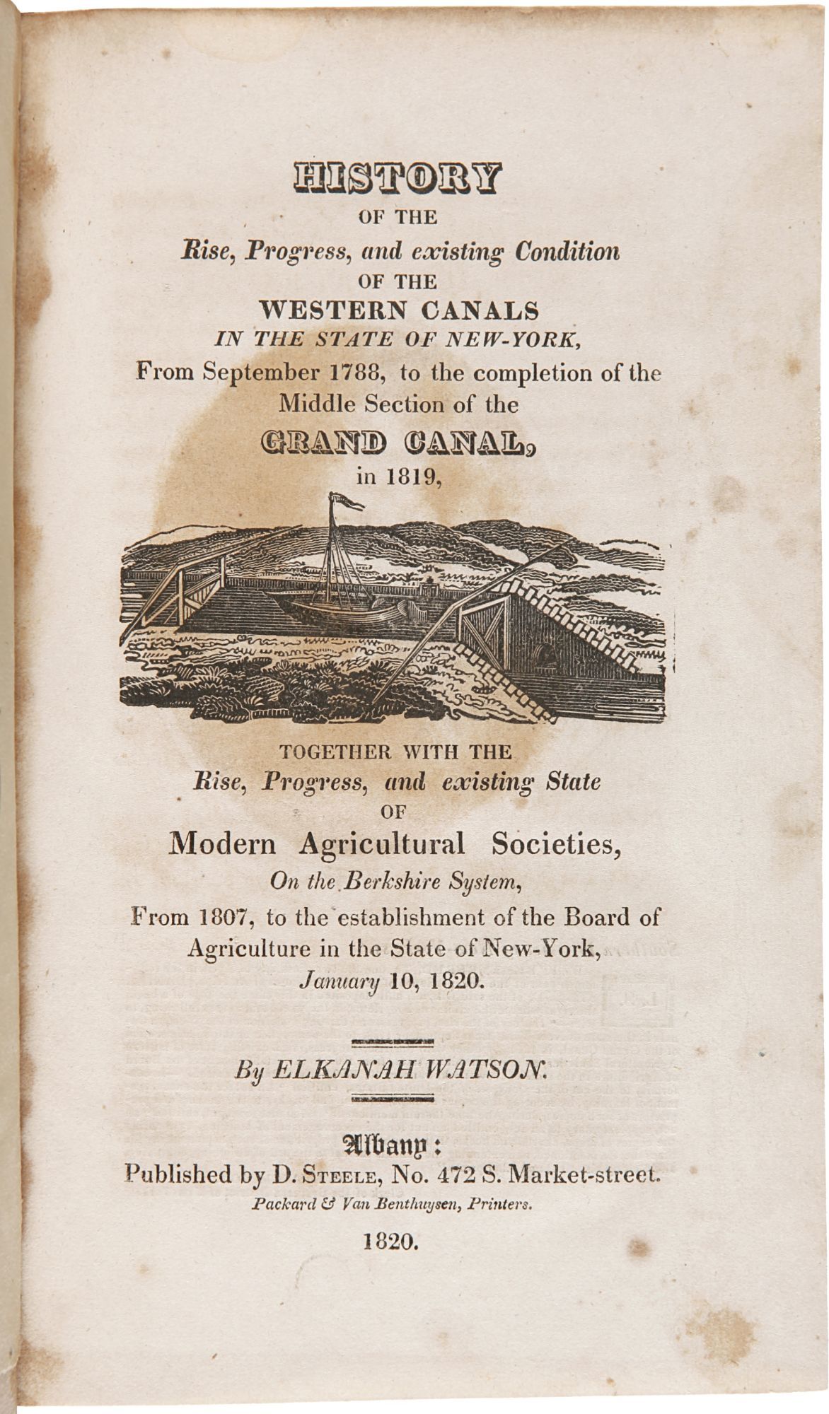 Albany: D. Steele, 1820. [2], 210, [2] pp., plus frontispiece and four plates (two of them double-page) and two maps (one folding). Title-page vignette. 8vo. Original printed paper boards, hinges cracked, rear board nearly detached, paper a bit chipped. Scattered foxing and toning. Still, a good, unsophisticated copy. [2], 210, [2] pp., plus frontispiece and four plates (two of them double-page) and two maps (one folding). Title-page vignette. 8vo. Contains Watson's 1791 journal of his trip to the West, his history of canals, and a long section on the rise of organized agriculture in New York (with its own title-page). The folding map shows the route of the Erie Canal. Rather scarce in the original printed boards. Howes W166; Sabin 102130; American Imprints 4187; Rink 4736