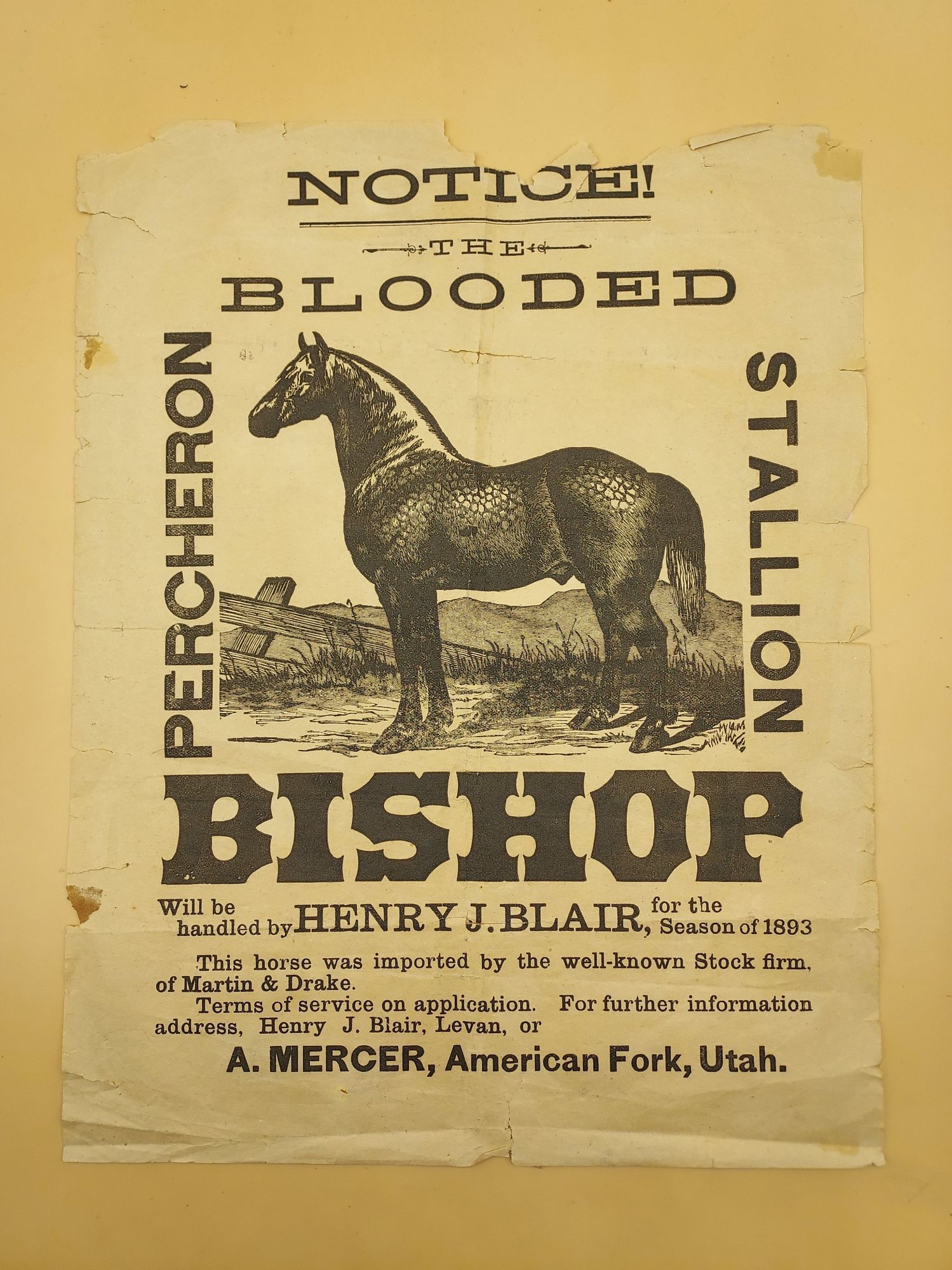 Notice! The Blooded Bishop. Percheron Stallion. Will be handled by Henry J. Blair, for the Season of 1893. This horse was imported by the well-known Stock firm, of Martin & Drake. Terms of service on application. For further information address, Henry J. Blair, Levan, or A. Mercer, American Fork, Utah