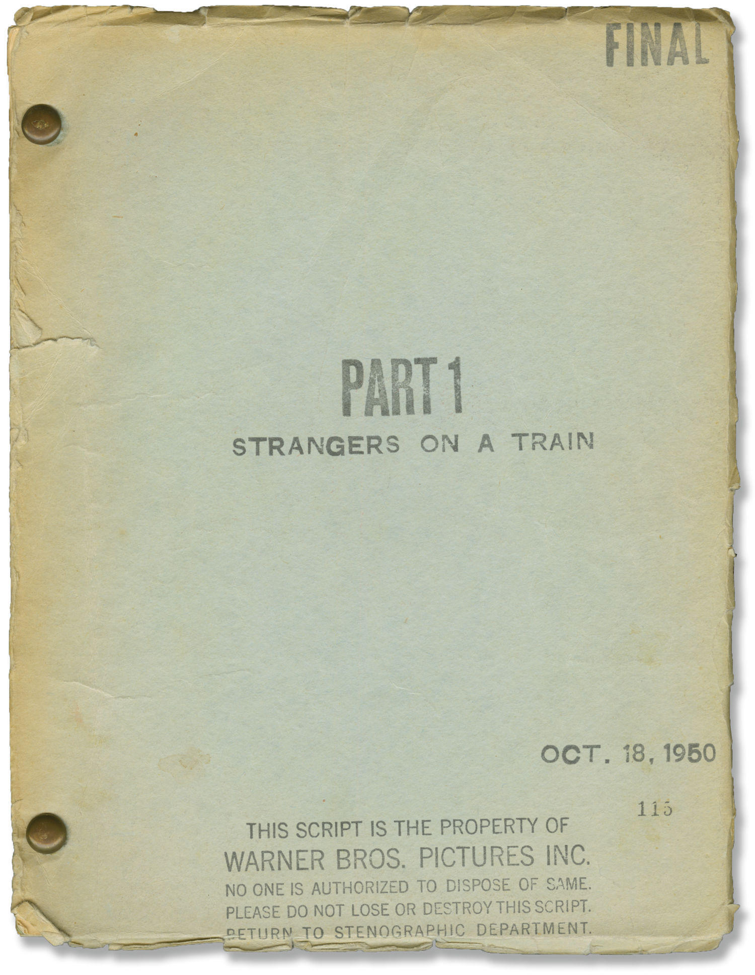 Burbank, CA: Warner Brothers, 1950. Final Draft script for the 1951 film, dated October 18, 1950. Although the front wrapper and the first distribution page identify the script as Part I, the script presented here is the complete Final Draft divided into four parts (Parts I-IV), each with its own distribution page. Laid in are twelve call sheets, dating from October 31, 1950 through December 23, 1950, with all but one heavily annotated in manuscript pencil.
