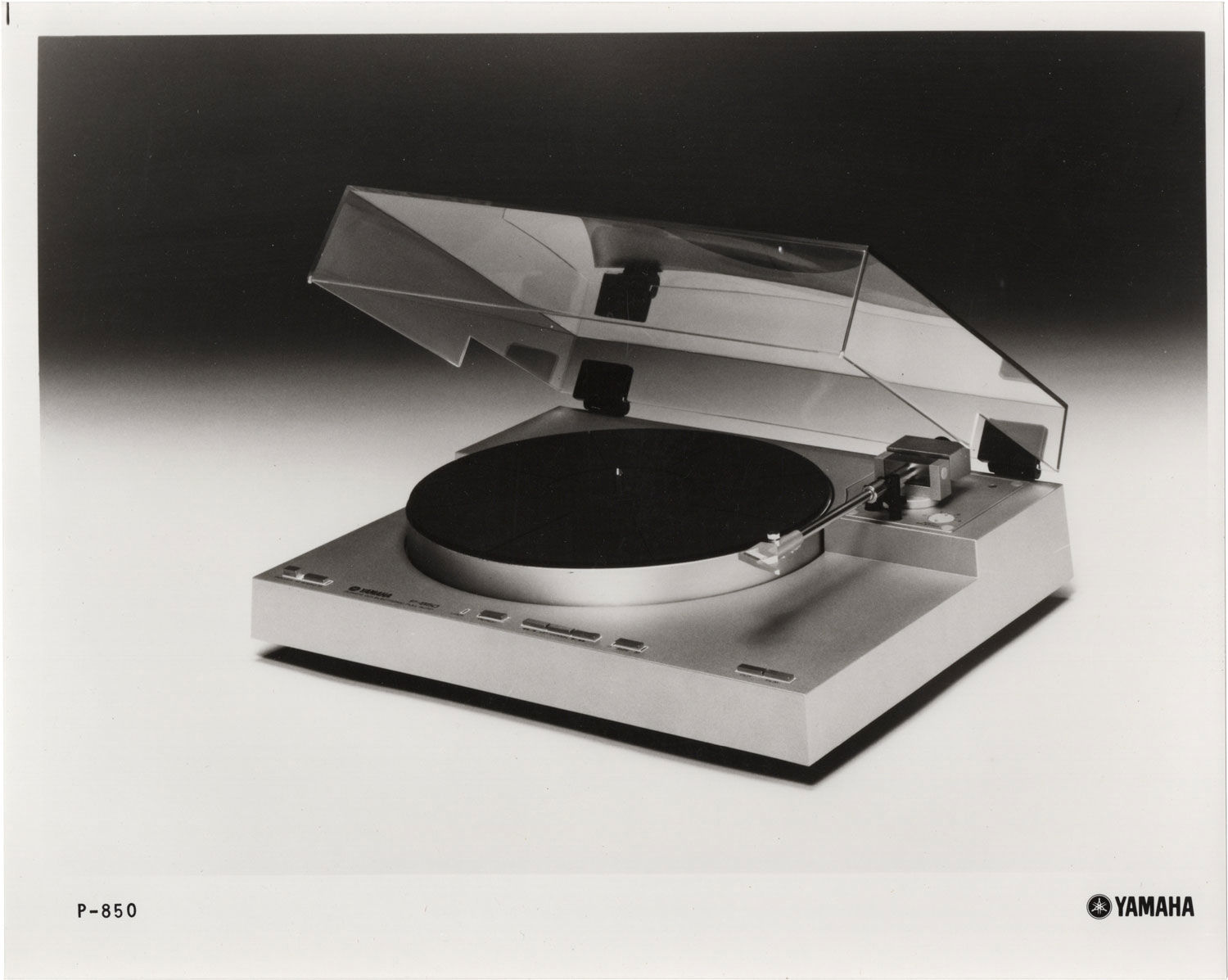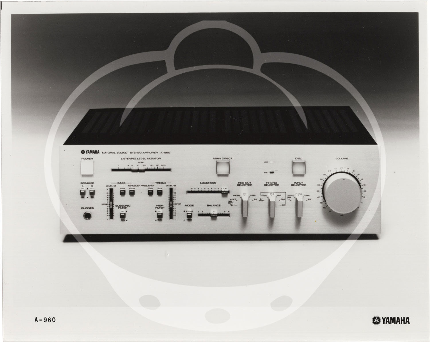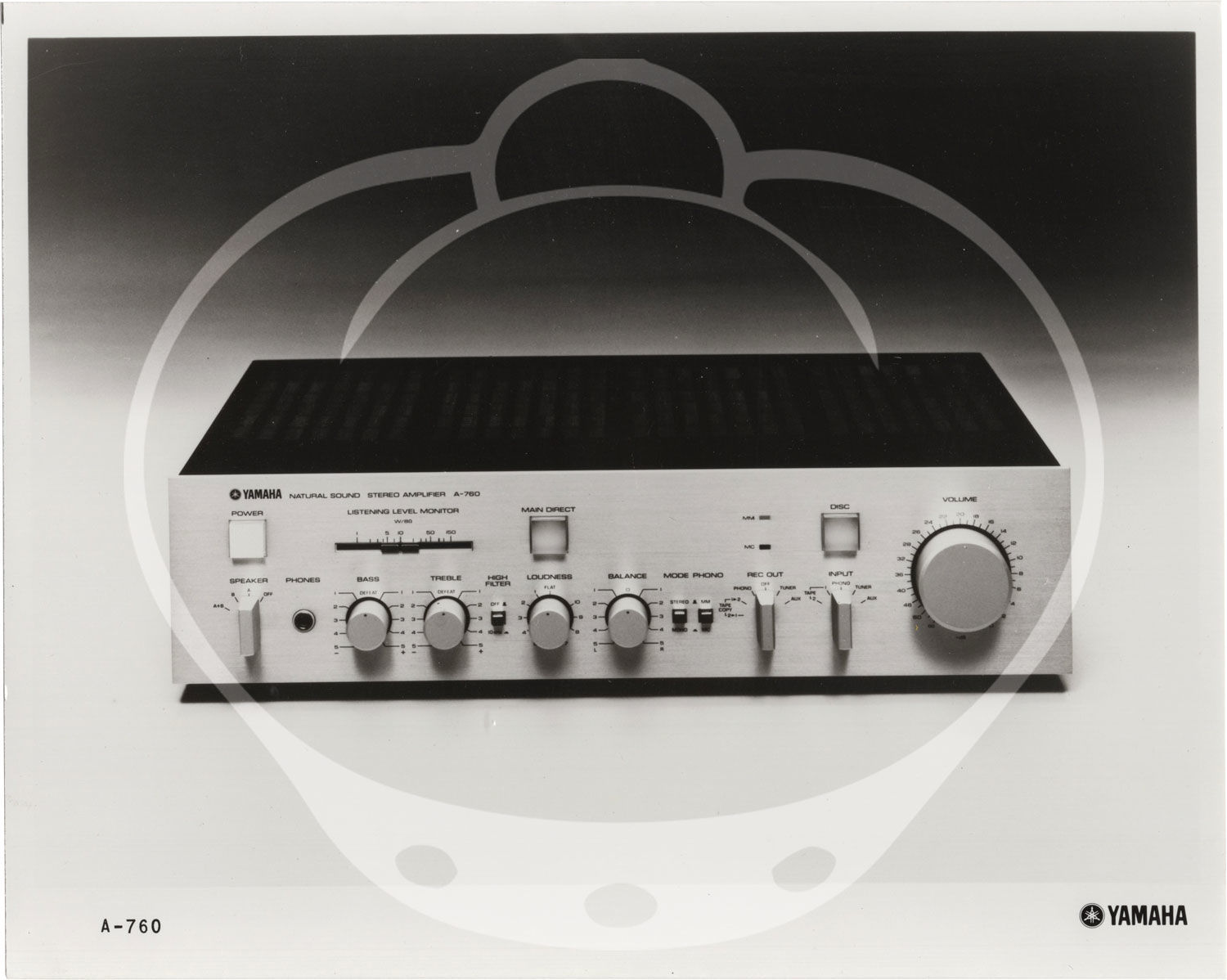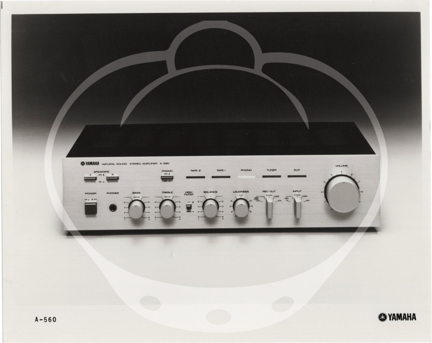 N.p.: Yamaha Corporation, 1982. Seventeen vintage photographs of Yamaha "Natural Sound" home audio equipment, circa 1981-1982. Seventeen promotional product photographs, issued by Yamaha Corporation, showcasing six receivers, five amplifiers, four tuners, a turntable, and a cassette tape deck, all with Yamaha's period design, featuring Yamaha's signature "Natural Sound," with silver and black brushed stainless steel, l.e.d. displays, and then state of the art circuit boards. All of the products found here were manufactured by Yamaha between 1980 and 1983, with 1981 and 1982 being the only years all seventeen products were being manufactured, likely their entire line of home audio equipment offered.
